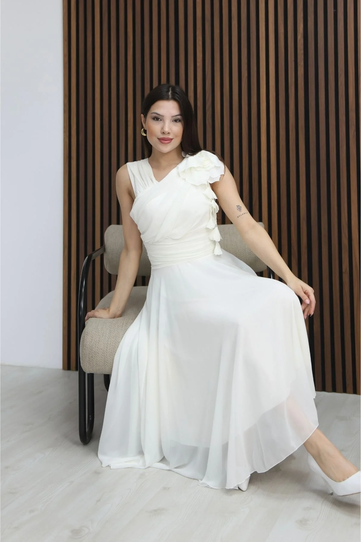 Asimetrik Yaka Çiçek Detaylı Büzgülü Şifon Midi Elbise , asimetrik yaka formu ve omuzdaki çiçek detayı tasarıma zarif bir vurgu katarken, bel kısmındaki büzgüler silueti dengeli ve ince gösterir. Uçuşan midi boy eteği sayesinde her adımda yumuşak ve etkileyici bir hareket sağlar. Davet, söz ve özel organizasyonlarda zarif bir şıklık arayanlar için ideal bir seçimdir.