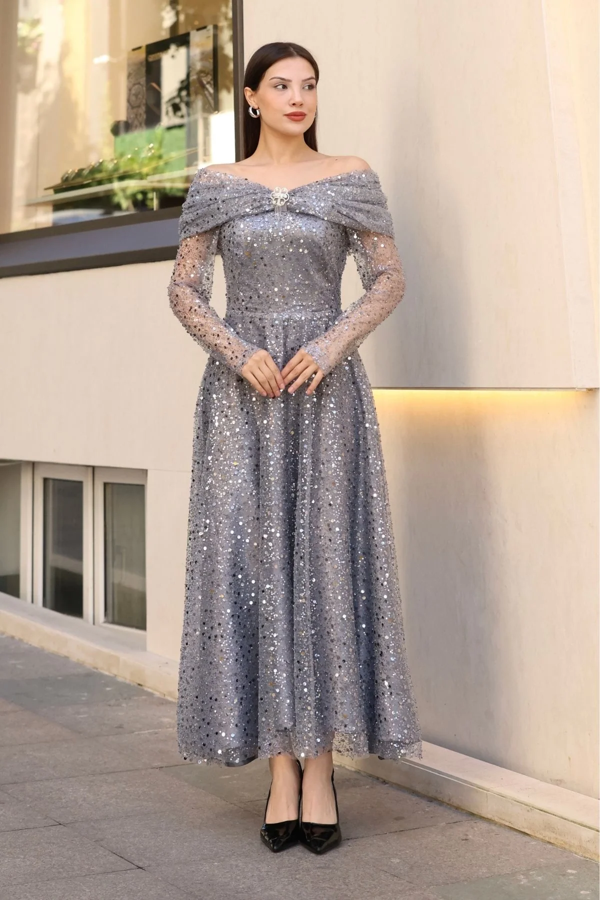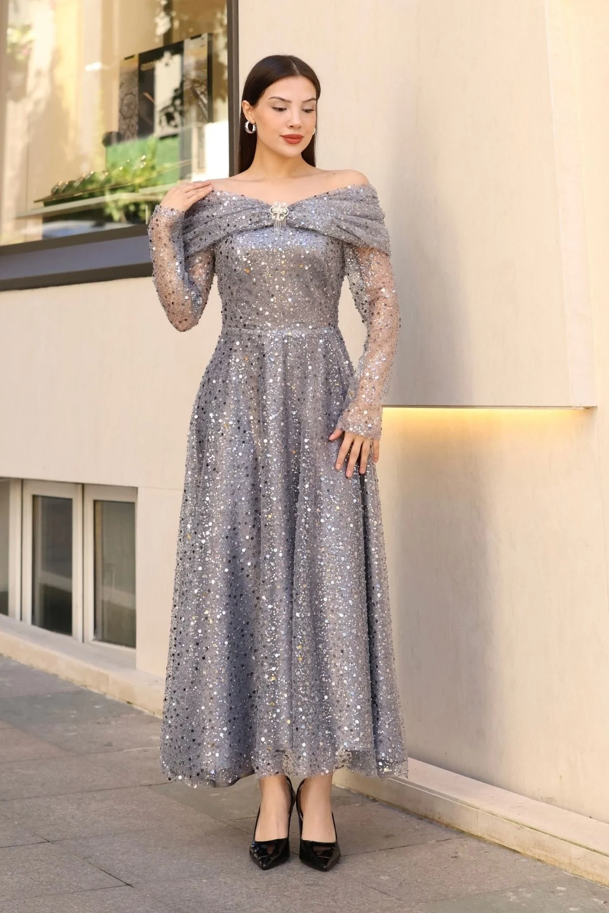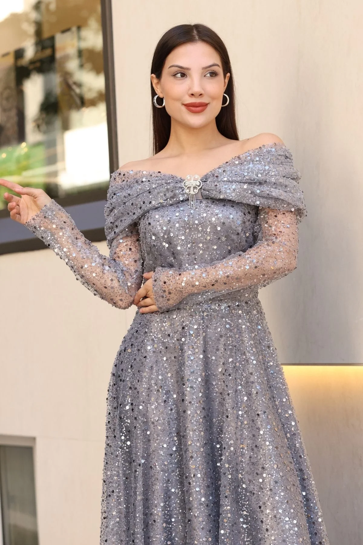 Aşkın Büyüsü Abiye Elbise 6054-Gri