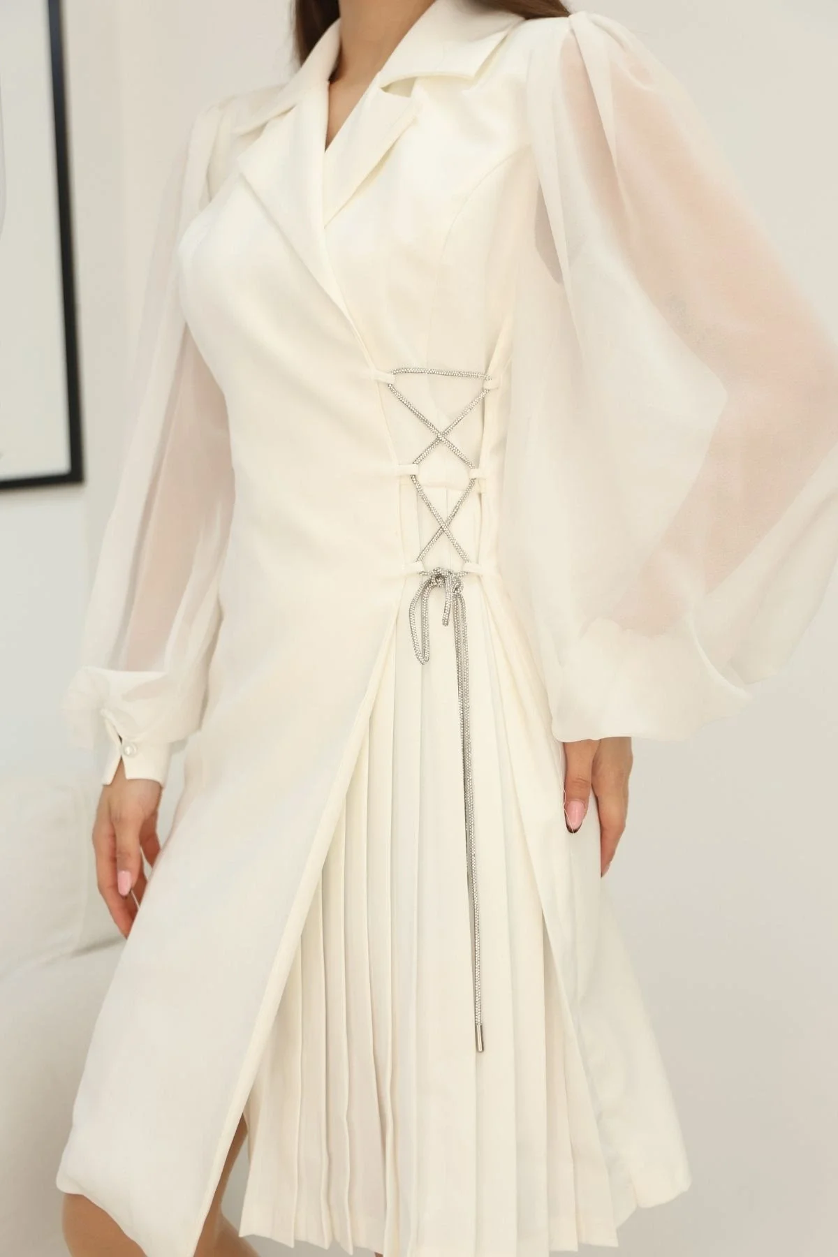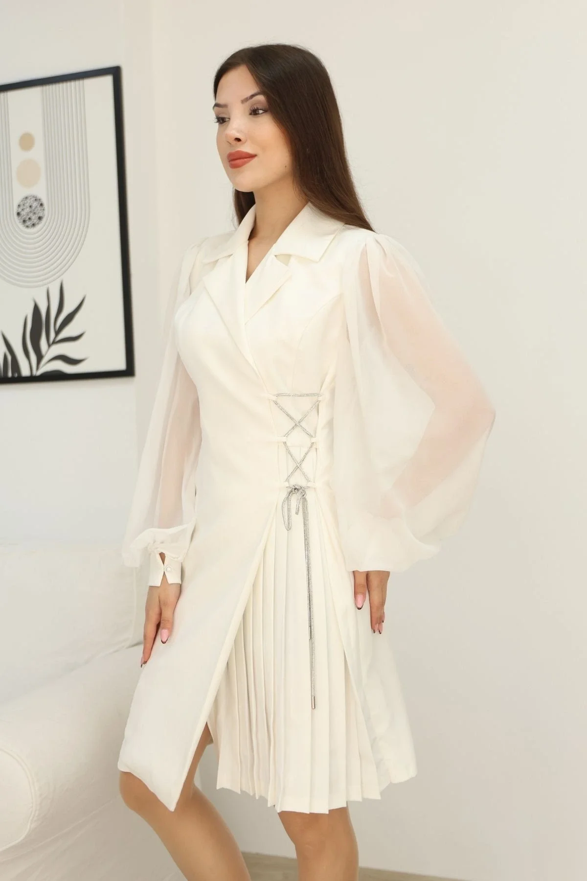 Bağlama Detaylı Piliseli Elbise 2324-Beyaz