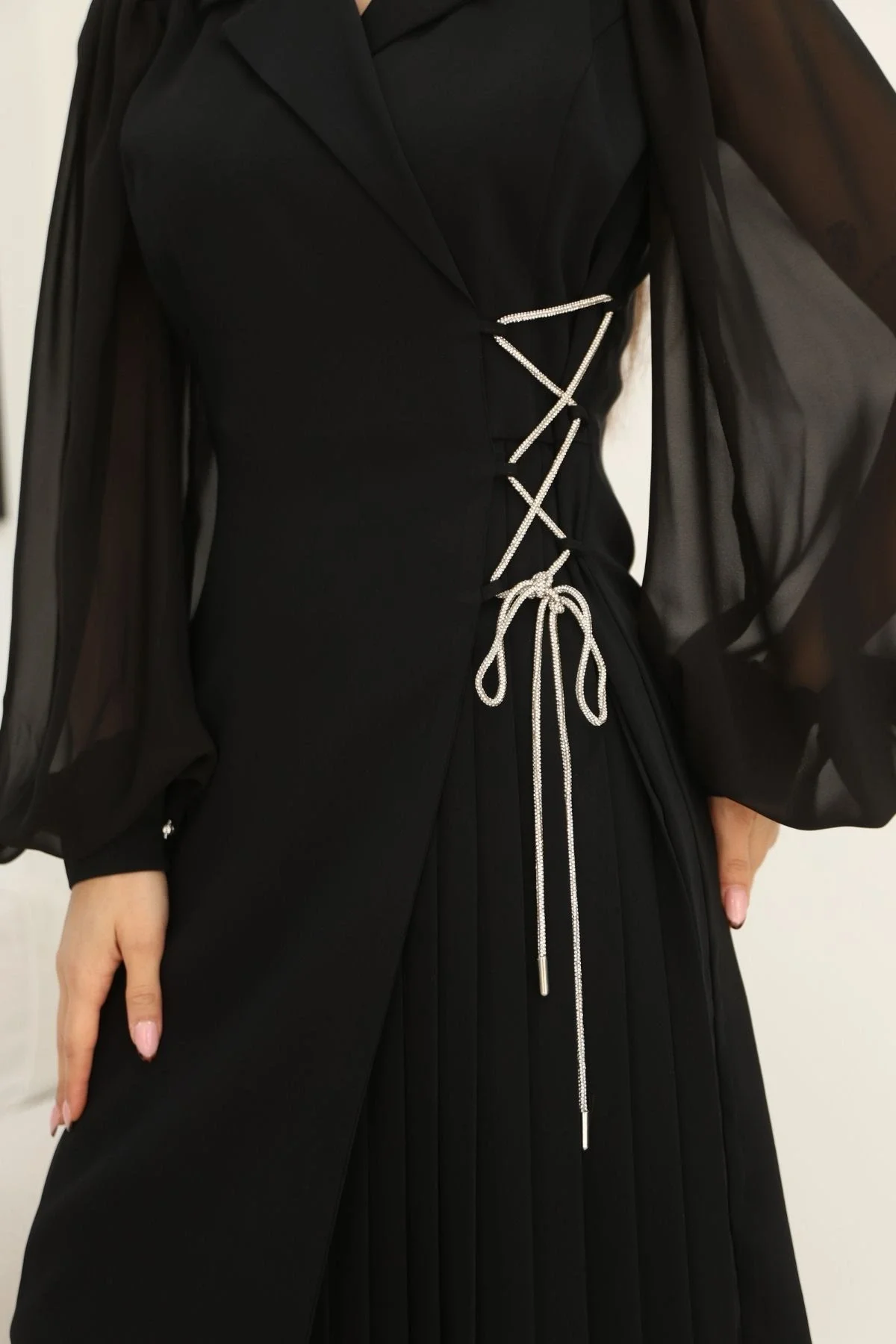 Bağlama Detaylı Piliseli Elbise 2324-Siyah