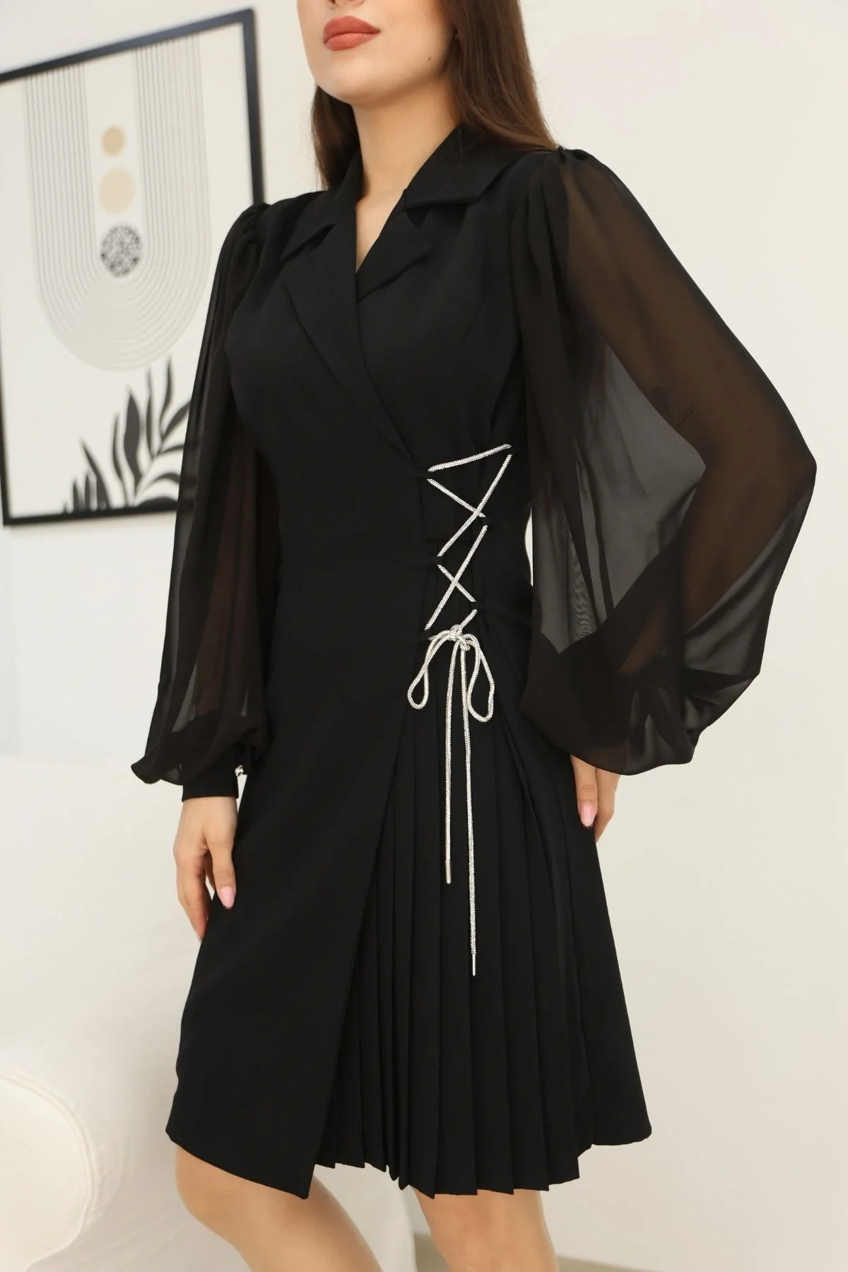 Şık tasarımı ve dikkat çekici detaylarıyla öne çıkan Bağlama Detaylı Piliseli Elbise, farklı detaylarıyla özel günlerden ofis şıklığına kadar her stile uyum sağlar. Ön kısmındaki ceket yaka tasarım elbiseye zarif bir duruş kazandırırken, kollarındaki şifon balon kol detayı feminen ve hafif bir görünüm sunar. Bel kısmındaki ışıltılı bağlama detayı, vücudu daha ince ve formda gösteren bir siluet oluşturur. Etek bölümündeki pilise hareketi ise modern, zarif ve akıcı bir duruş sağlar.