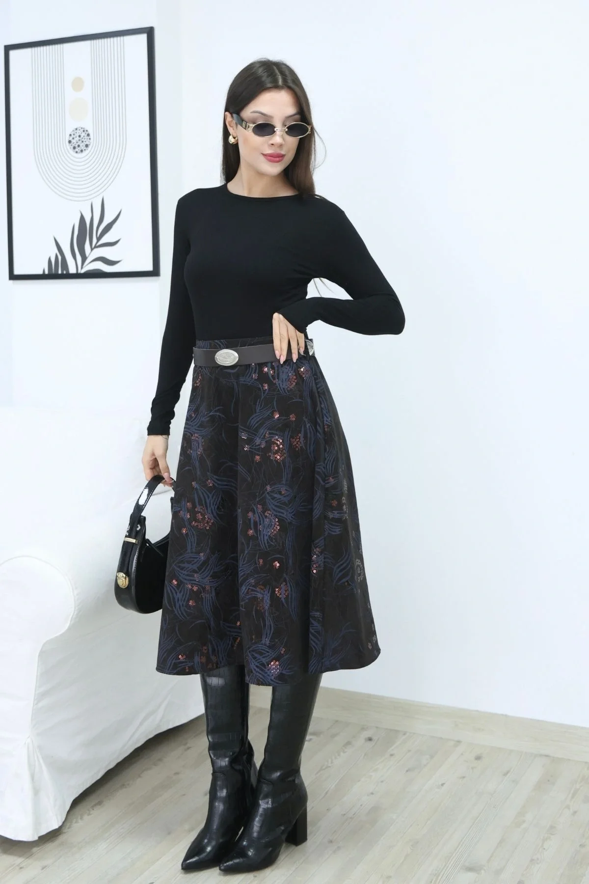 Baskılı ve Kemerli Kadife Etek 6069-Kahve/İndigo