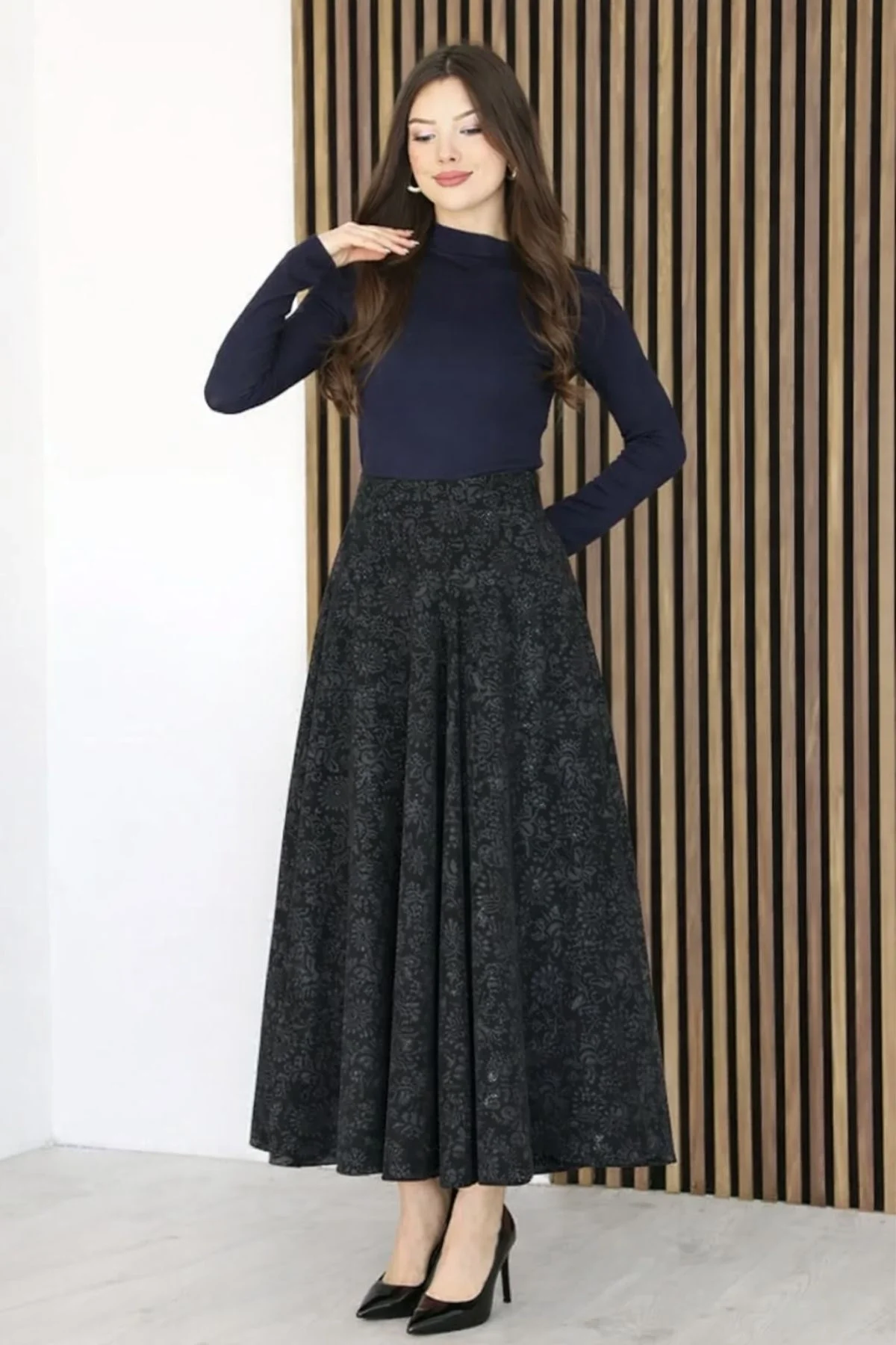 Bu eteği özel kılan en büyük detay, özel üretim kadife dokulu kumaşı ve ışıltılı payet süslemeleri.. Benzersiz deseni ve seçkin dokusu sayesinde sıradan bir kloş etekten çok daha fazlasını sunar. Tok yapısı sayesinde formunu korur, vücuda güzel oturur ve hareket ettikçe zarif bir döküm sağlar. Günlük şıklıkta da, özel davet kombinlerinde de iddialı ve modern bir görünüm elde etmenize yardımcı olur. Payet ve baskı detayları dayanıklı yapıdadır, kullanım ve yıkama konforu sağlar.