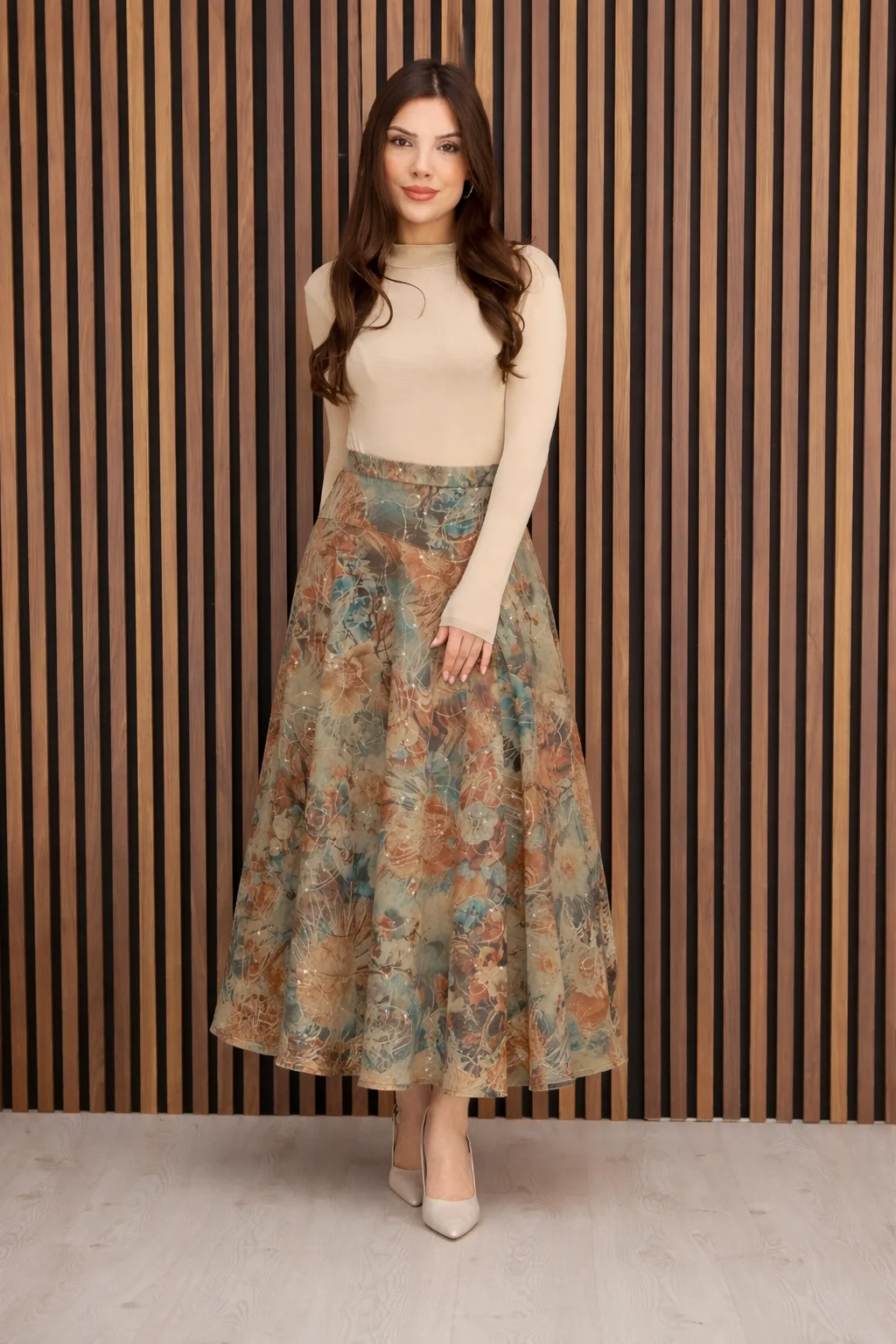 Baskılı ve Payetli Kadife Uzun Kloş Etek 6079-Taba/Çok Renkli