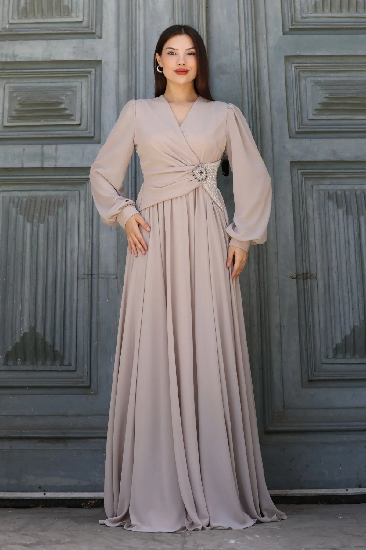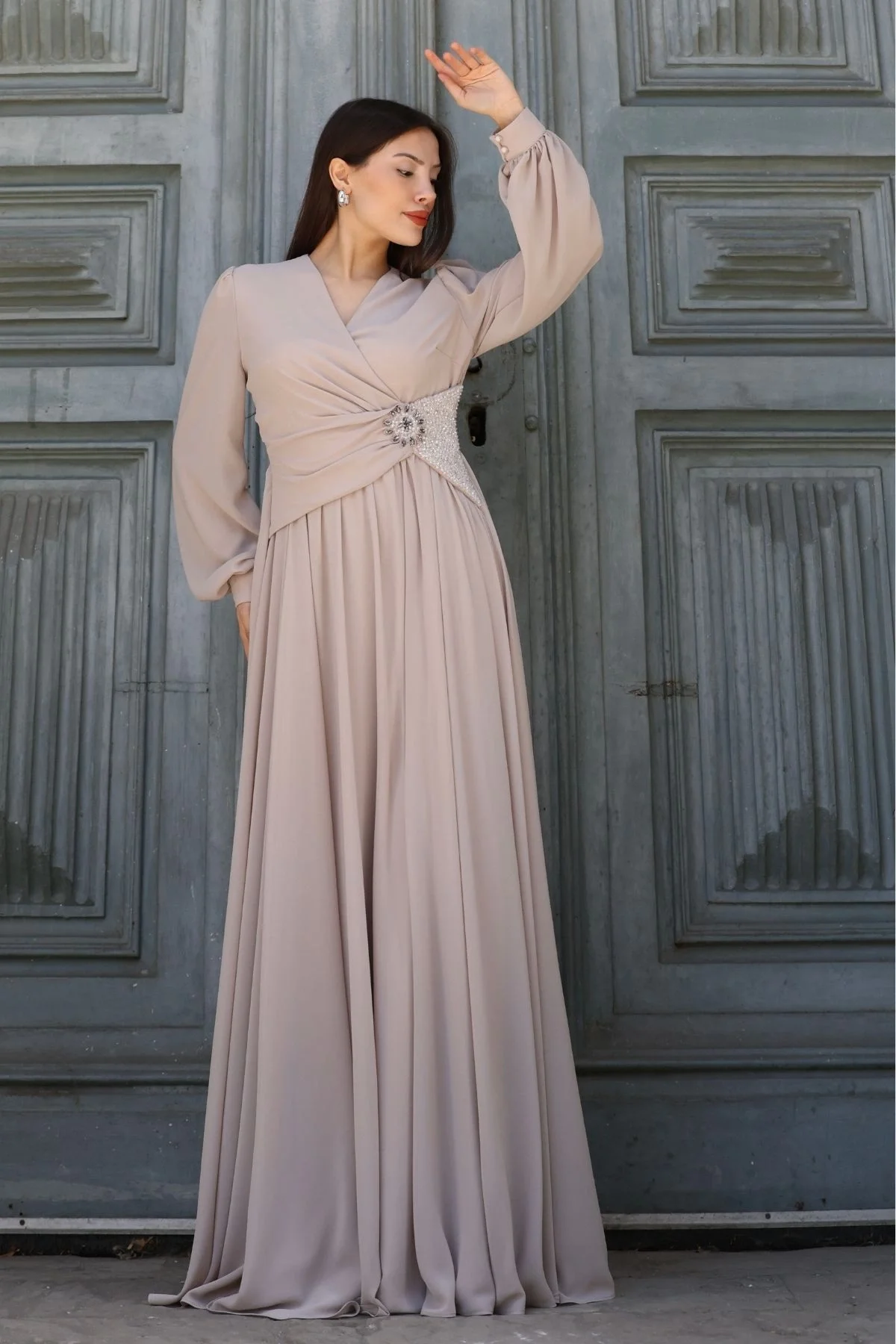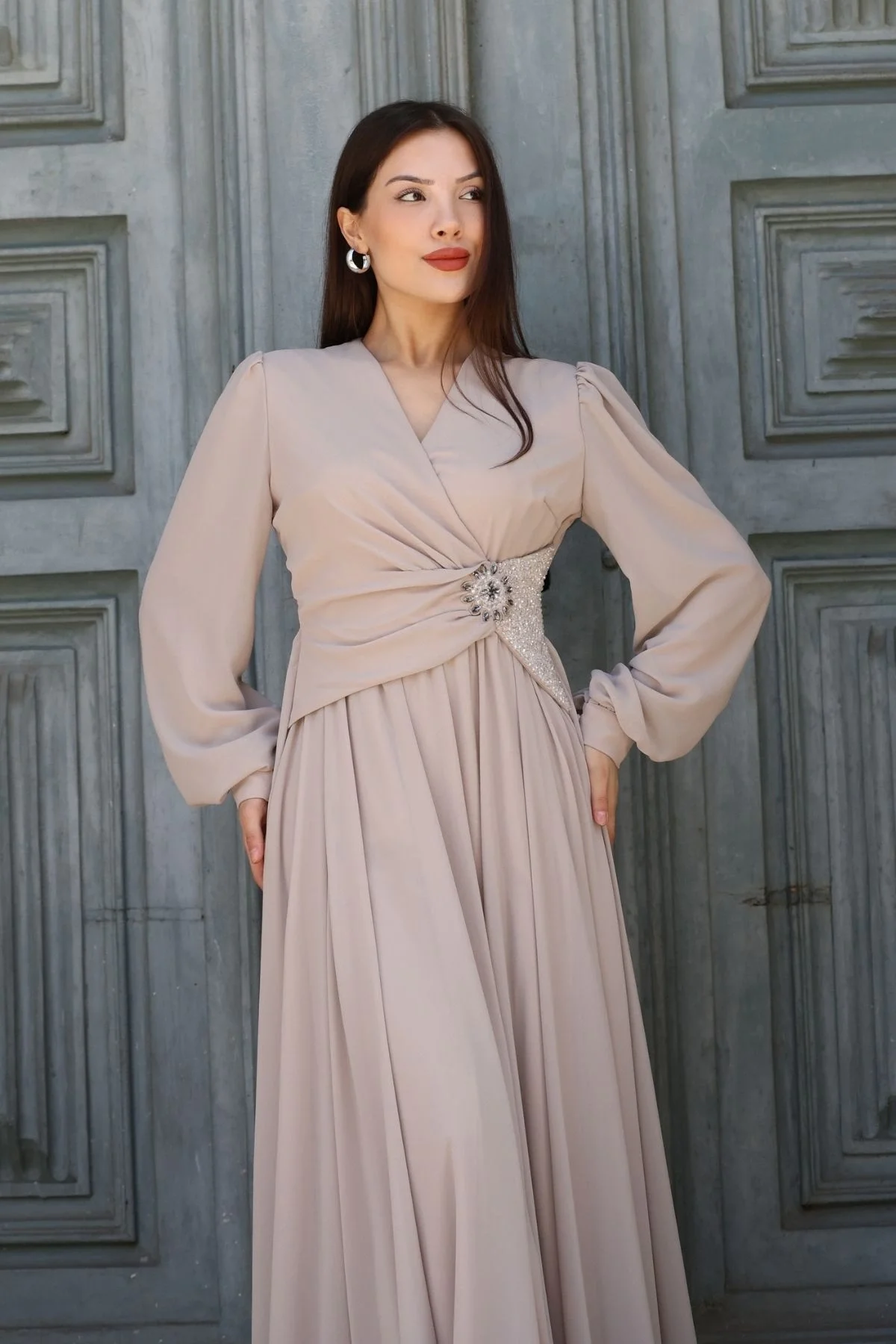 Bel Detaylı Kruvaze Yaka Abiye Elbise 2763-Bej