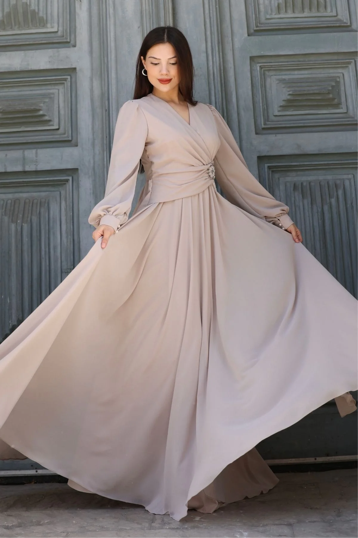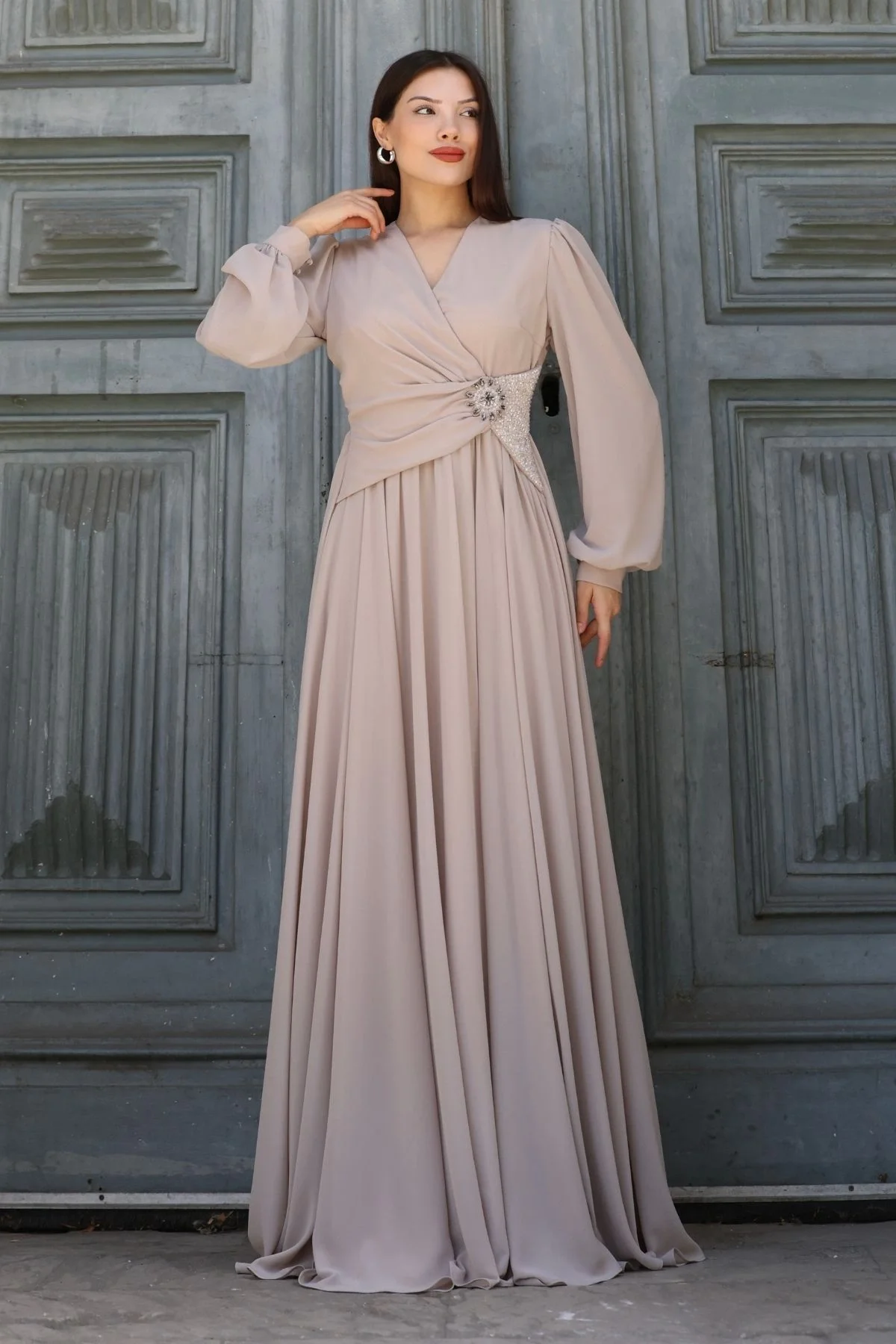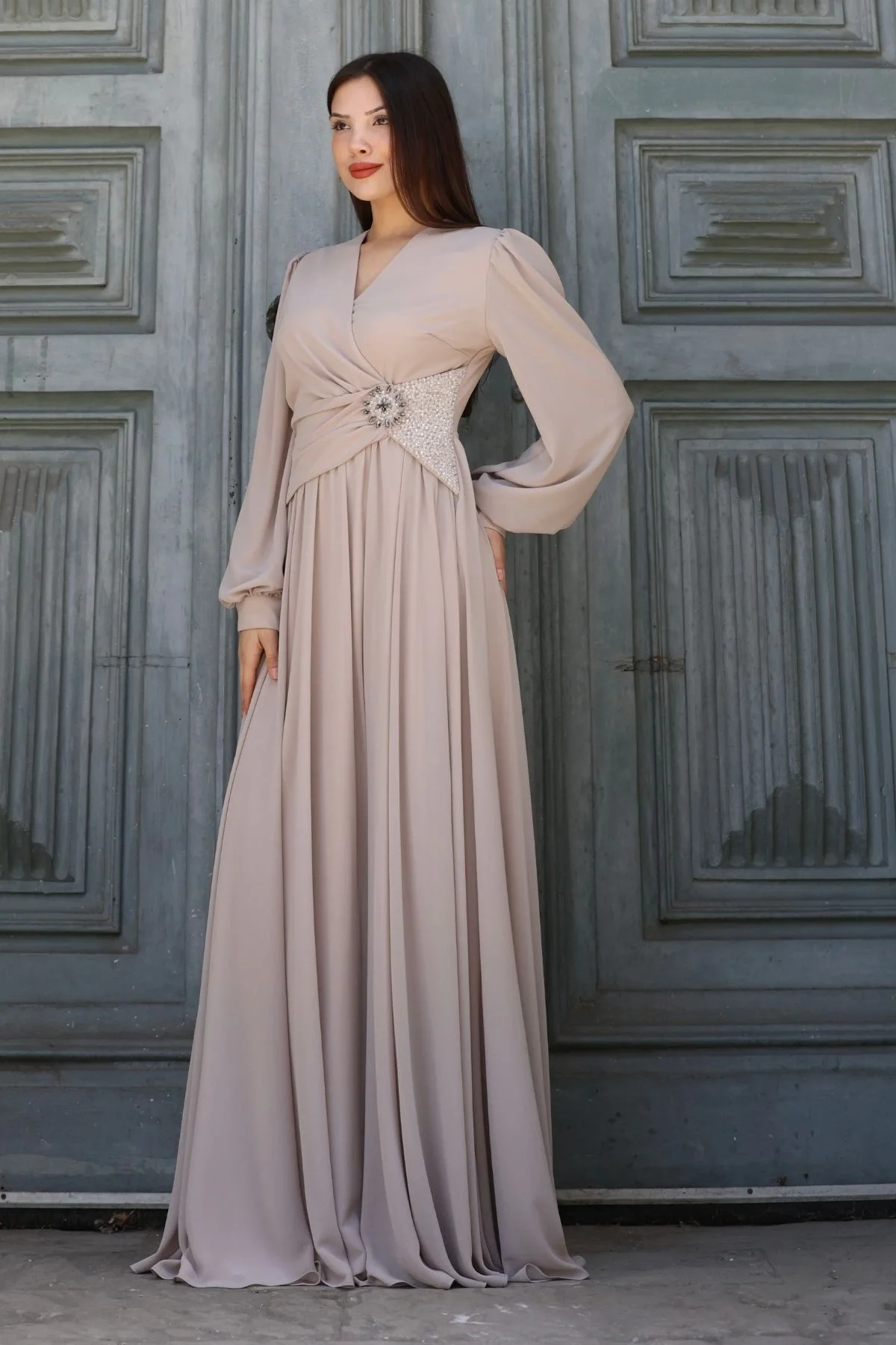 Bel Detaylı Kruvaze Yaka Abiye Elbise 2763-Bej
