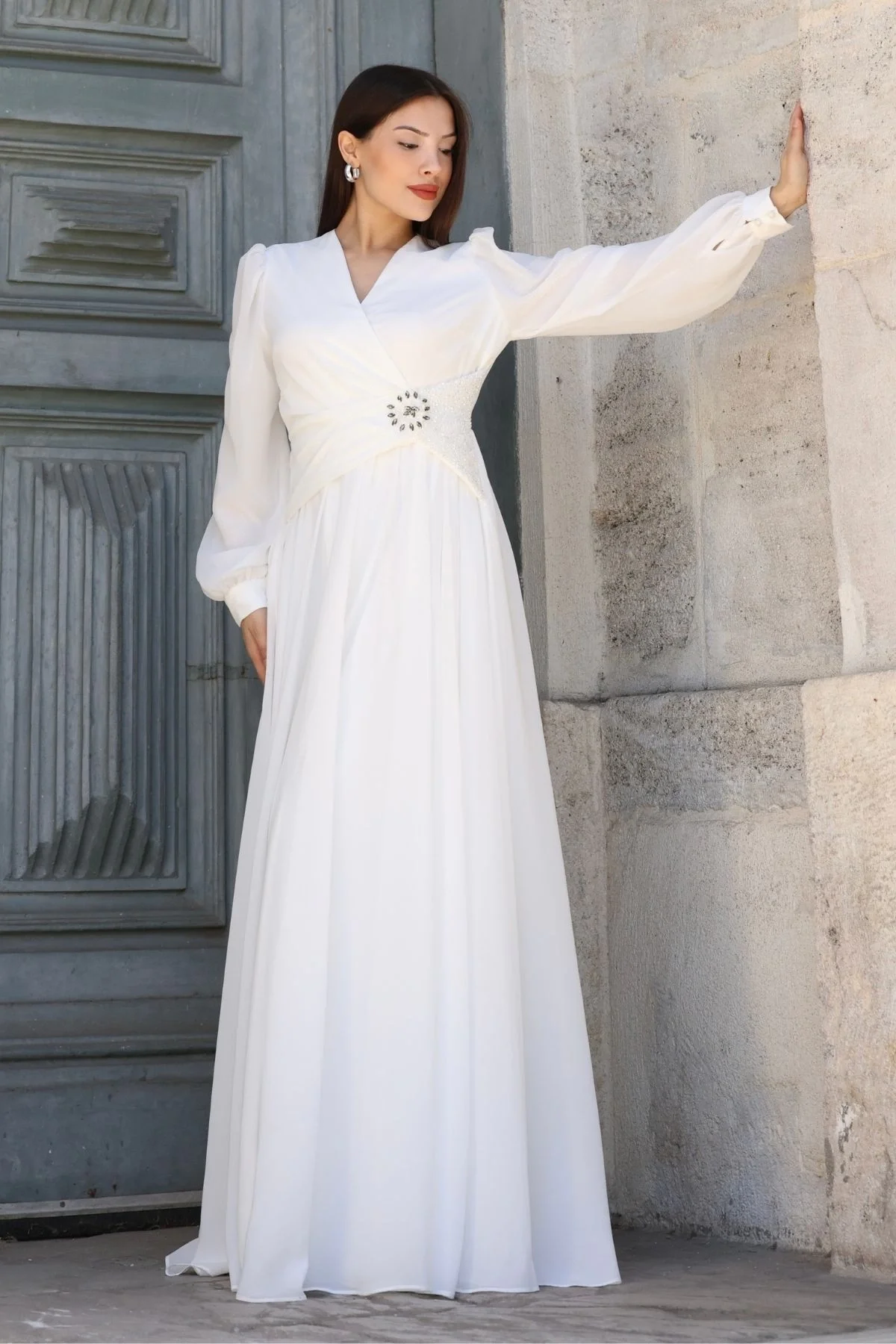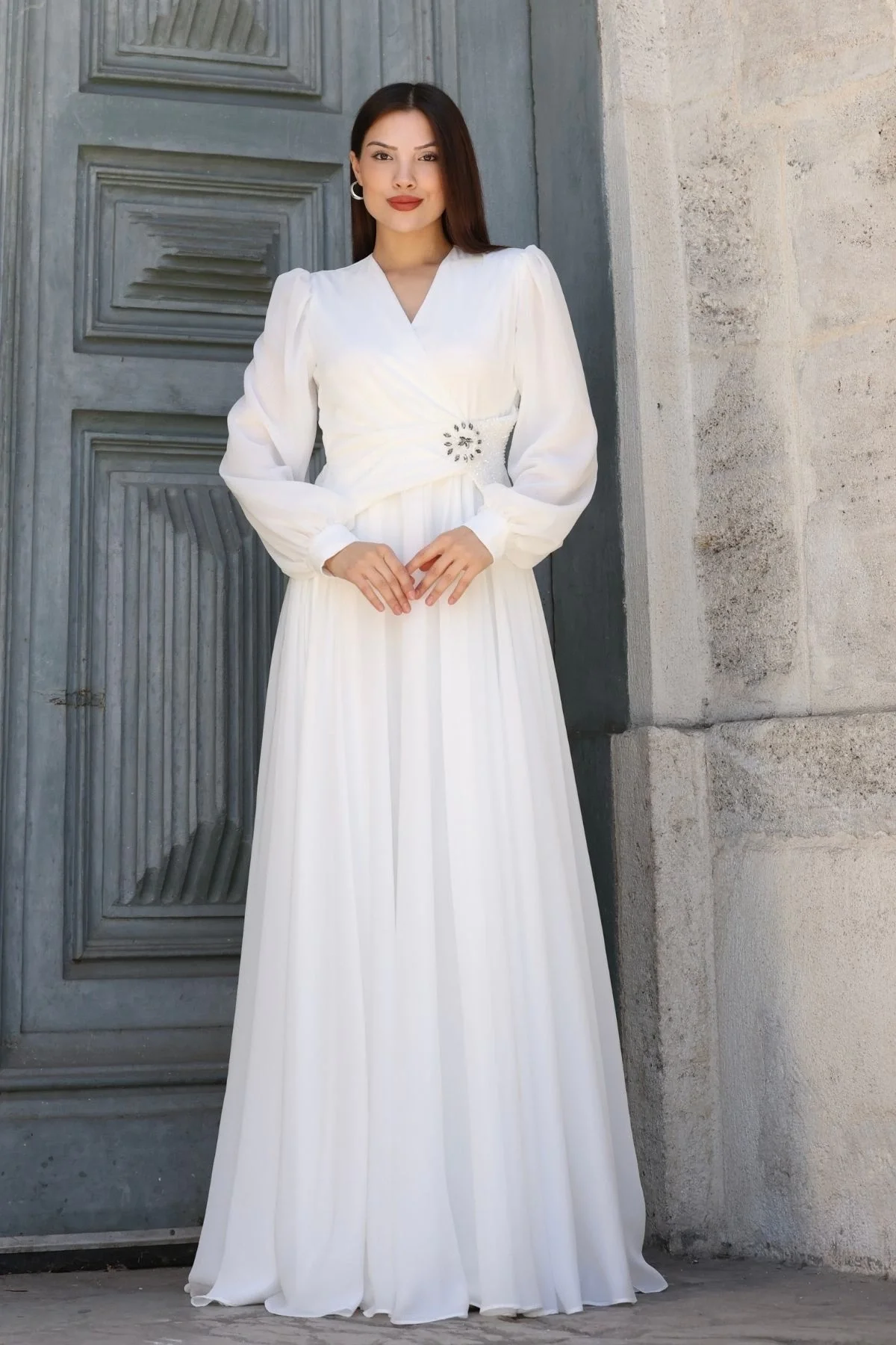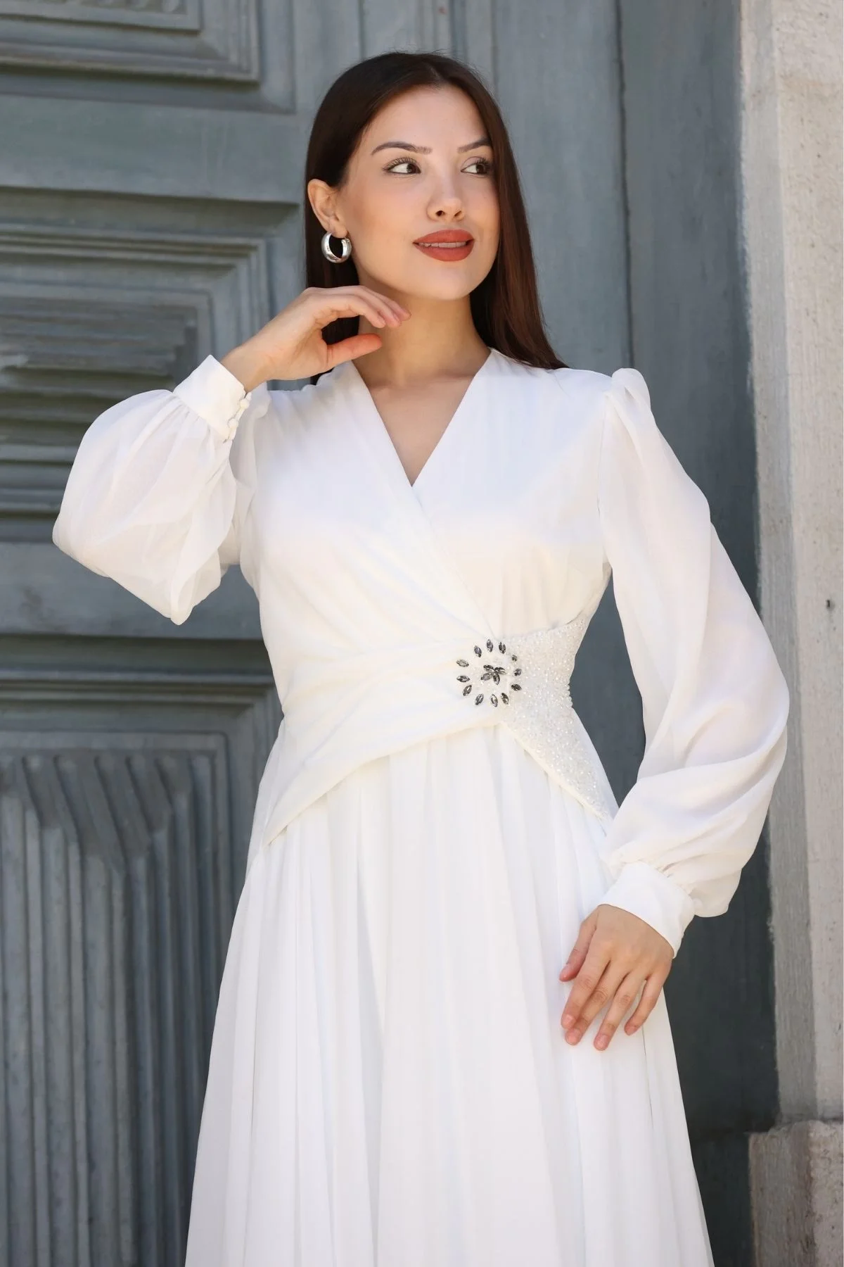 Bel Detaylı Kruvaze Yaka Abiye Elbise 2763-Beyaz