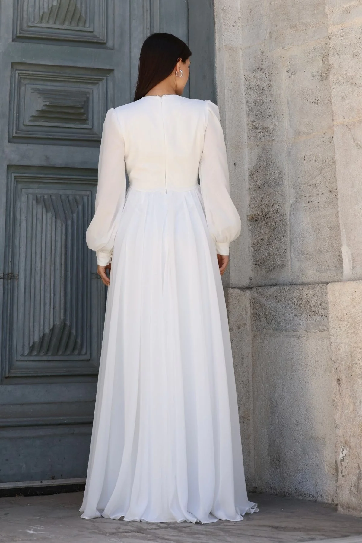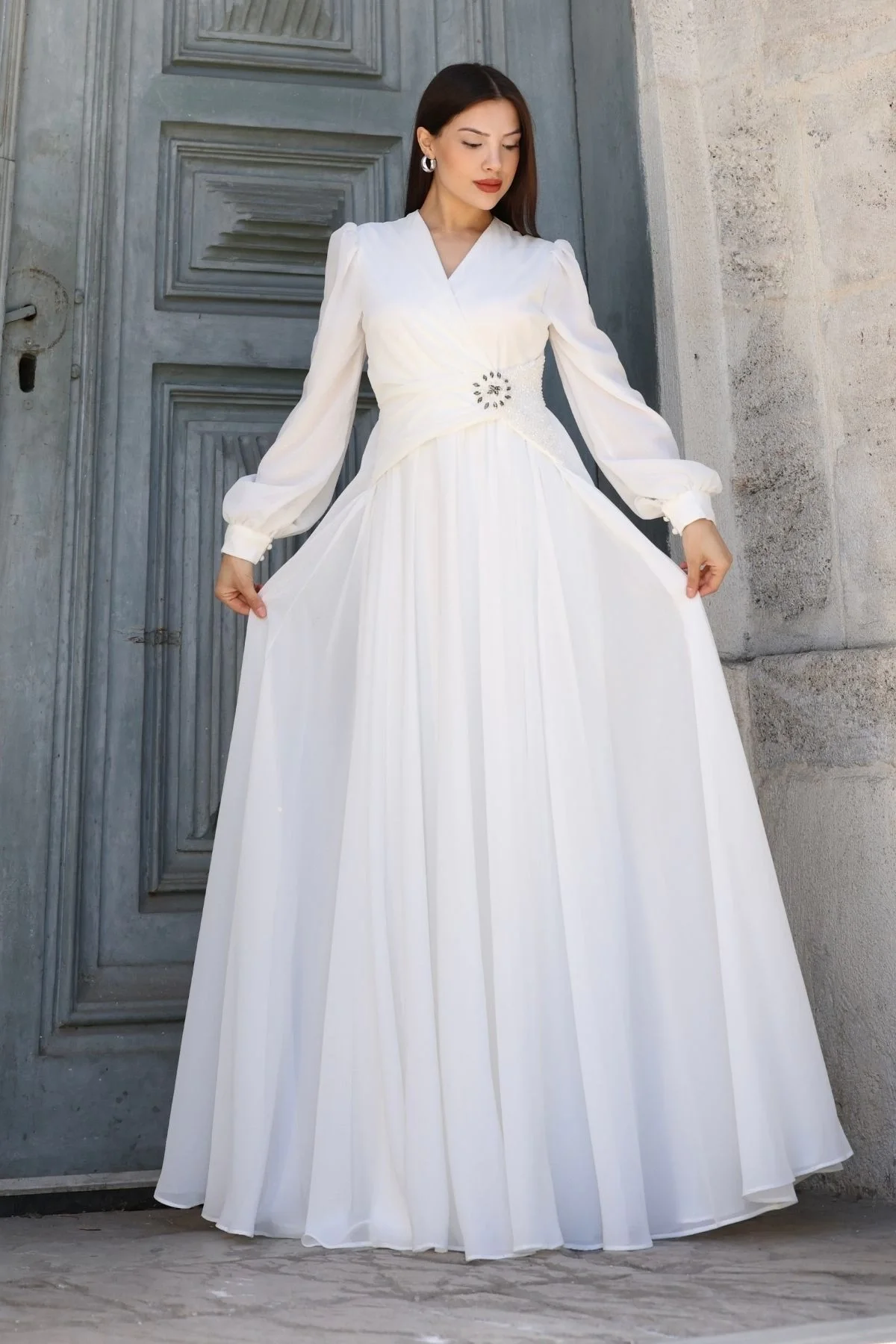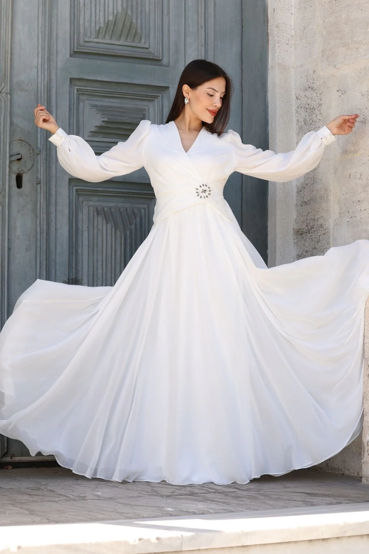 Bel Detaylı Kruvaze Yaka Abiye Elbise 2763-Beyaz