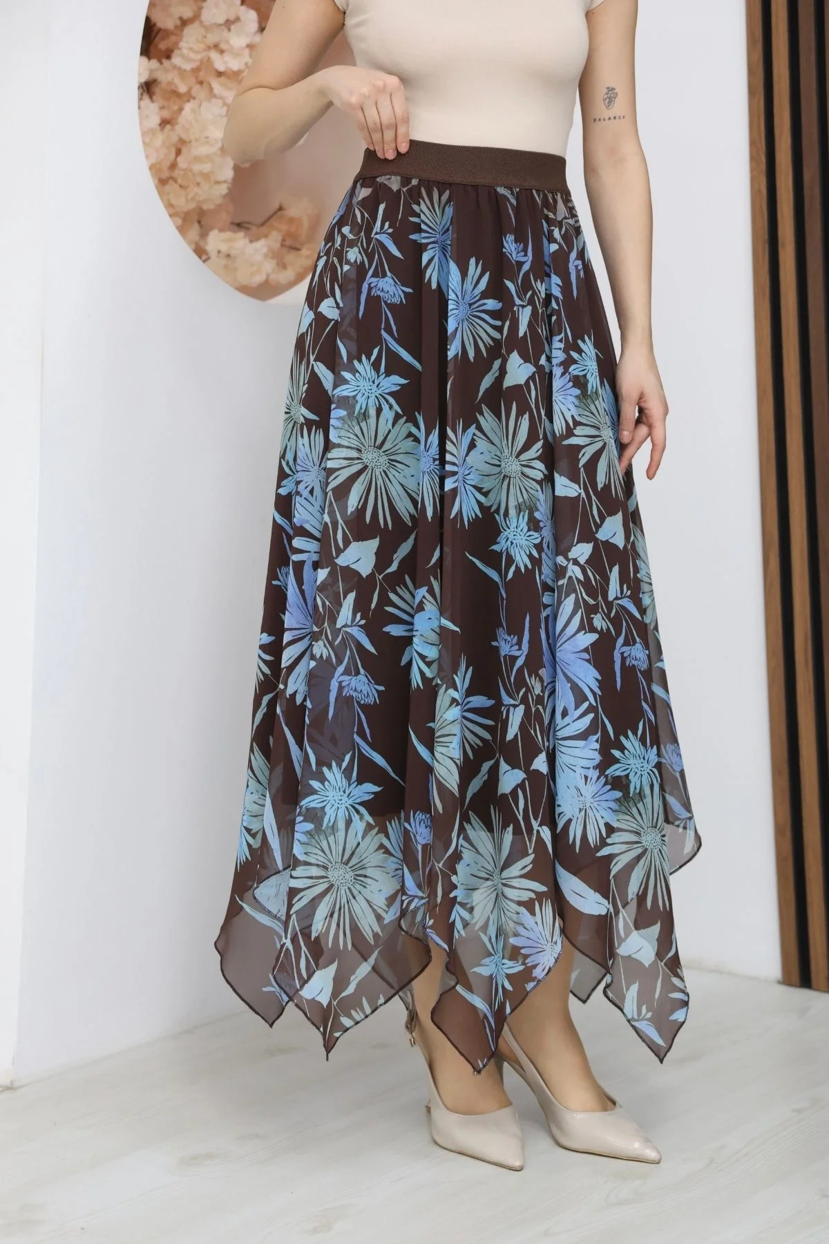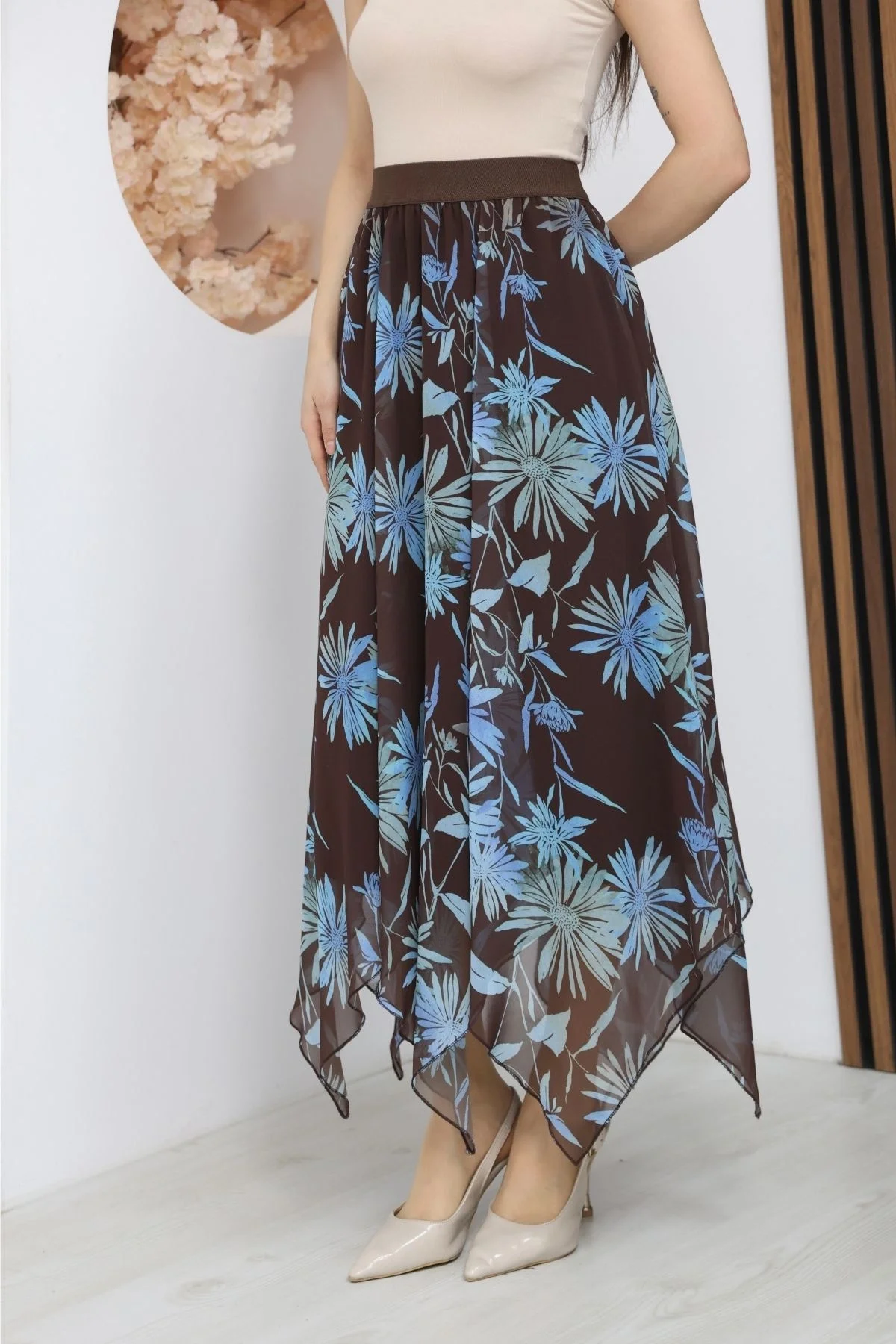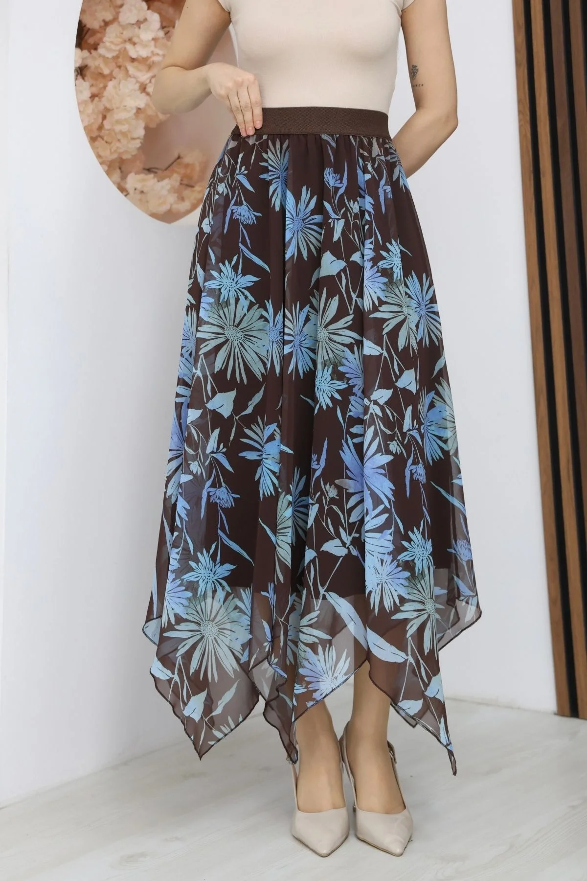 Beli Lastikli Asimetrik Şifon Etek 6071-Kahverengi/ Mavi