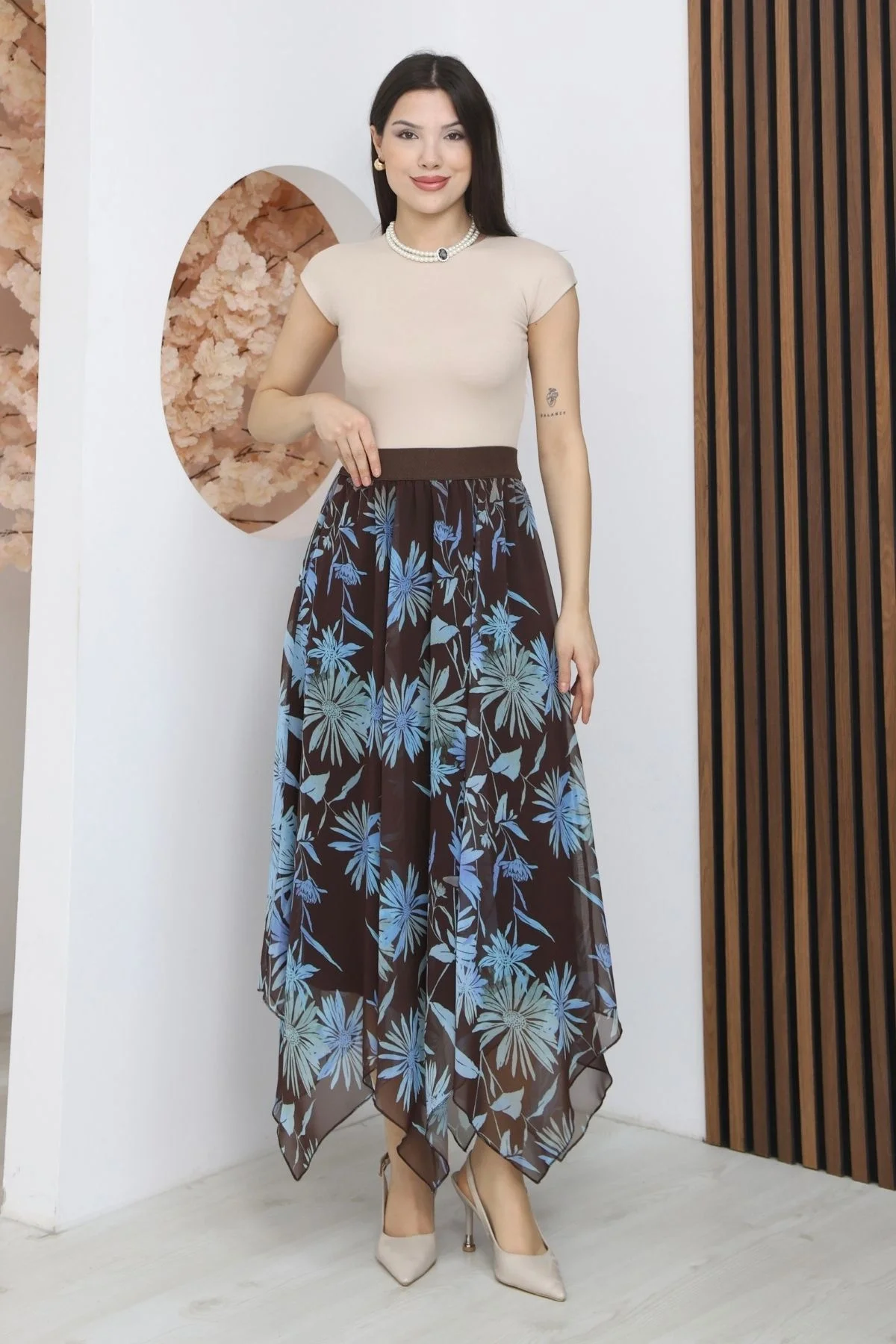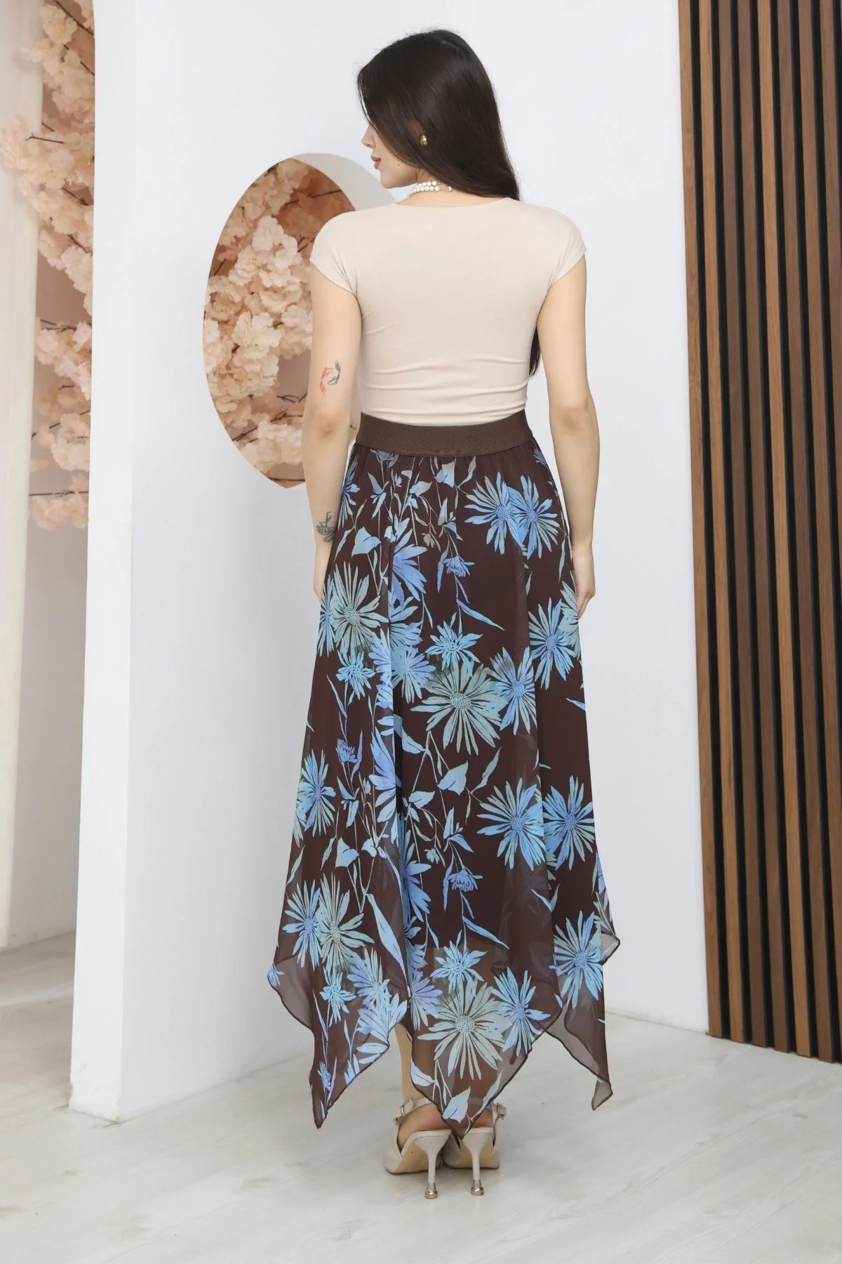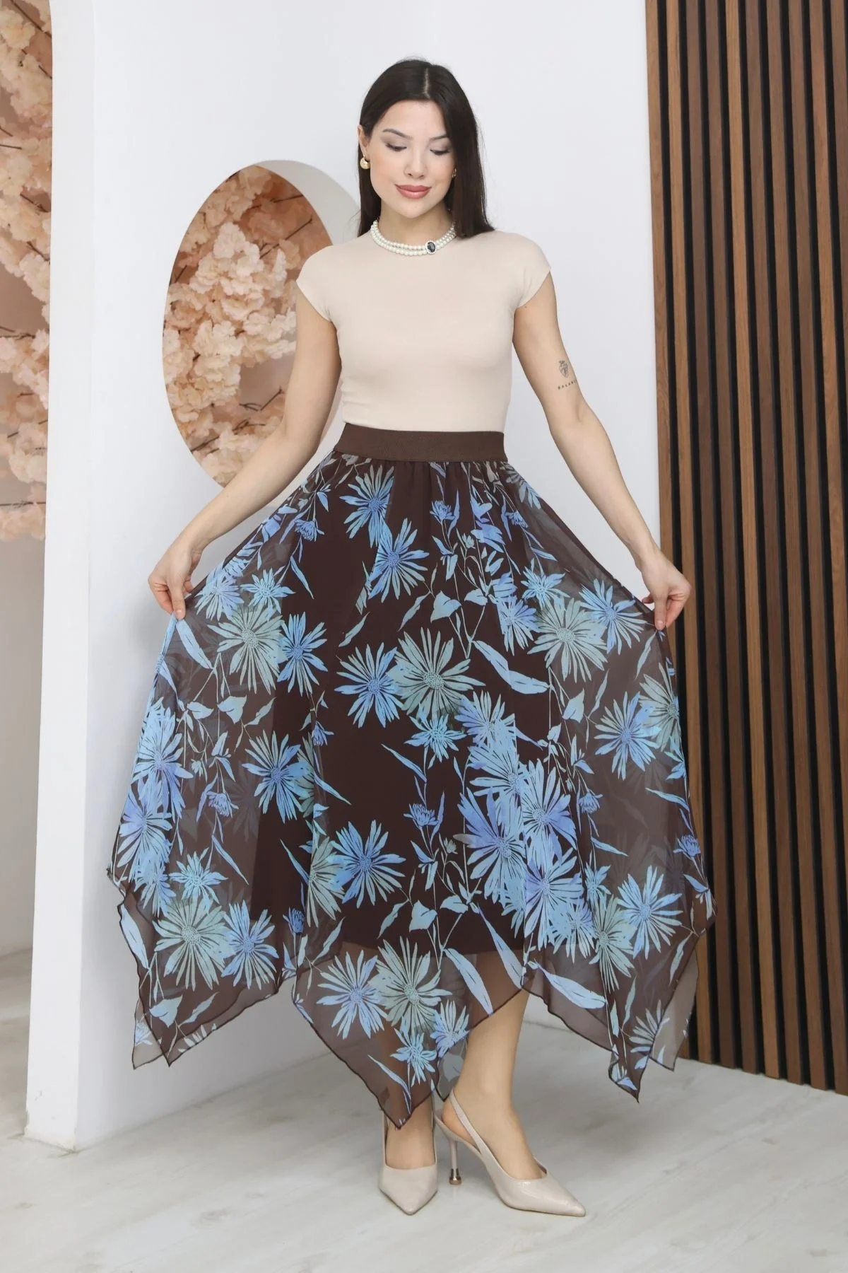 Beli Lastikli Asimetrik Şifon Etek 6071-Kahverengi/ Mavi