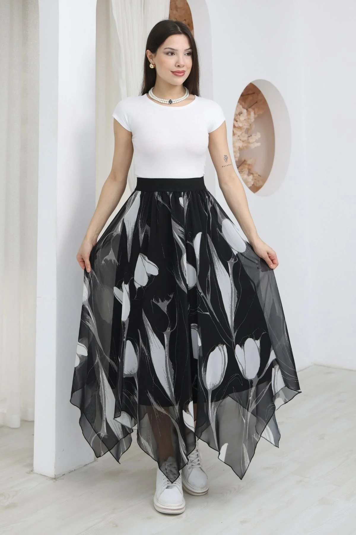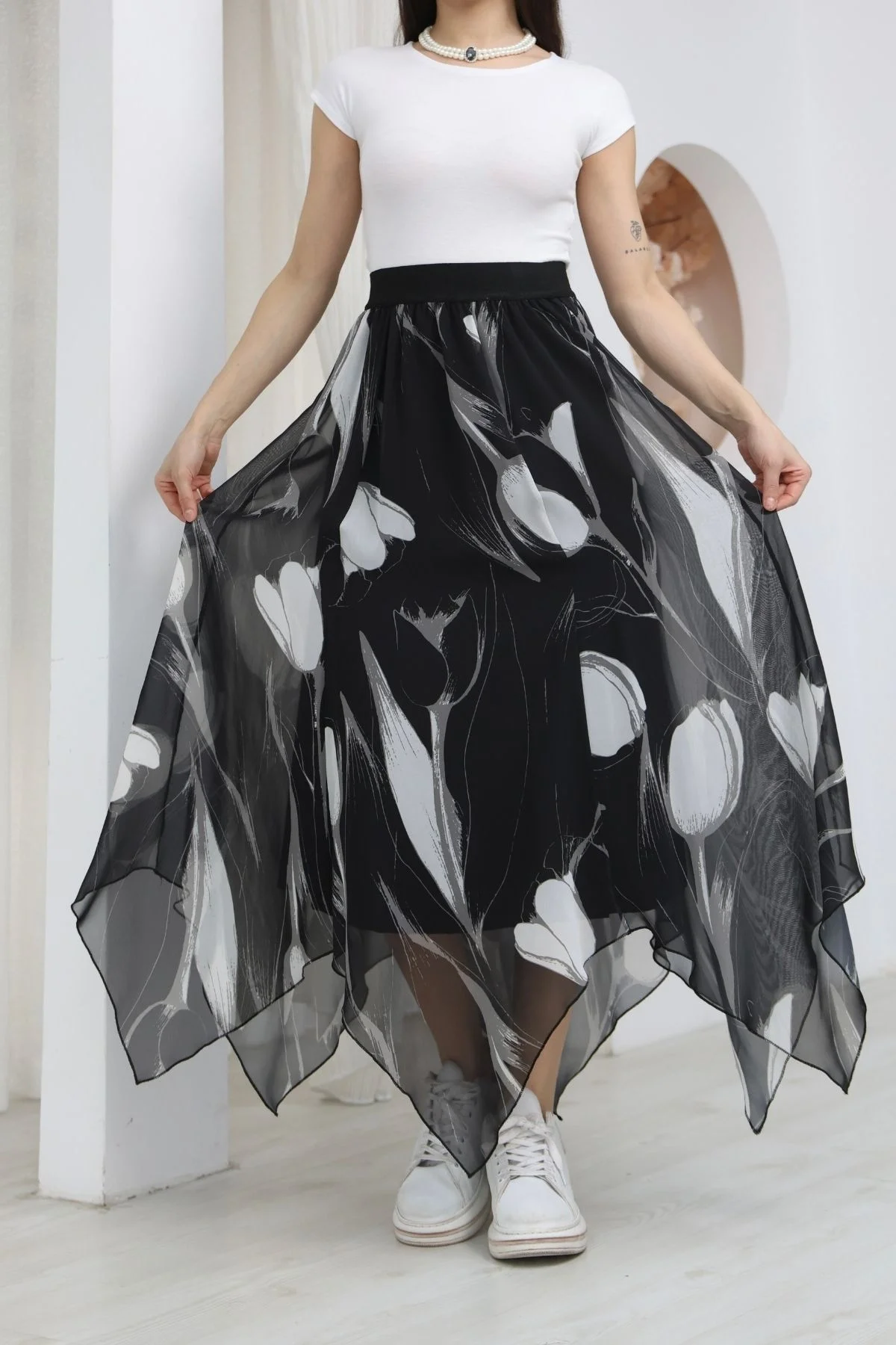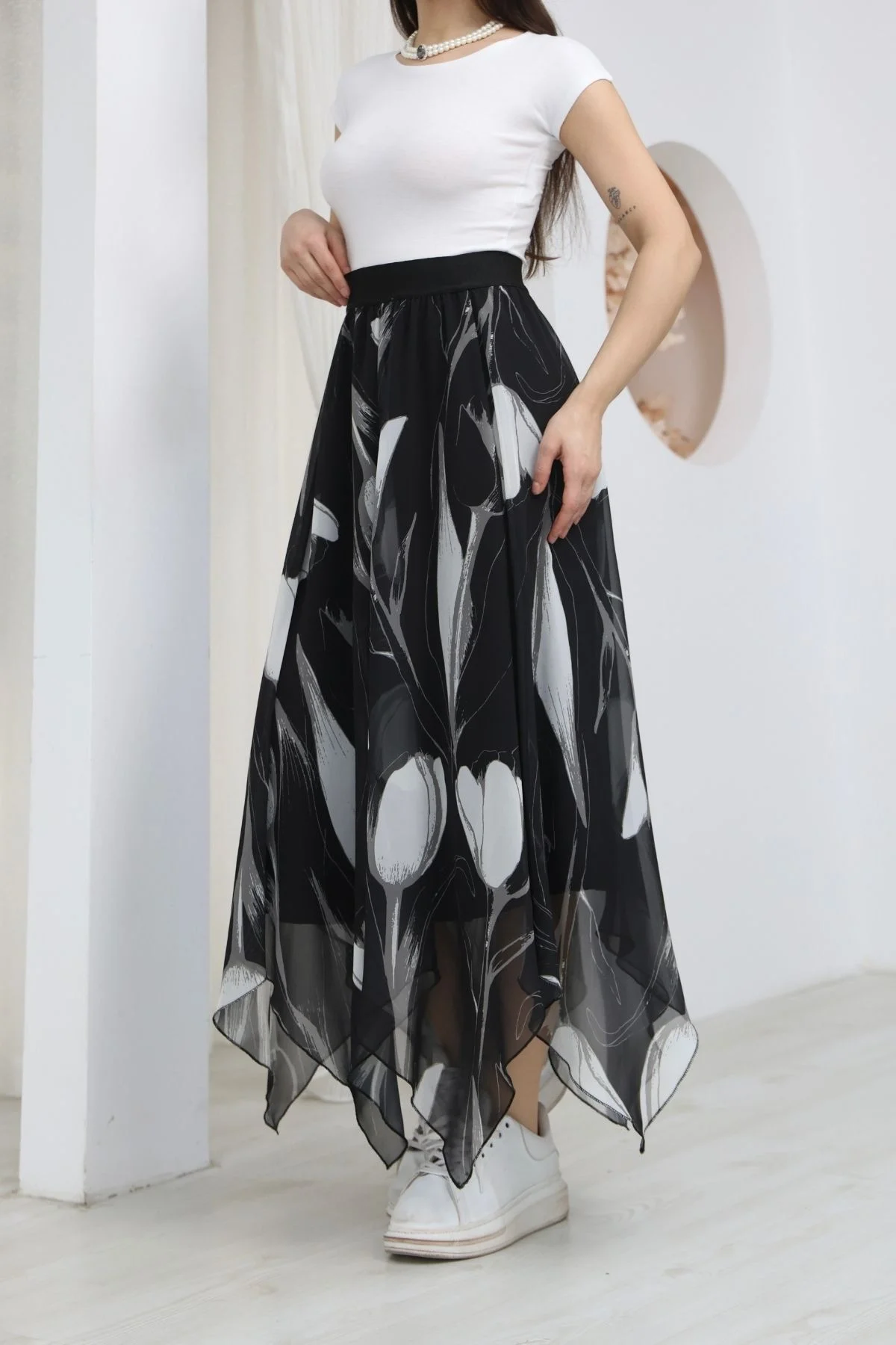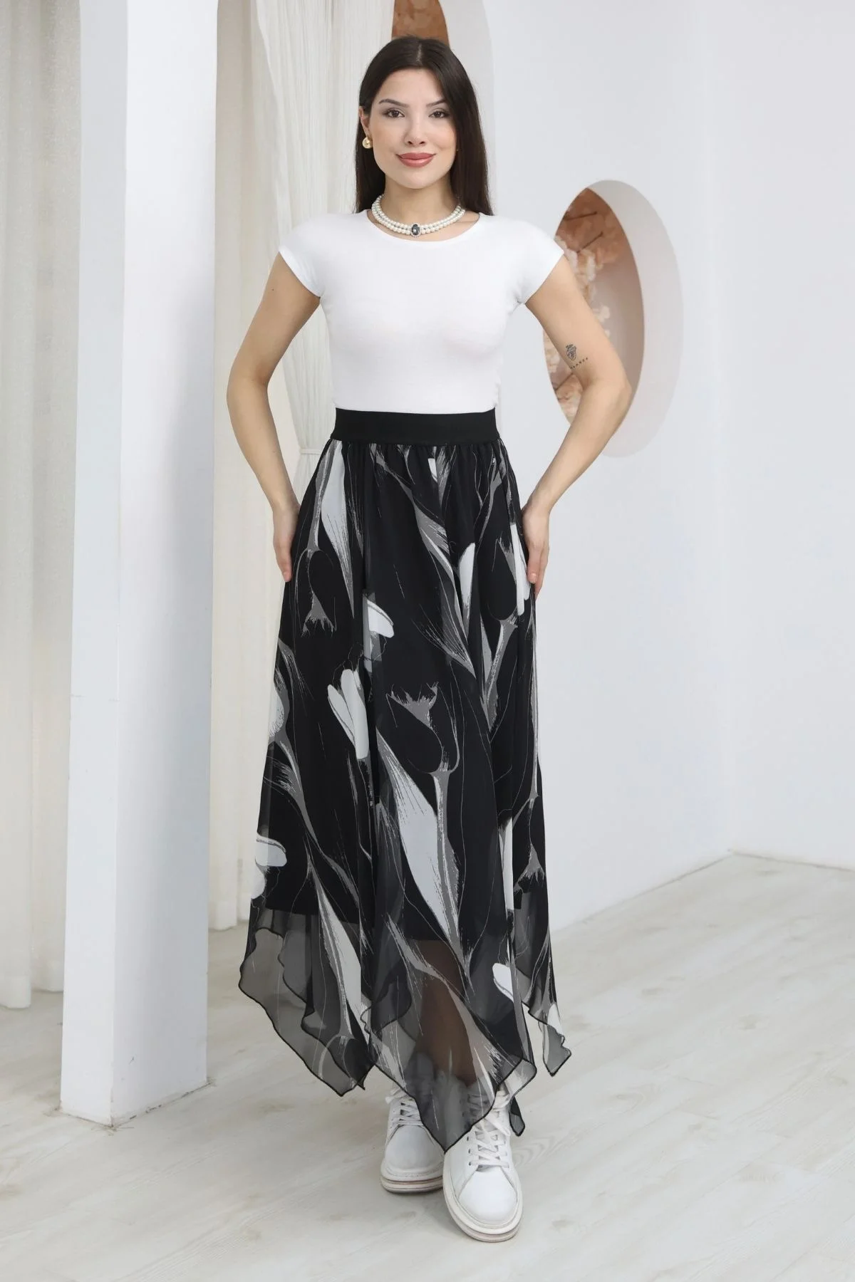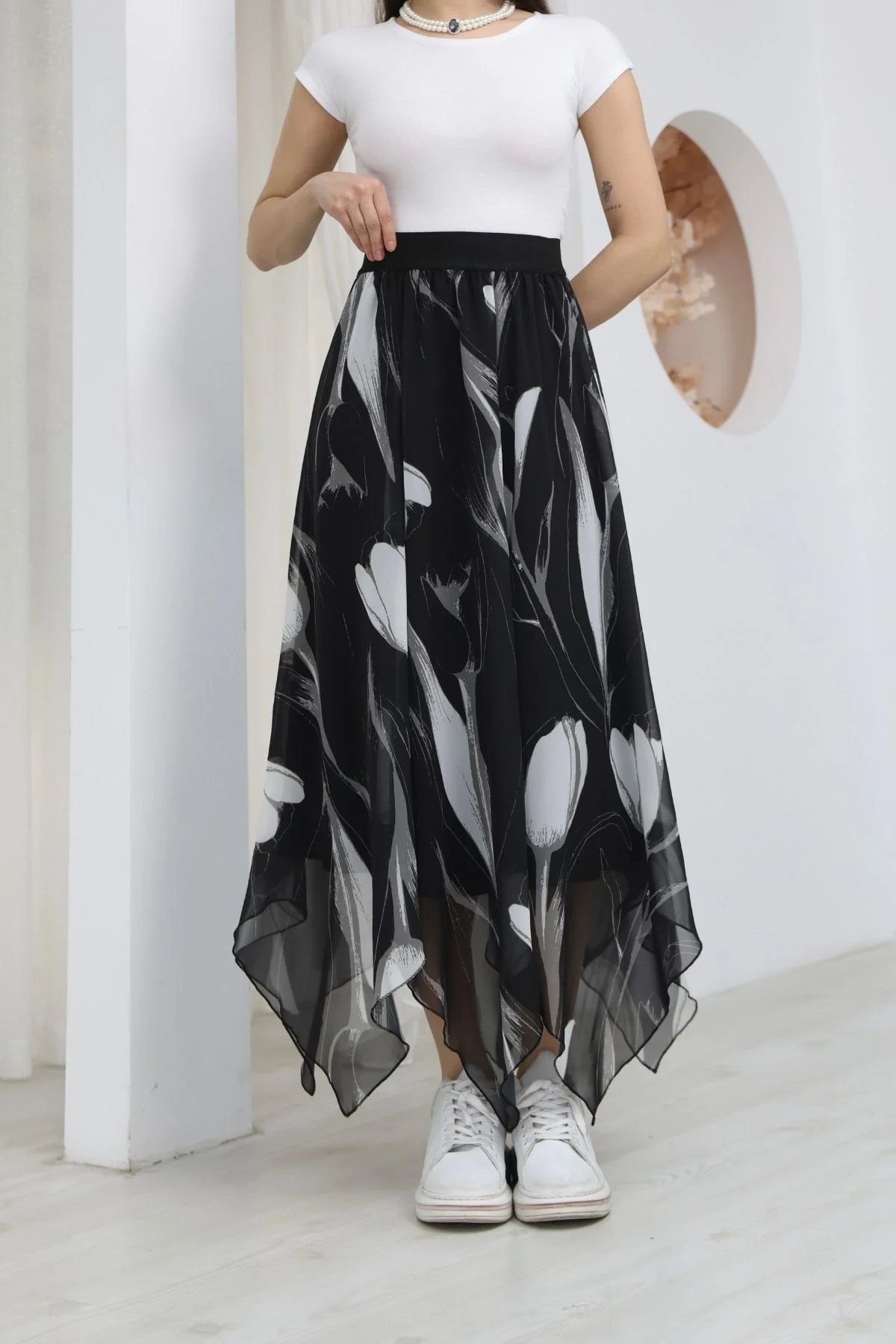 Beli Lastikli Asimetrik Şifon Etek 6071-Siyah / Beyaz
