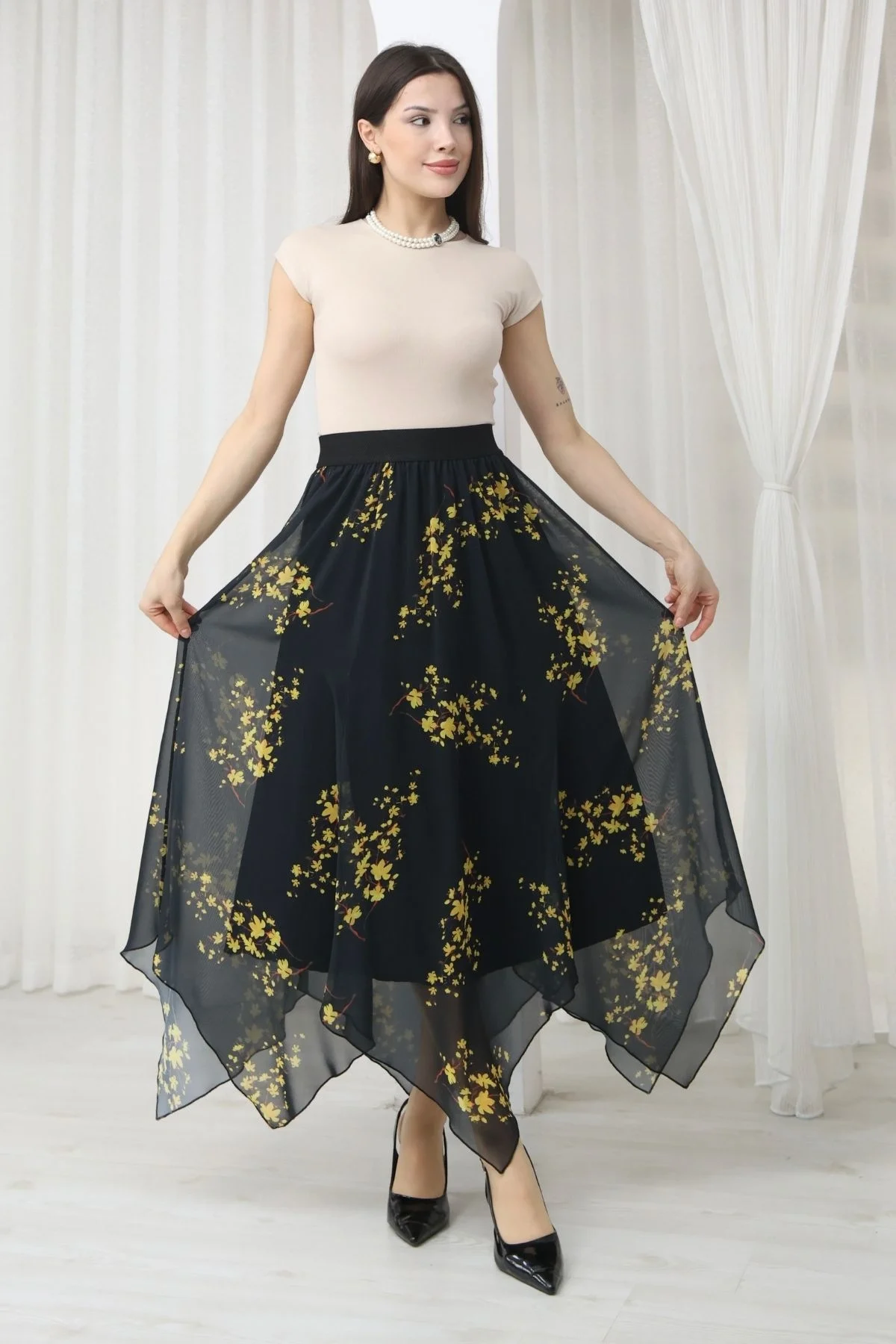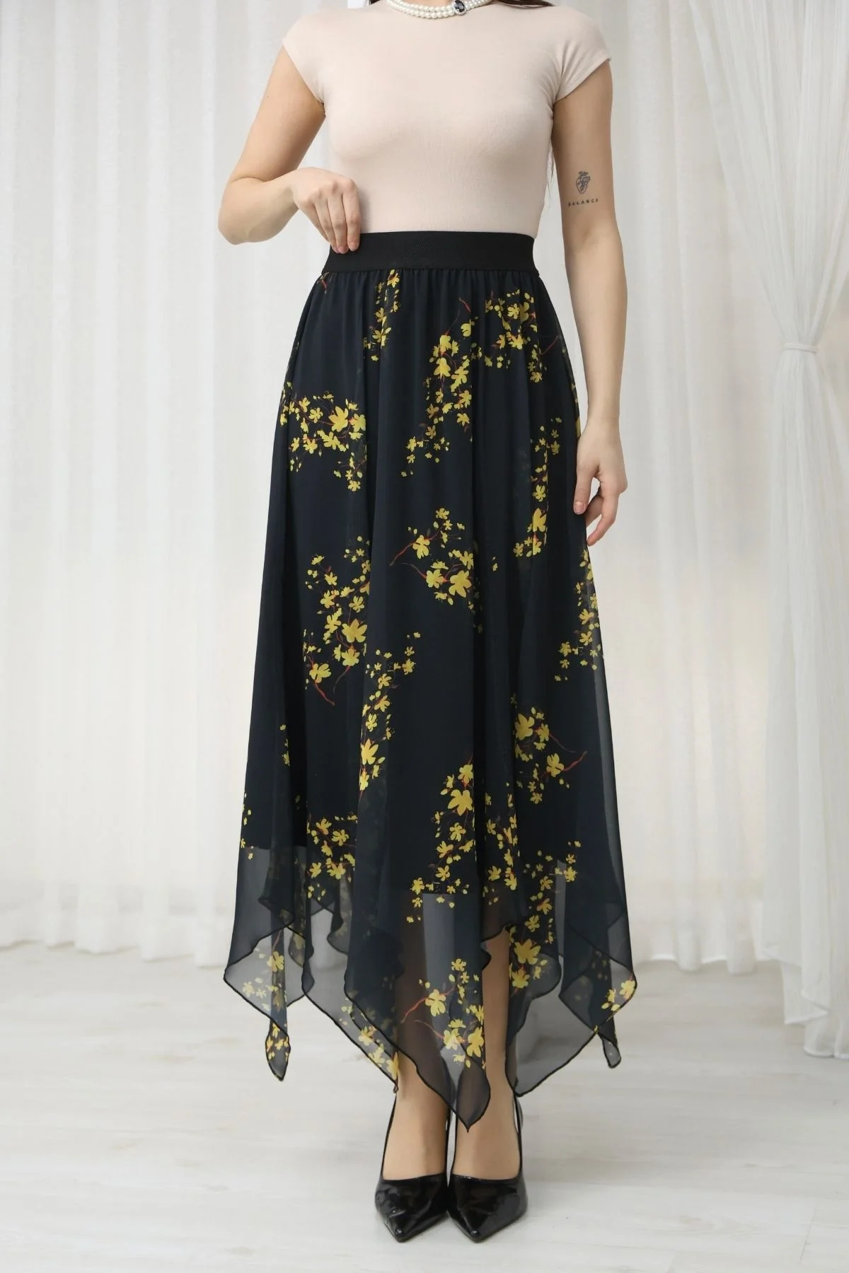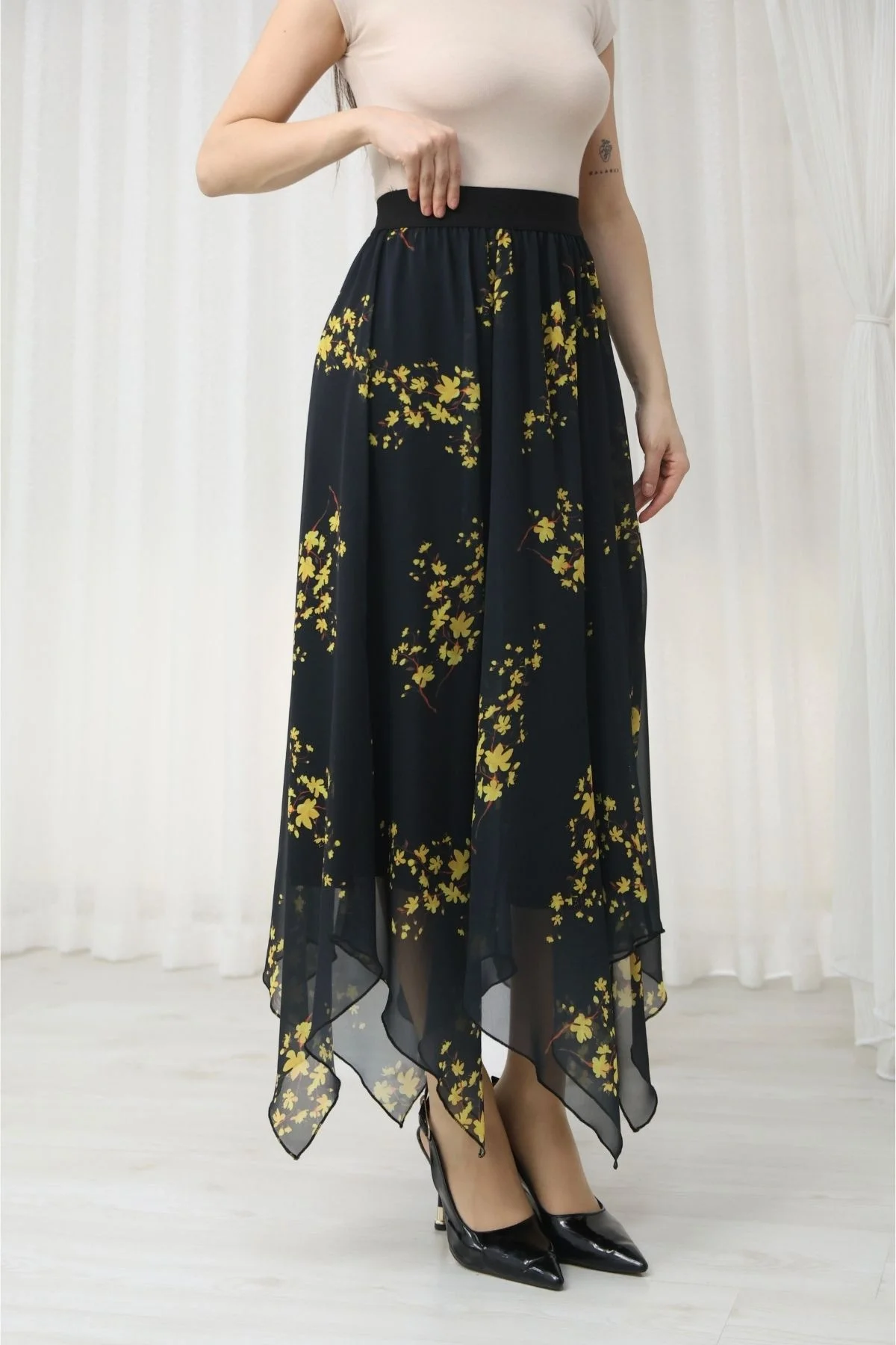 Beli Lastikli Asimetrik Şifon Etek 6071-Siyah / Sarı