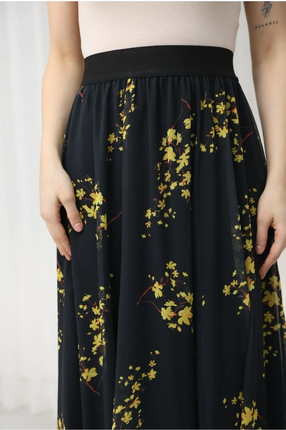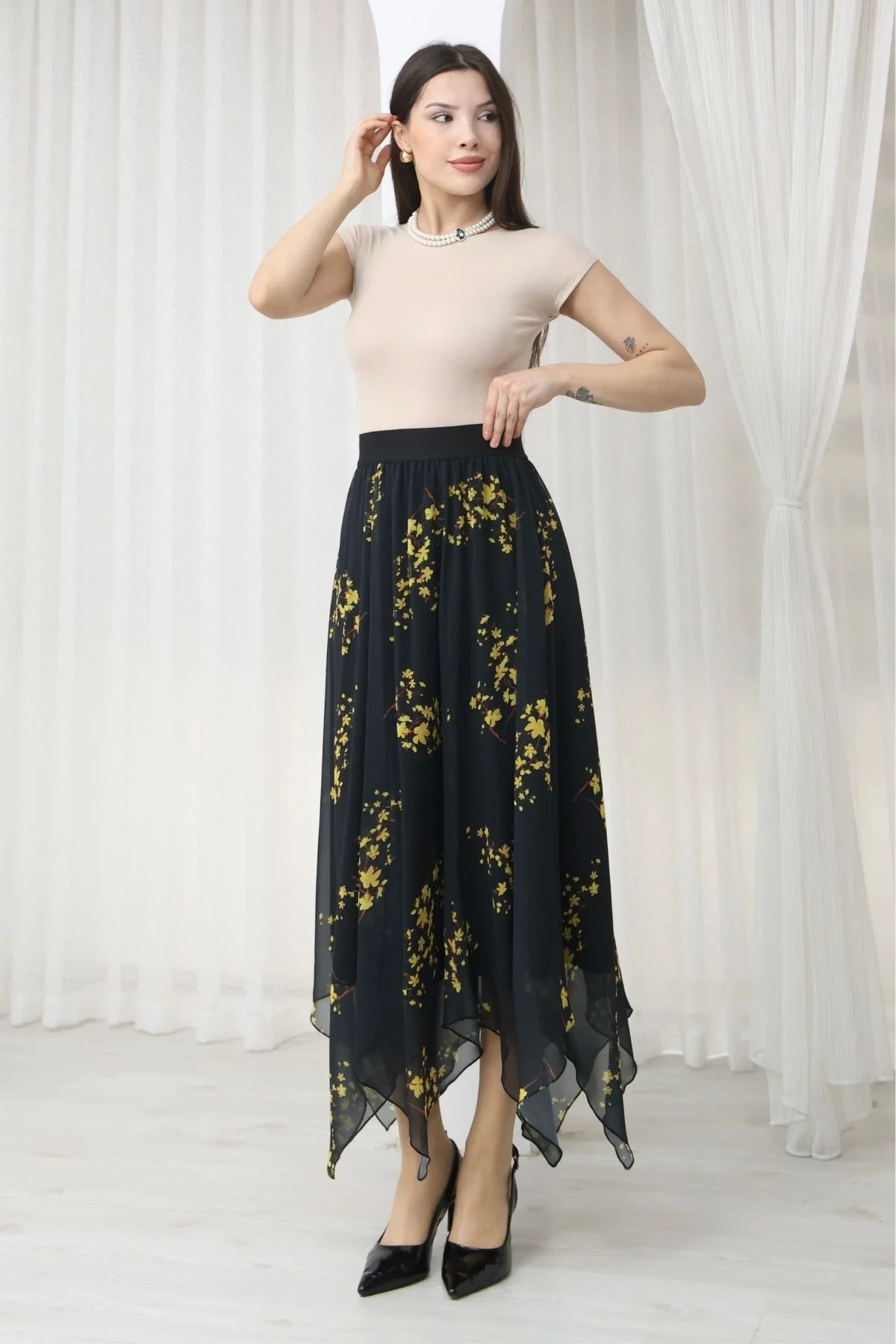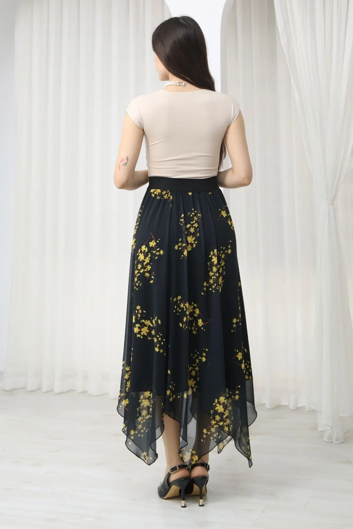 Beli Lastikli Asimetrik Şifon Etek 6071-Siyah / Sarı