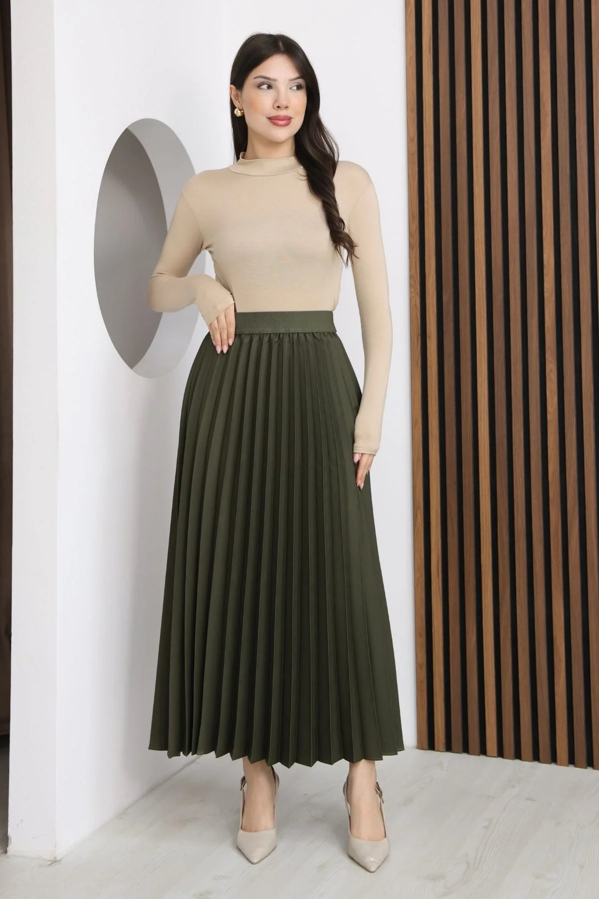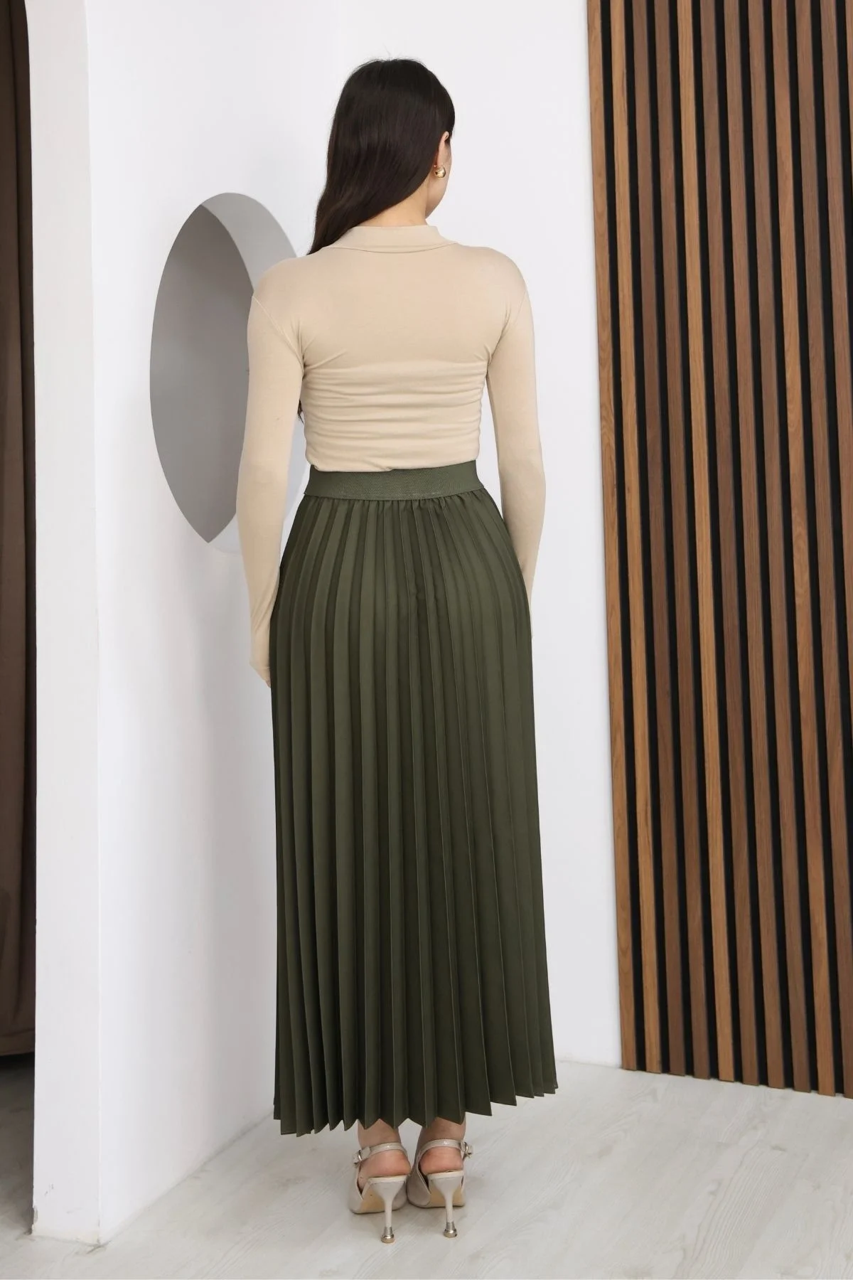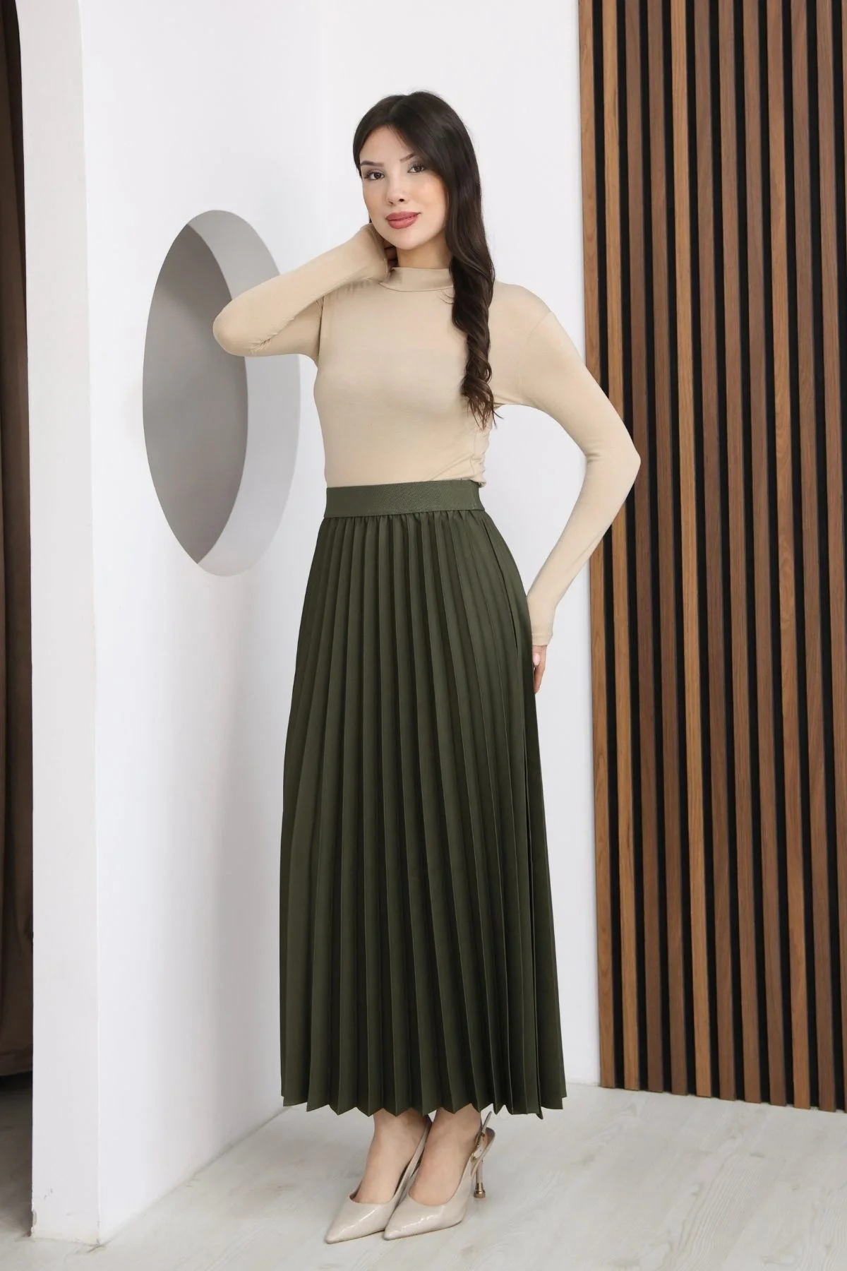 Beli Lastikli Piliseli Etek 6017-Haki