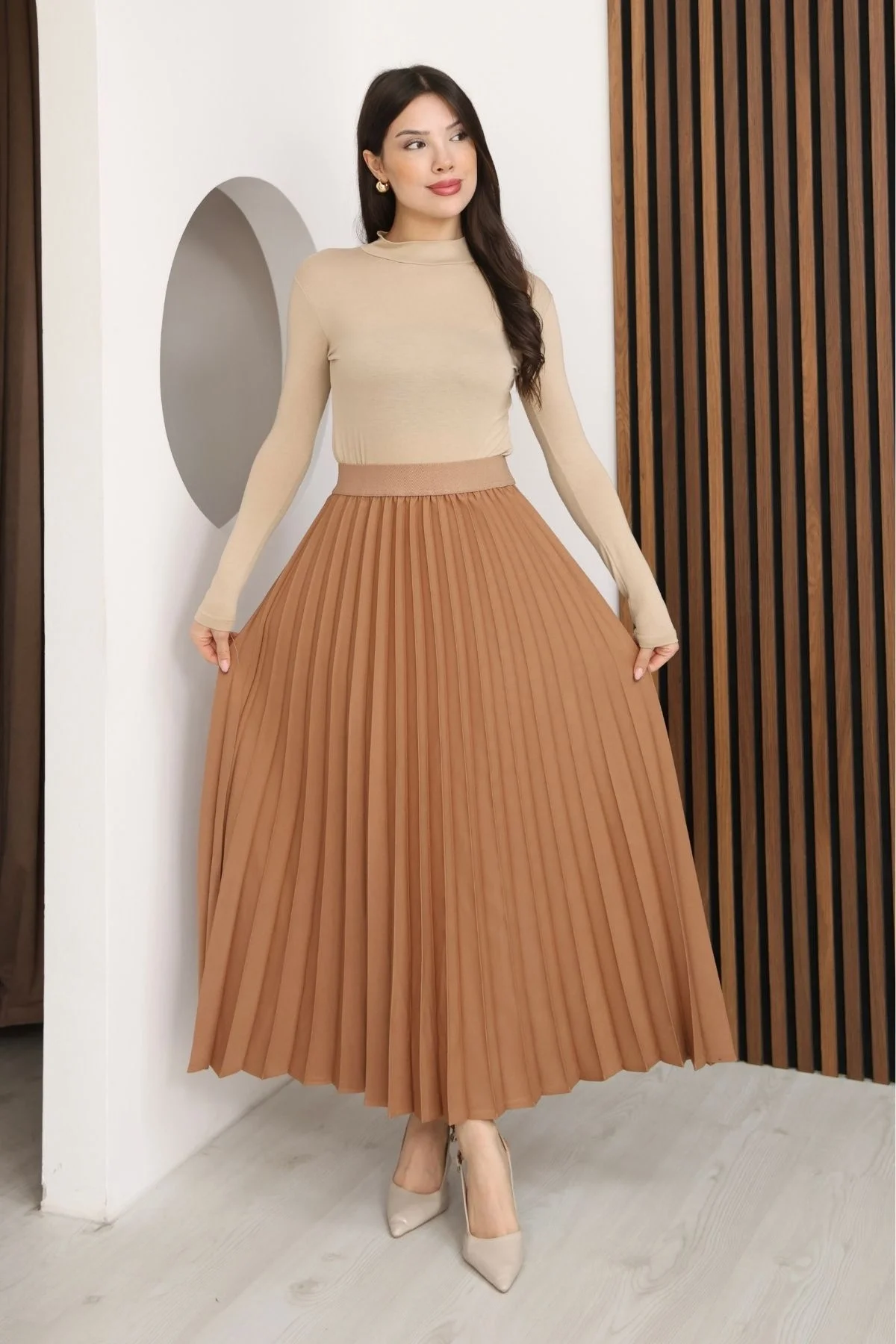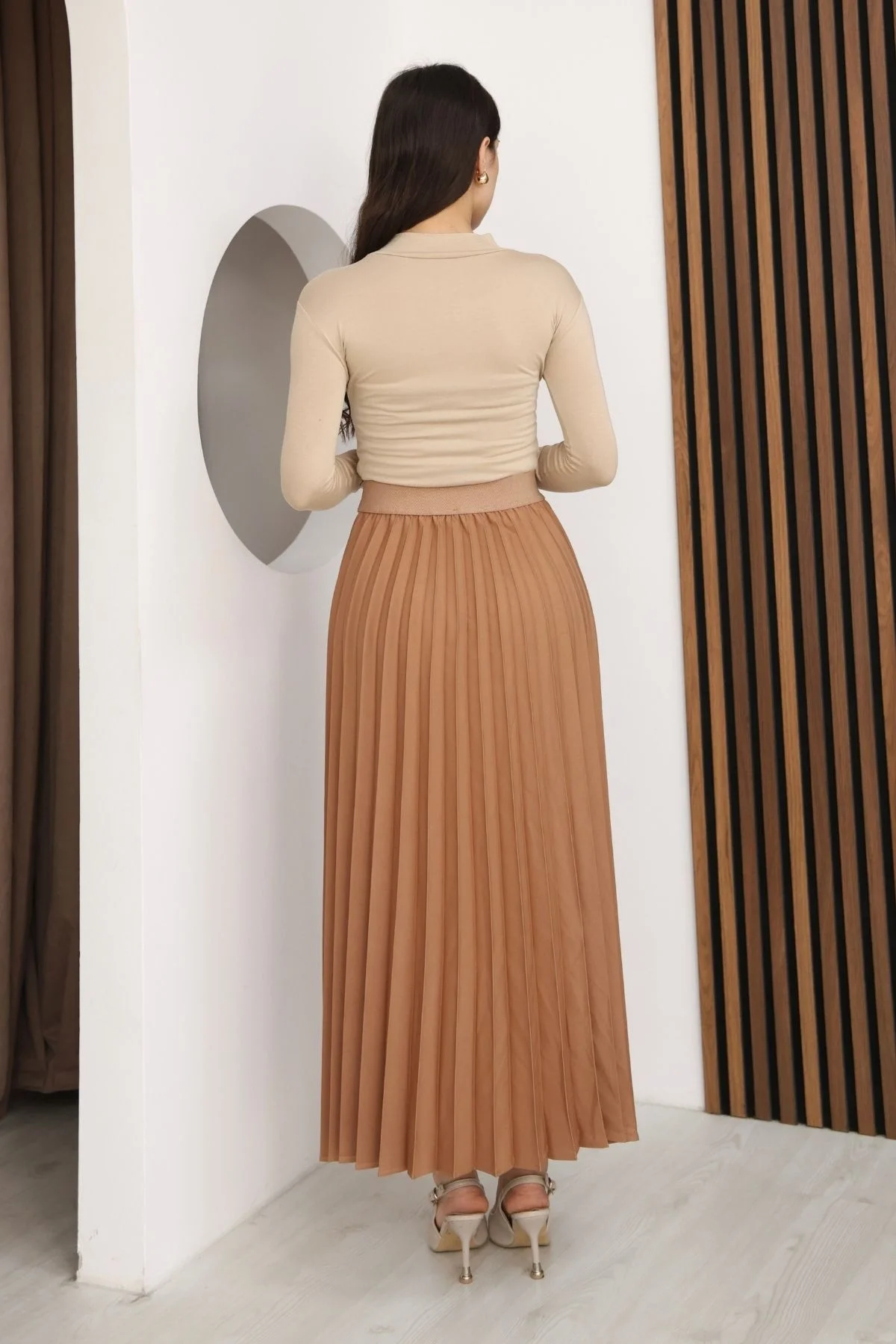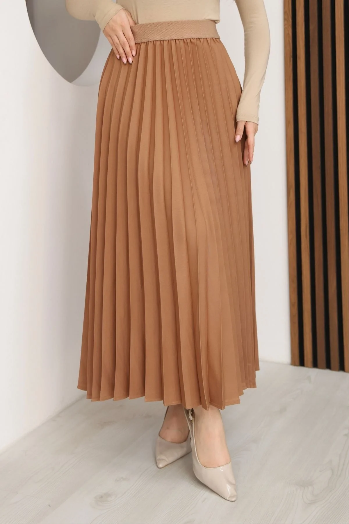 Akışkan piliseleri ve rahat kalıbıyla bu etek, hem şık görünmek hem de rahat hissetmek isteyenler için tasarlandı. Bel kısmındaki lastikli yapı vücudu sıkmadan toparlar, dökümlü formu ise silueti daha zarif gösterir.