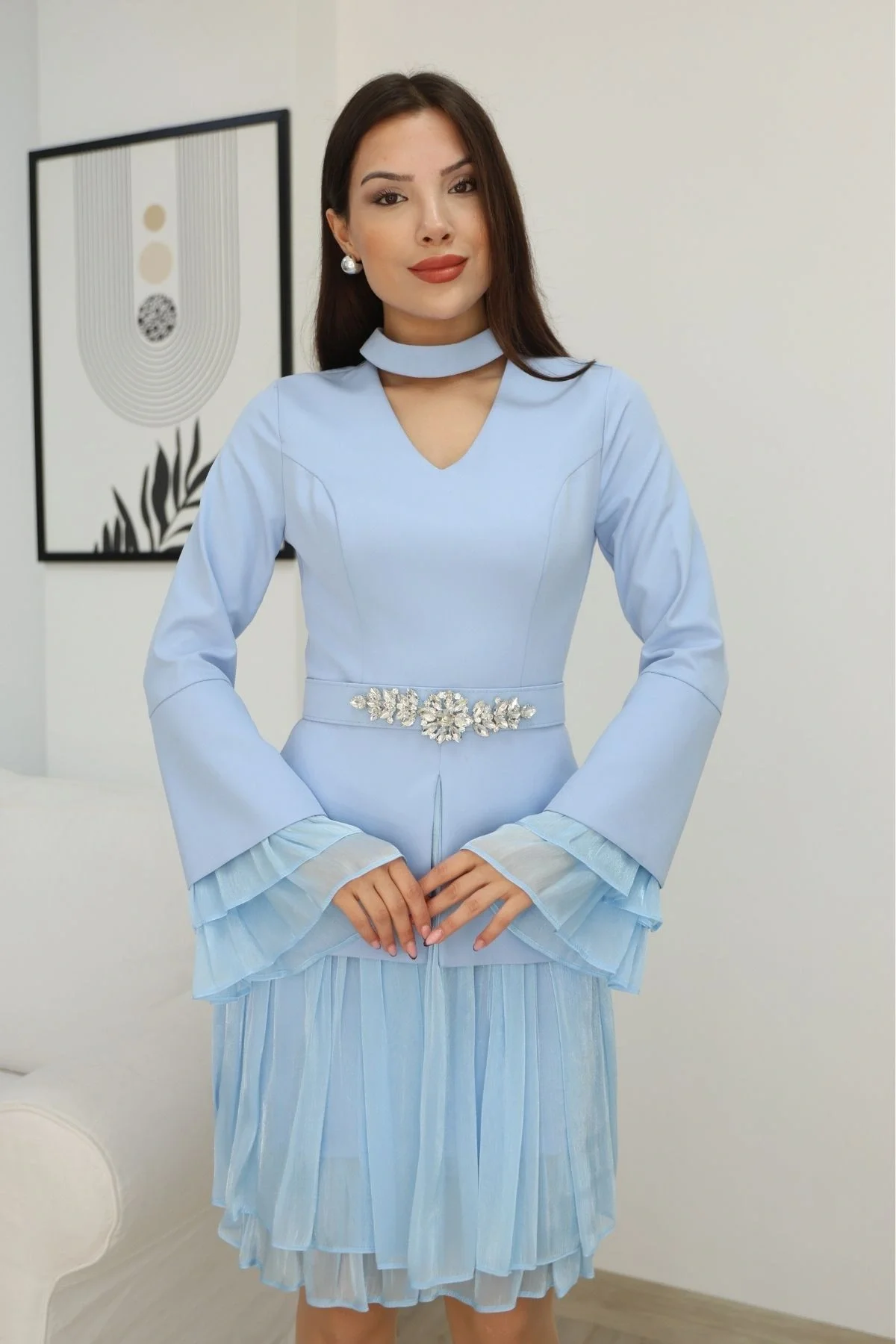 Elbise, modern ve zarif bir tasarımla dikkat çekiyor. V yaka kesimi ve kloş kollarıyla hareketlilik kazanırken, belindeki taşlı kemer detayı ile şık bir vurgu yapılmıştır. Eteğindeki katmanlar ise ürüne feminen ve akıcı bir görünüm katıyor.
