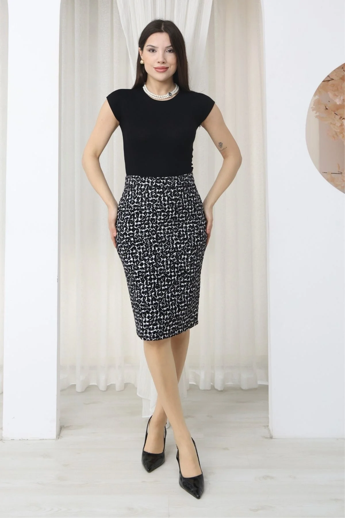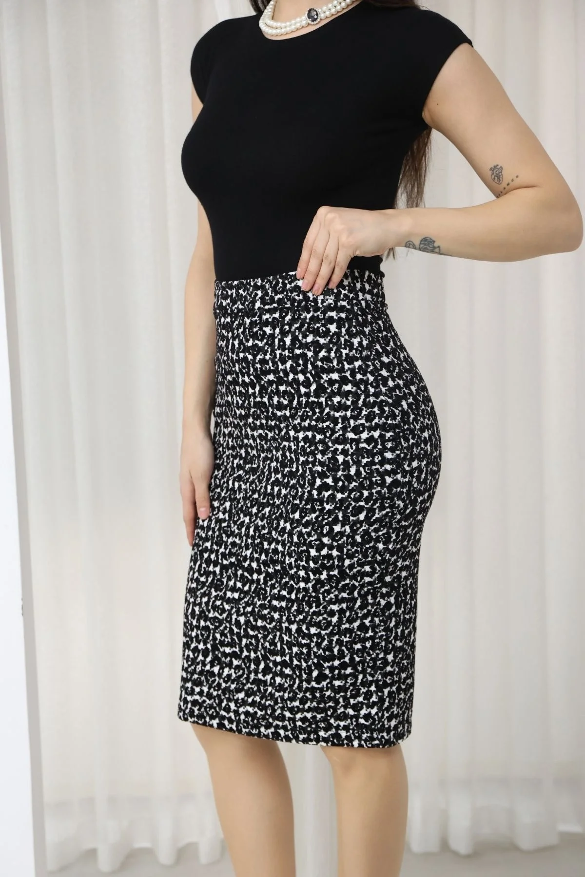 Flok Baskılı Kazayağı Desenli Midi Kalem Etek 6074-Siyah/Beyaz Kazayağı