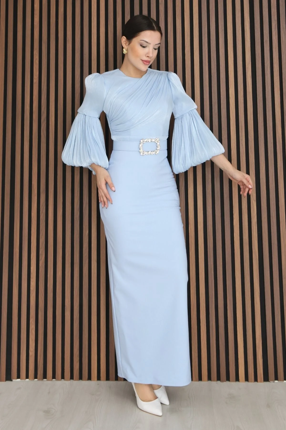 Göğüs Büzgü Detaylı Balon Kol Kalem Midi Elbise, Üst kısmındaki büzgü detayları vücuda kusursuz şekilde otururken, belirgin omuz formu ve hacimli pileli balon kollar modele güçlü bir siluet kazandırır. Bel kısmında yer alan taş detaylı kemer tokası tasarıma ışıltılı bir dokunuş katarken, düz ve akıcı etek kesimi boyu daha uzun ve dengeli gösterir. Şık topuklu ayakkabılarla kombinlendiğinde etkileyici ve feminen bir görünüm elde etmenizi sağlar.
