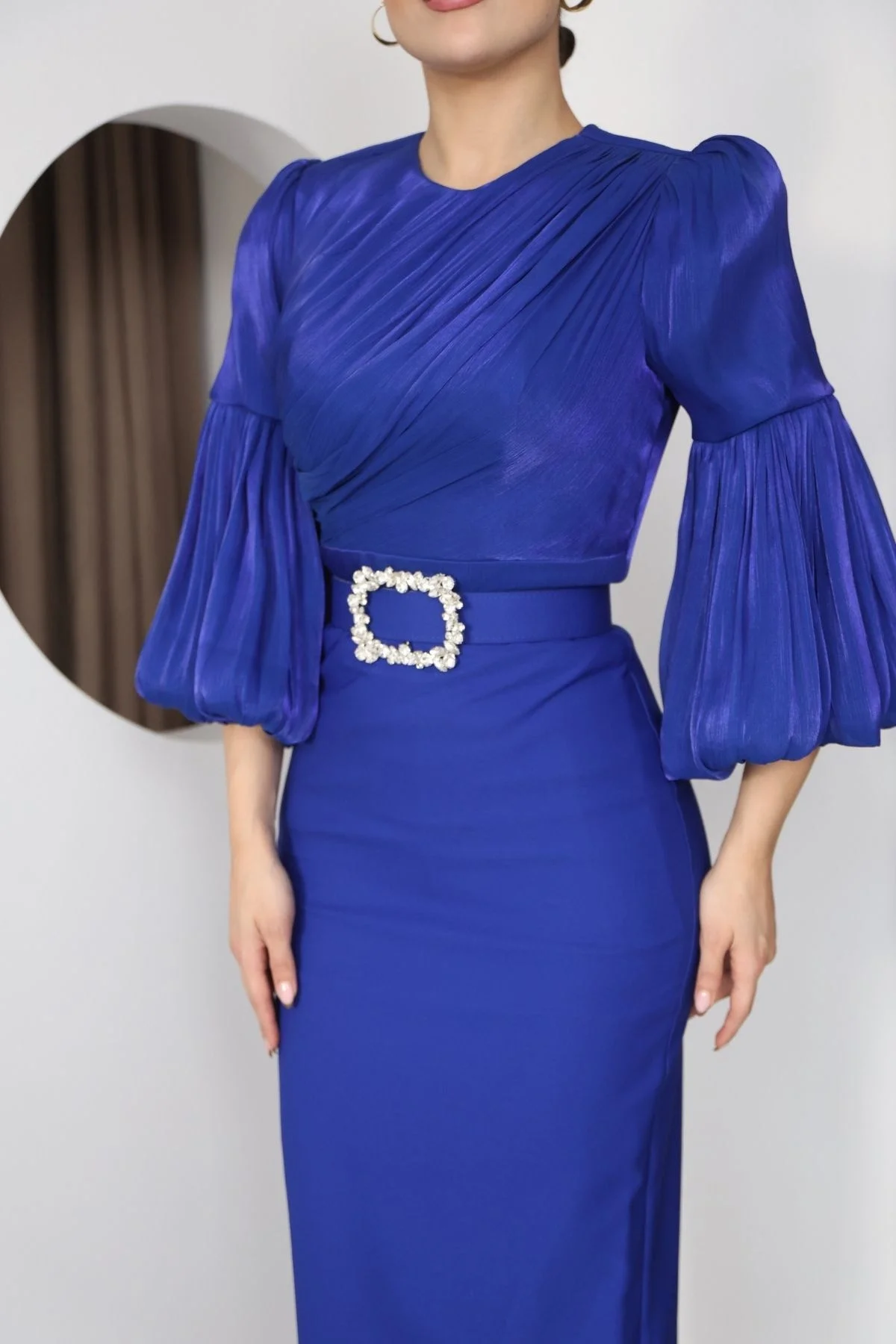 Göğüs Büzgü Detaylı Balon Kol Kalem Midi Elbise, Üst kısmındaki büzgü detayları vücuda kusursuz şekilde otururken, belirgin omuz formu ve hacimli pileli balon kollar modele güçlü bir siluet kazandırır. Bel kısmında yer alan taş detaylı kemer tokası tasarıma ışıltılı bir dokunuş katarken, düz ve akıcı etek kesimi boyu daha uzun ve dengeli gösterir. Şık topuklu ayakkabılarla kombinlendiğinde etkileyici ve feminen bir görünüm elde etmenizi sağlar.