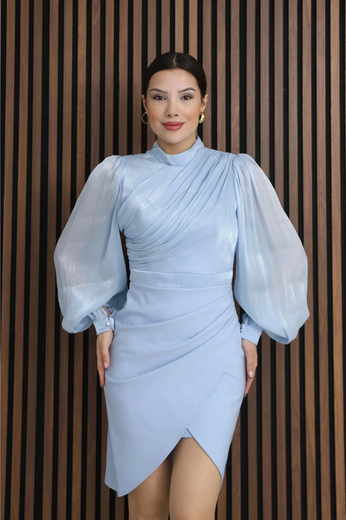 Göğüs Büzgülü Balon Kol Pileli Mini Elbise 2289-Bebe Mavisi