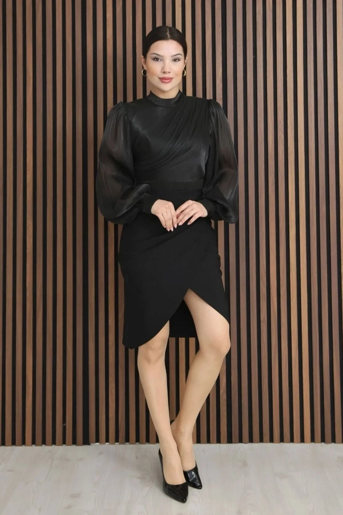 Feminen detaylarıyla öne çıkan bu mini elbise, zarif ama dikkat çekici bir görünüm sunar. Büzgülü göğüs tasarımı elbiseye zarif bir hareket ve dikkat çekici bir görünüm kazandırırken, hacimli balon kollar tasarıma iddialı bir karakter katar. Double Face ve Şifon kumaşların uyumu sayesinde hem güçlü hem zarif bir stil sunan bu model, akıcı etek yapısıyla şıklığı tamamlar.