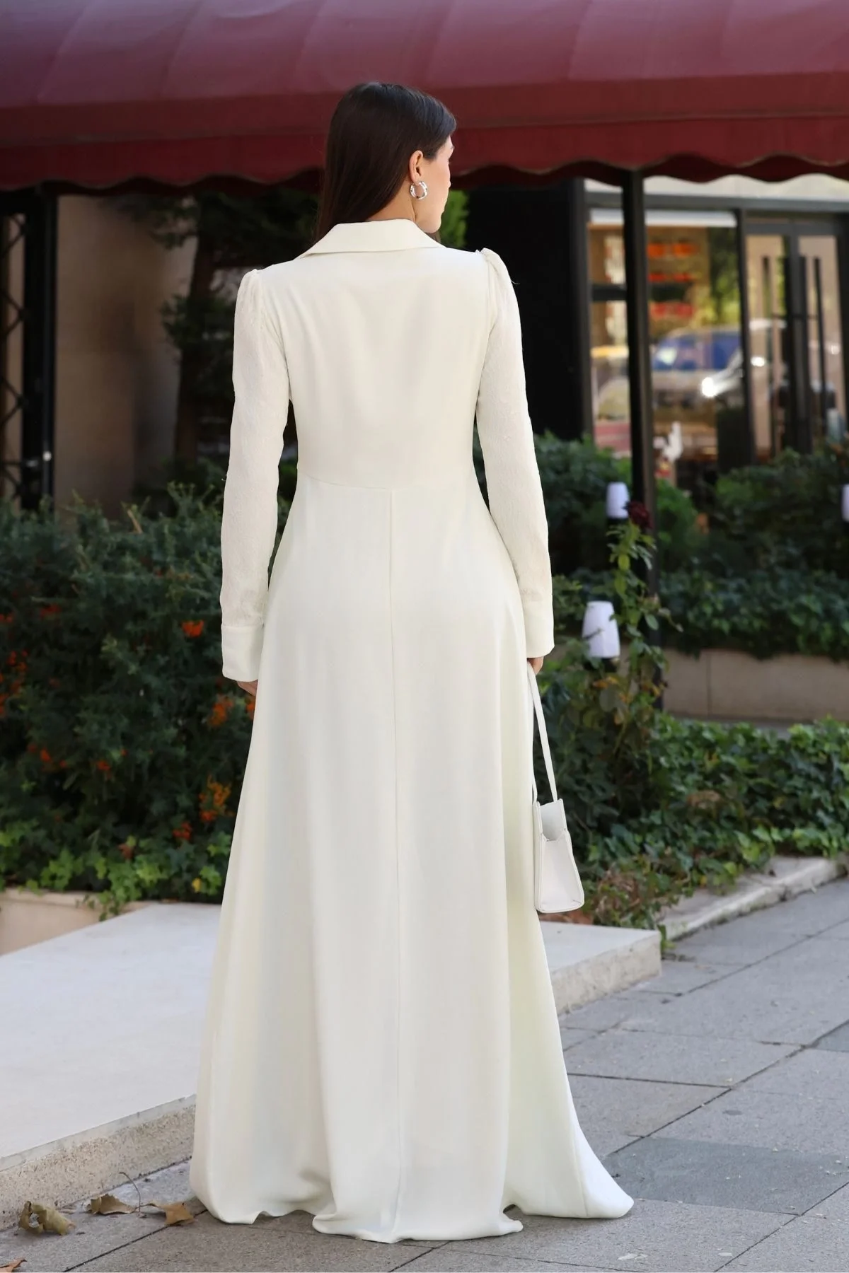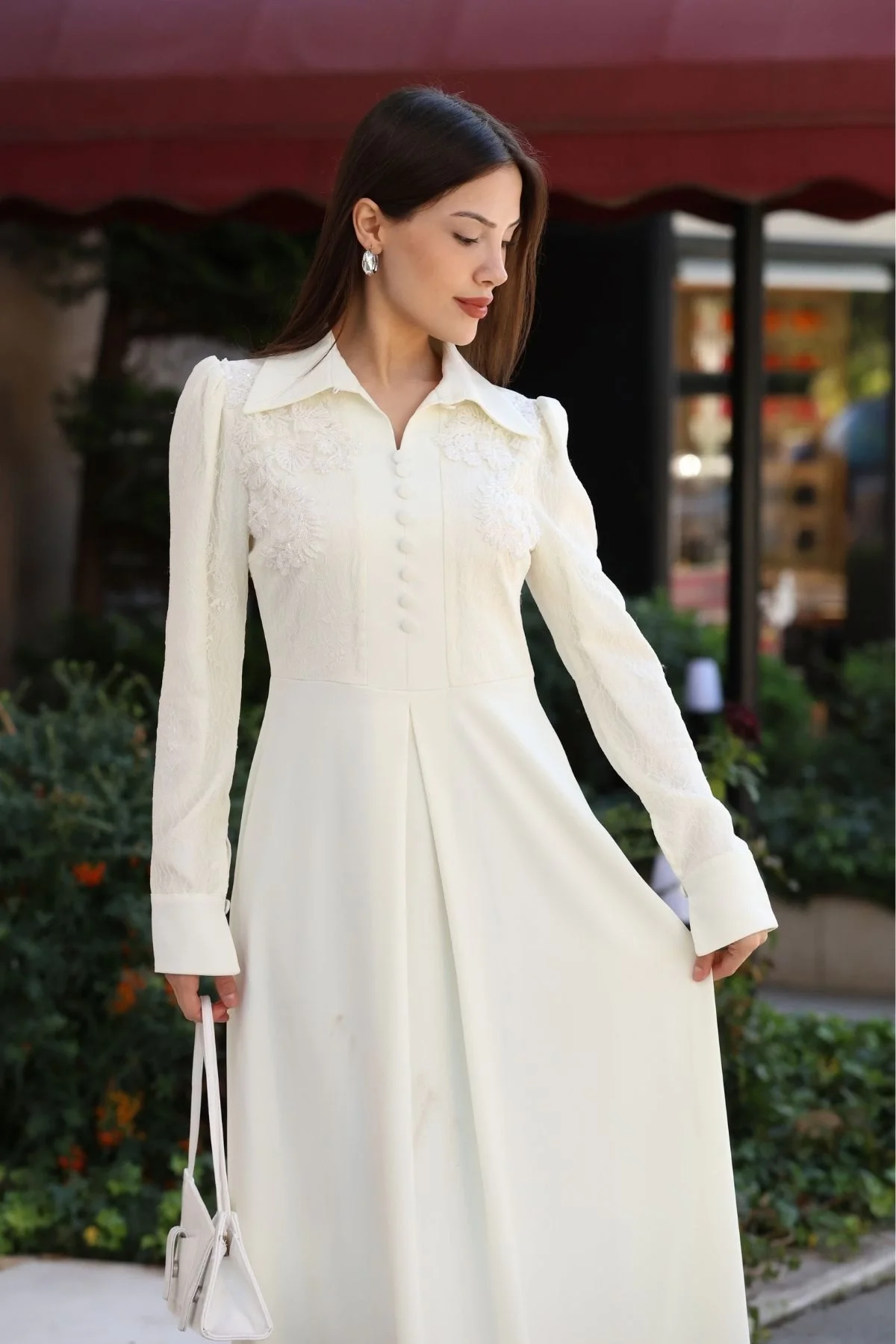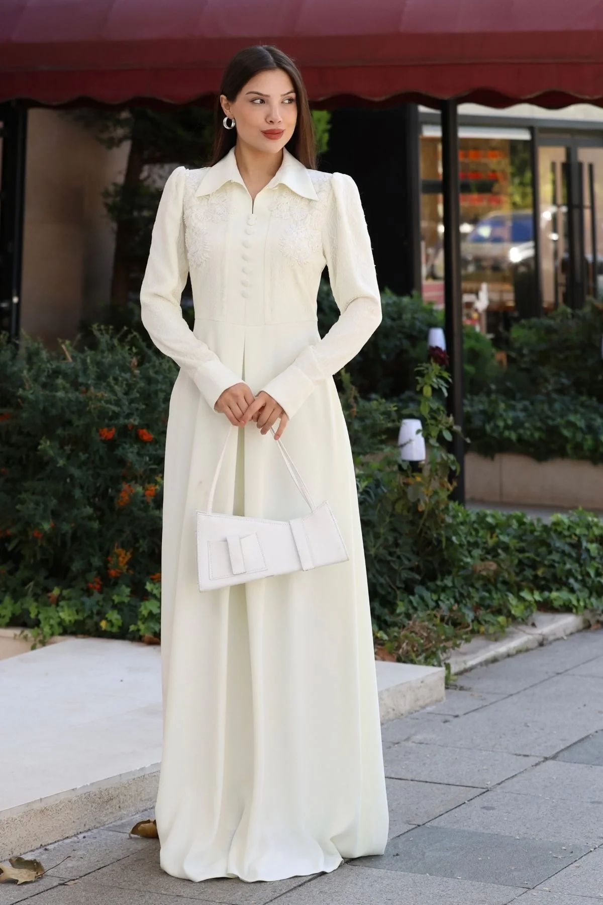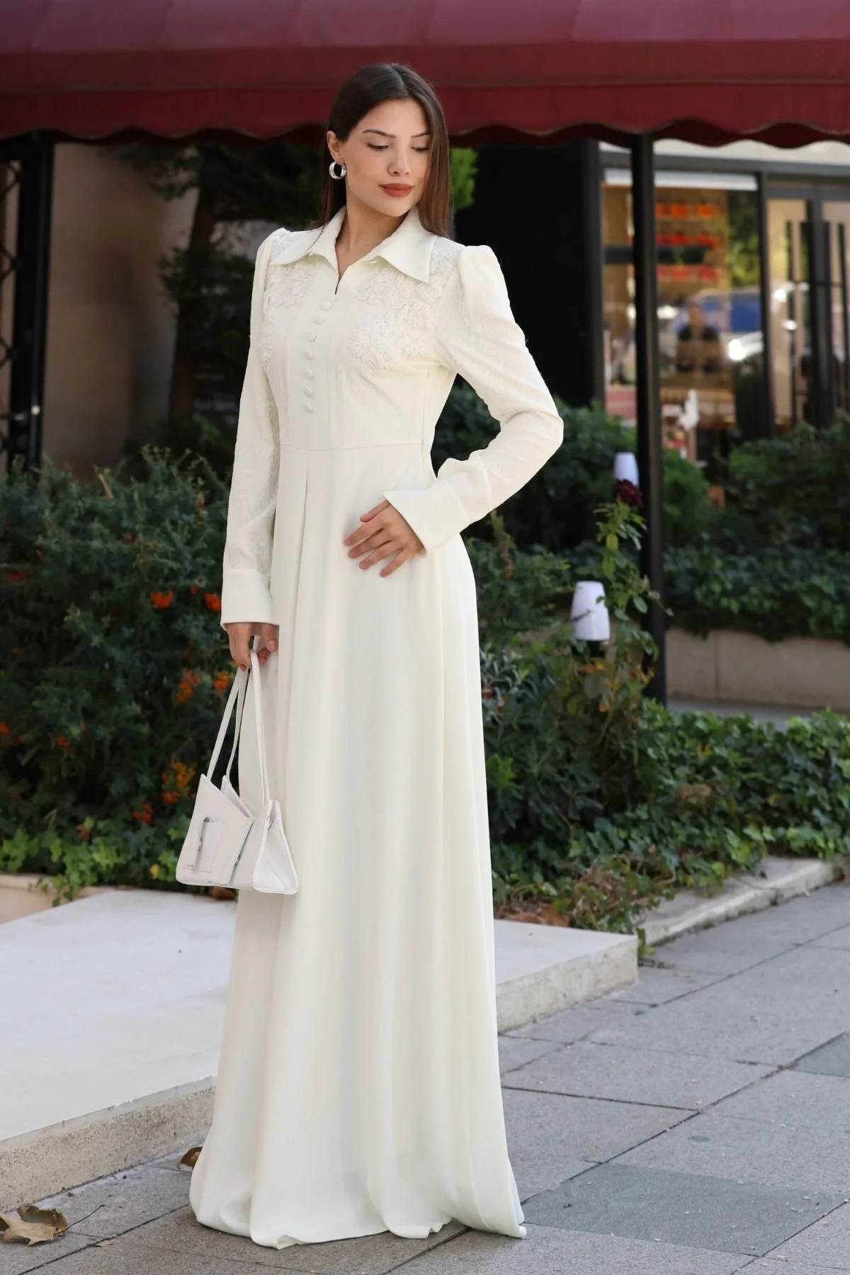 Gömlek Yaka Dantel İşleme ve Kaplamalı Kemerli Abiye Elbise 2764-Ekru