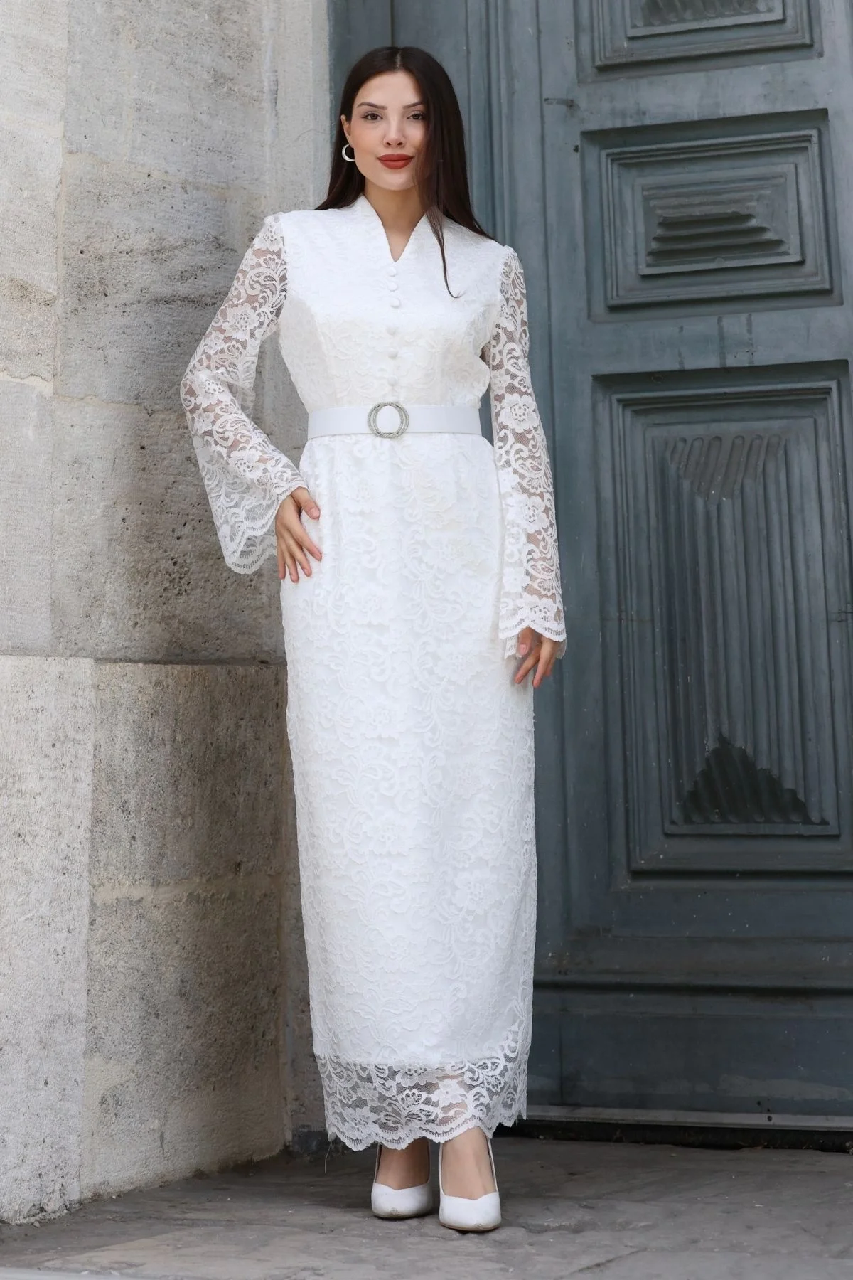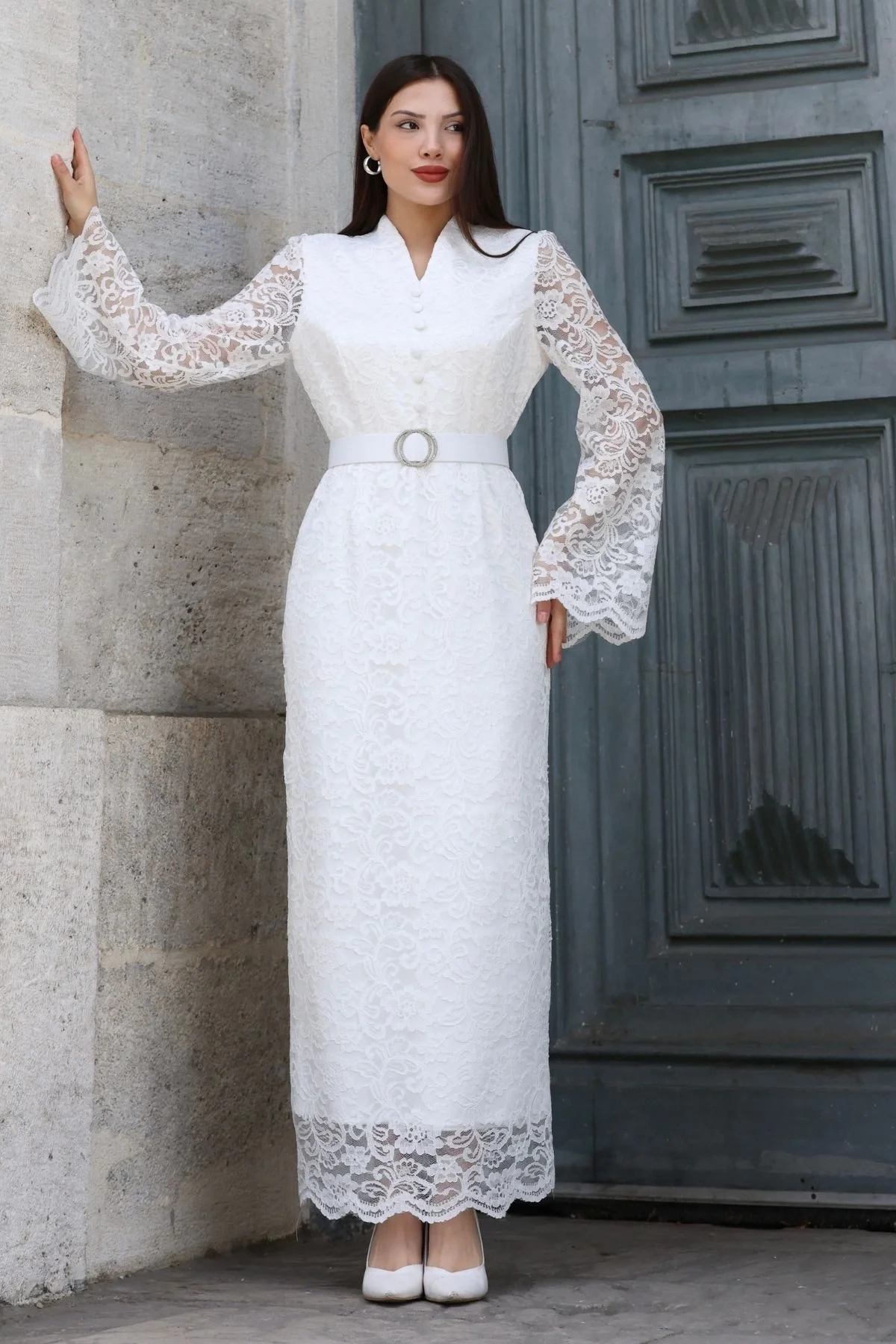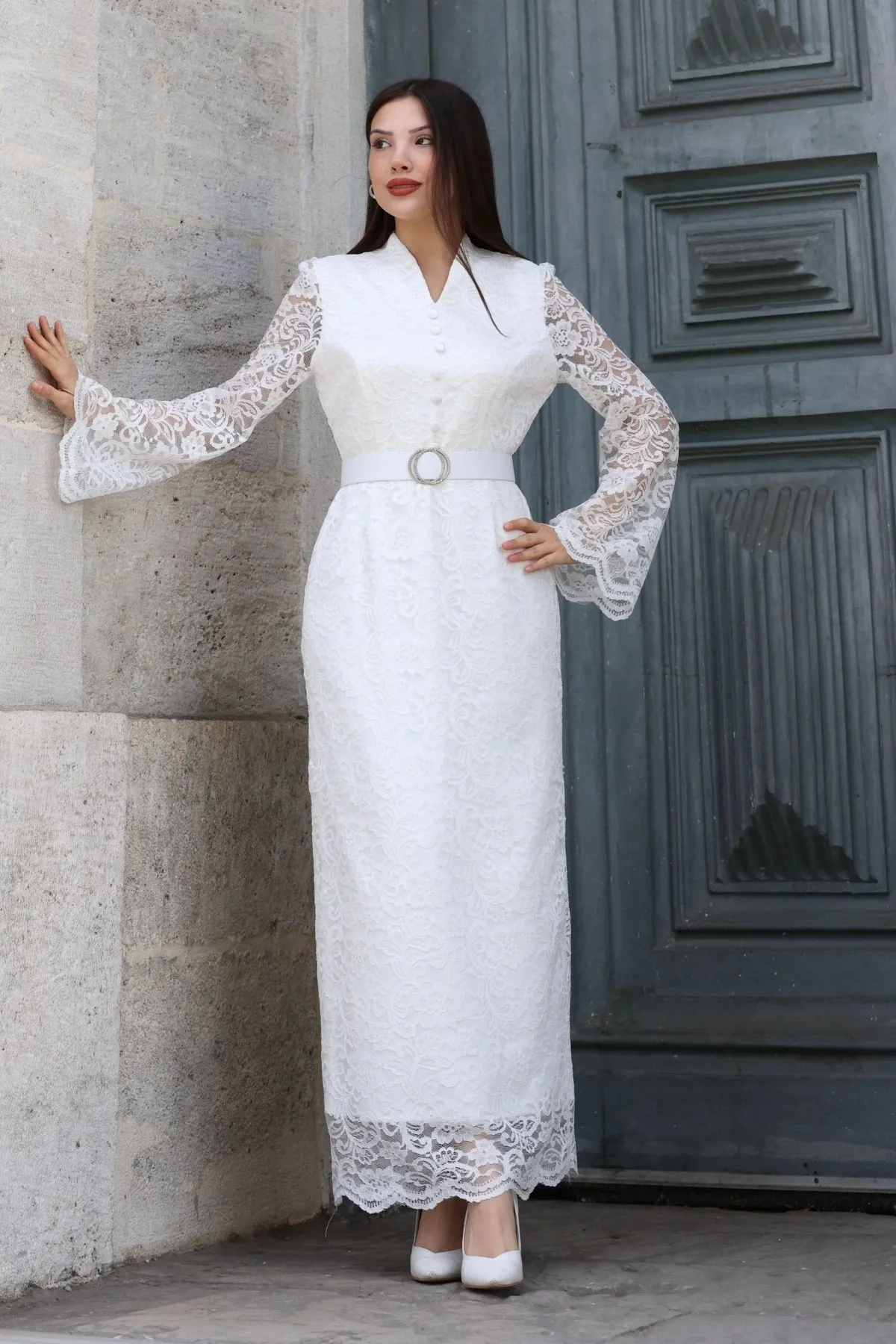 Hakim Yaka Kemerli Dantel Maxi Abiye Elbise 6032-Beyaz
