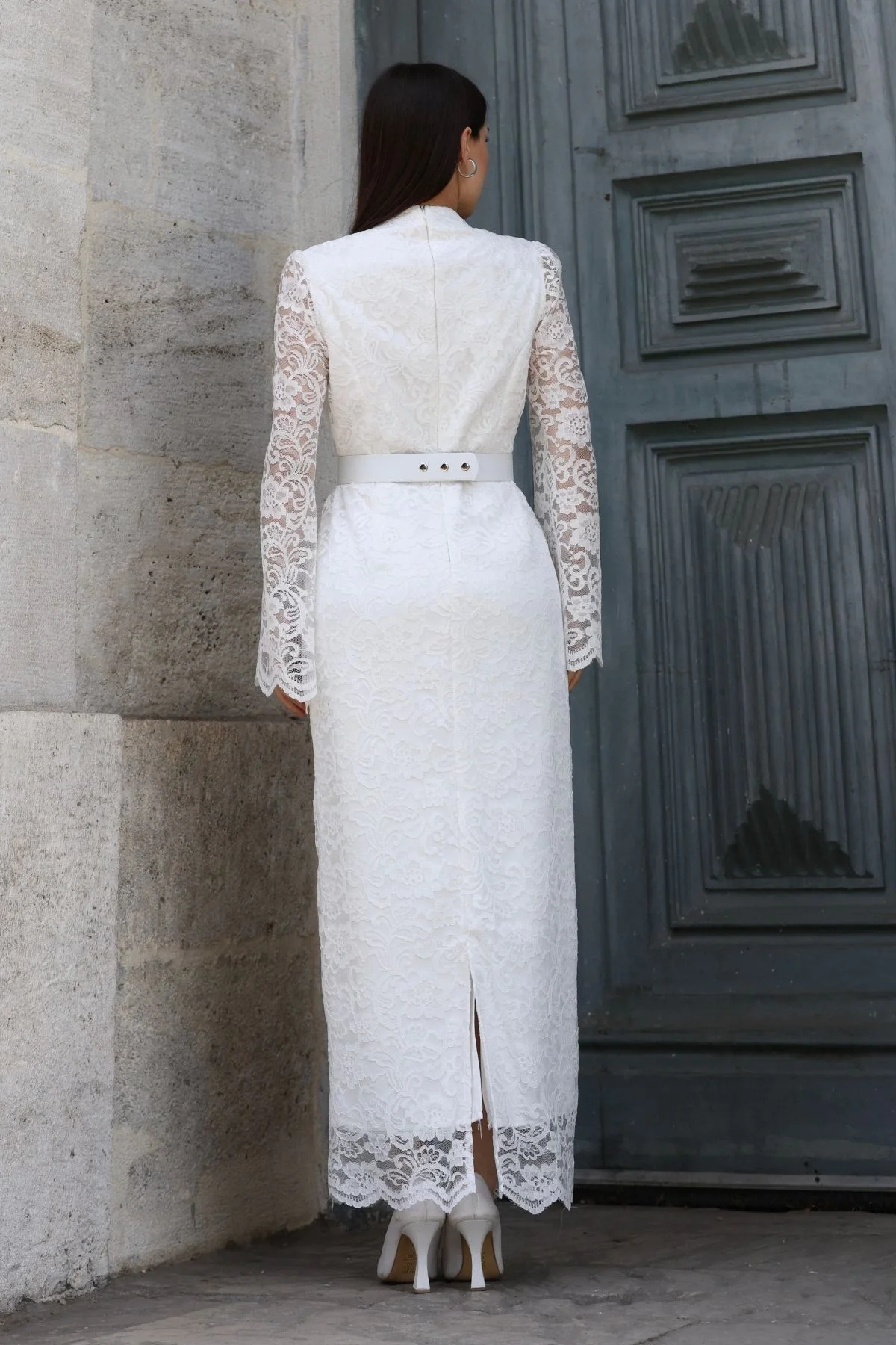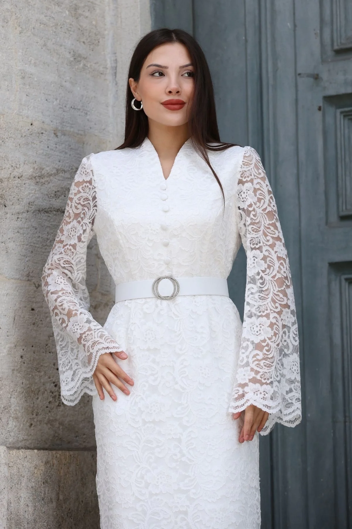 Asil rengi ve zamansız dantel dokusuyla dikkat çeken bu maxi boy elbise, özel davetlerinizde modern bir şıklık vadediyor. Hakim yaka ve uzun, çan formundaki kol kesimi modern bir zarafet sunarken, vücuda oturan kalıbı ve beli vurgulayan kalın kemer, kusursuz bir silüet yaratır.
