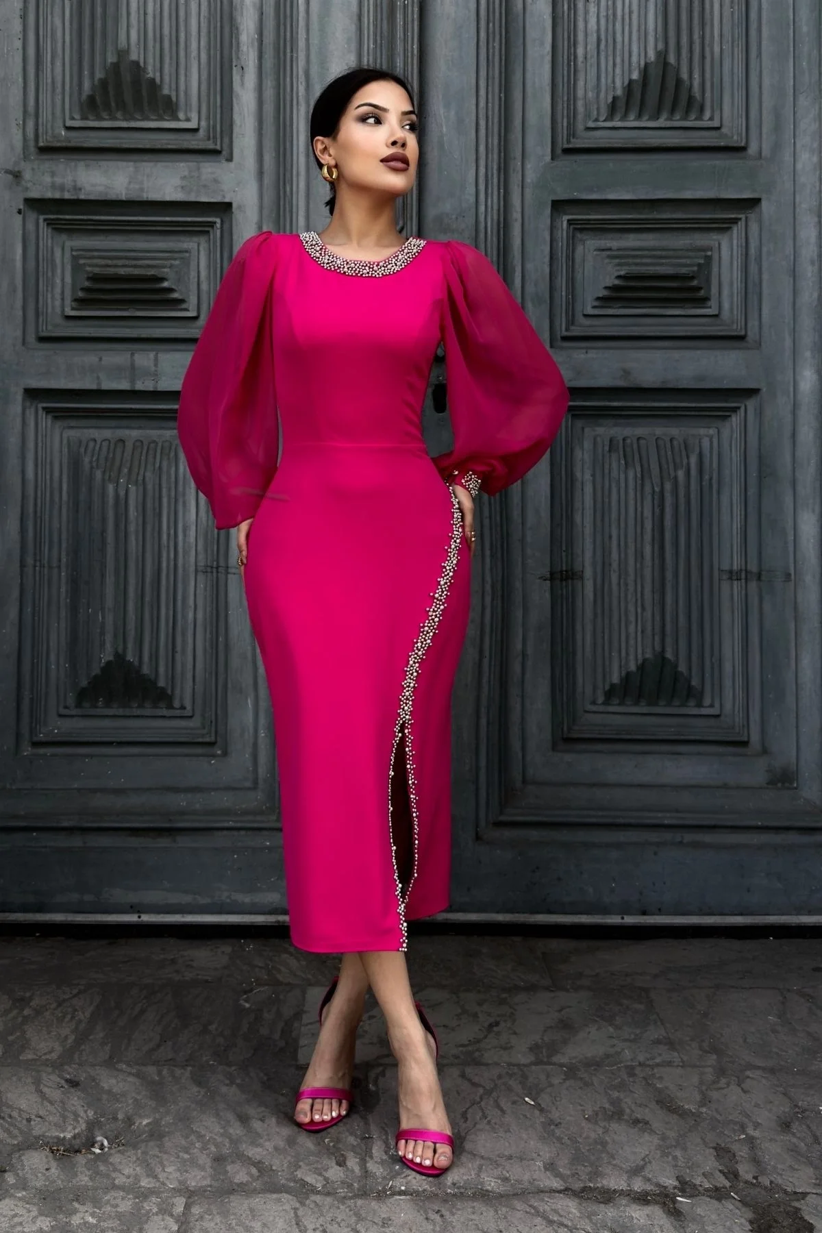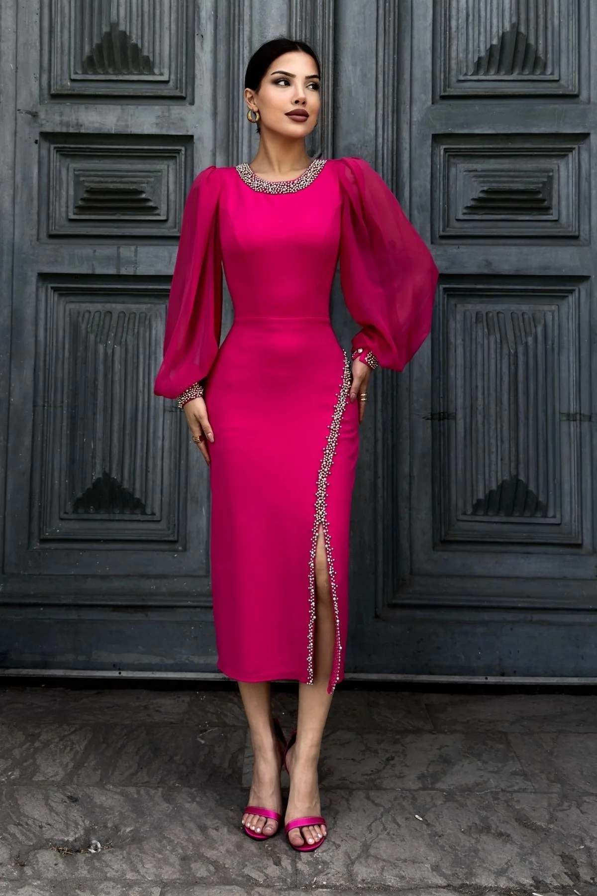İnci Süsleme Detaylı Yırtmaçlı Abiye Elbise 2223-Fuşya