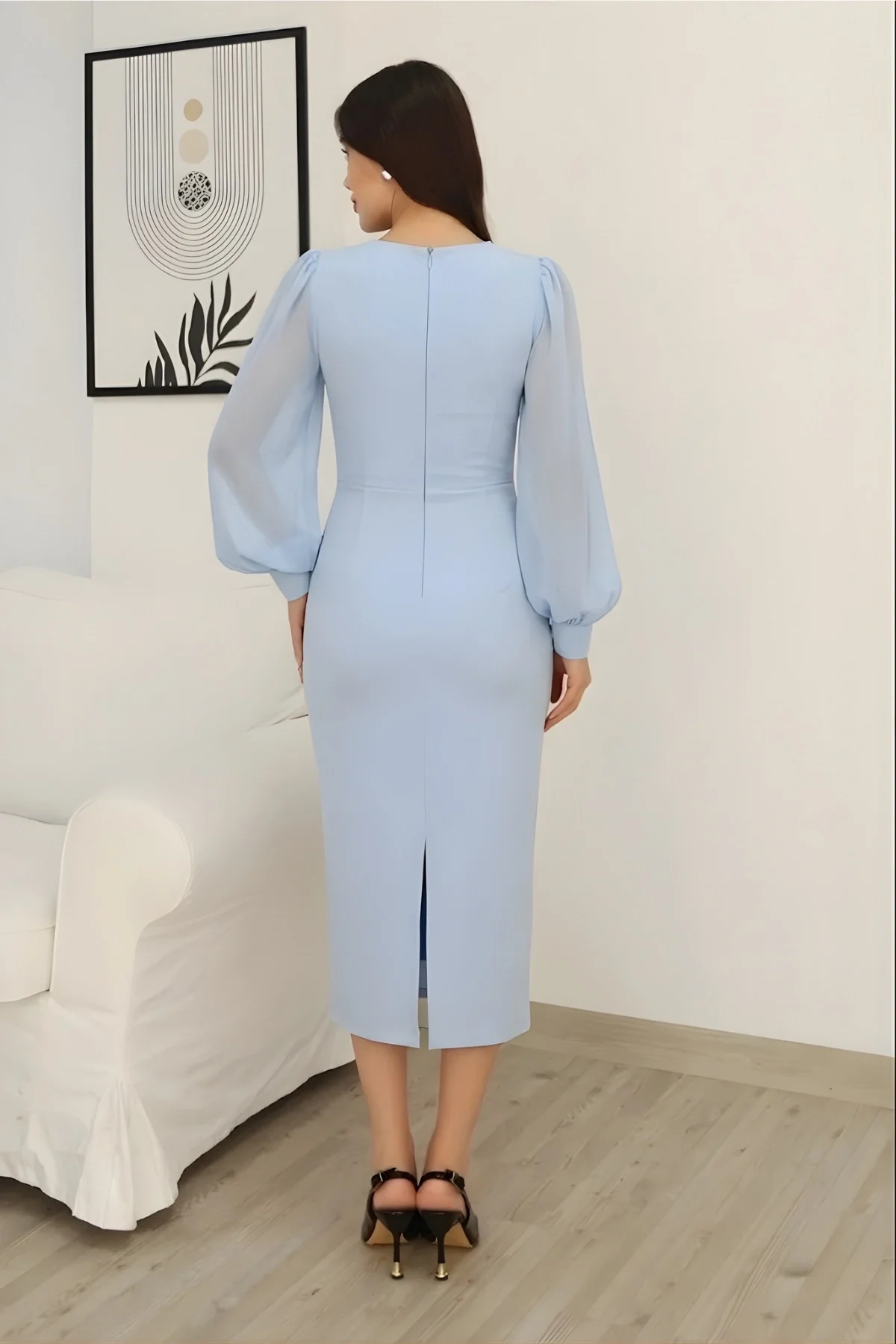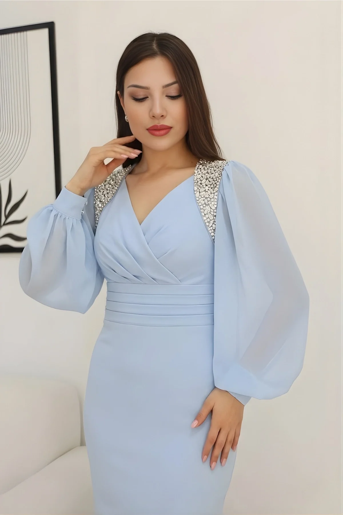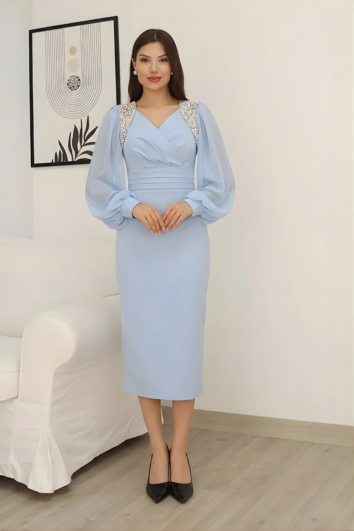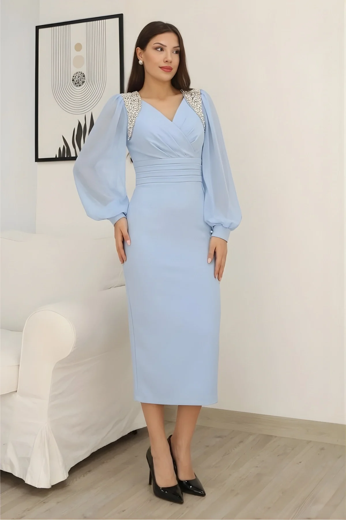 İşlemeli Omuz Detaylı Balon Kollu Kruvaze Yaka Midi Elbise 2326/1-Bebe Mavisi
