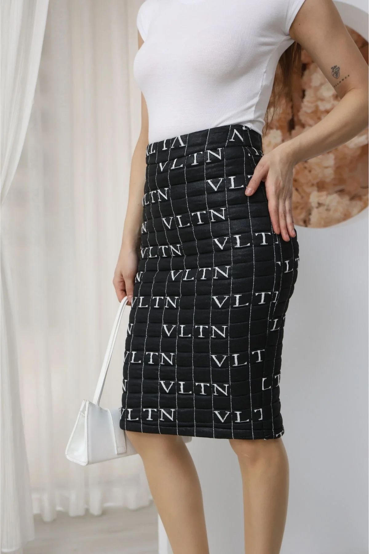 Kapitone midi kalem etek, vücuda oturan formu ve yüksek bel kesimiyle zarif ve toparlayıcı bir siluet sunar. Gün boyu konforlu kullanım sağlarken güçlü ve iddialı bir görünüm kazandırır. Kapitone dokusu ve dikkat çekici desen yapısıyla klasik kalem eteğe dinamik bir hava katar. Diz altı midi boyu sayesinde hem ofiste hem günlük kombinlerde rahatlıkla tercih edilebilir.