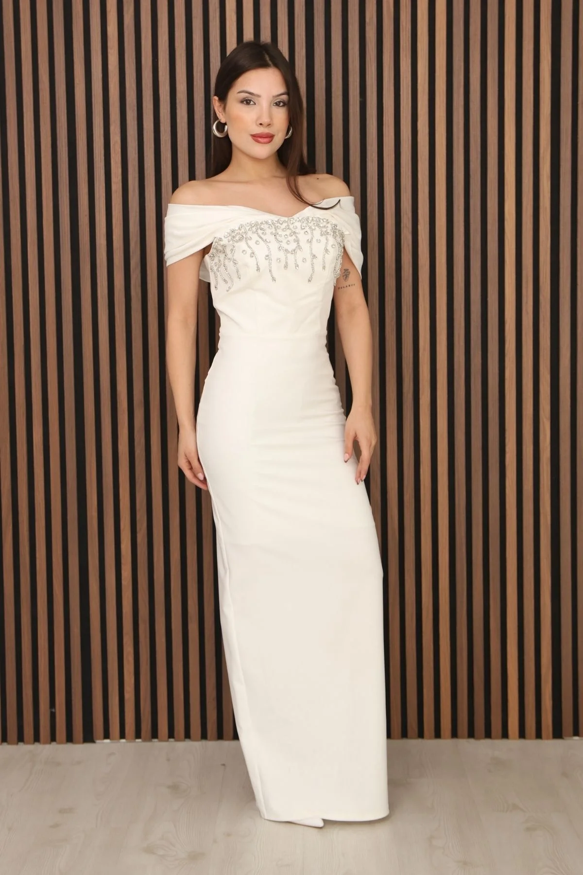 Kayık Yaka Taş İşlemeli Uzun Balık Abiye Elbise, omuzları zarif şekilde ortaya çıkaran kayık yaka kesimi ve vücudu saran balık formuyla dikkat çekici bir görünüm sunar. Göğüs bölümündeki ışıltılı taş işlemeler tasarıma şık bir vurgu katarak davet stilini öne çıkarır. Toparlayıcı ve esnek kumaşı sayesinde bedene uyum sağlayarak gün boyu konforlu kullanım sunar. Sade formu ile dengeli bir şıklık oluştururken özel günlerde güçlü bir duruş kazandırır.