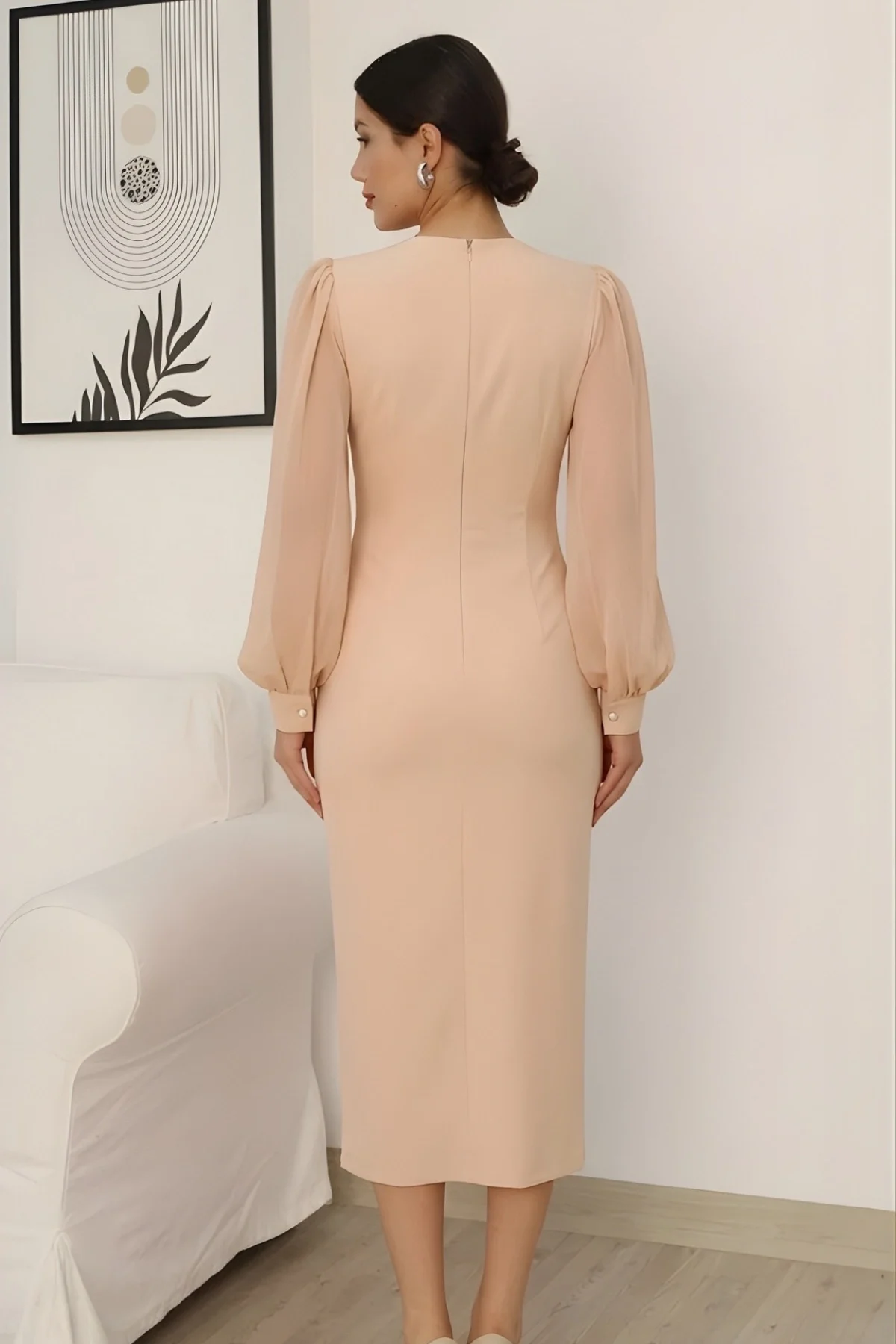 Zarif kruvaze kesimi ve formu vurgulayan şık siluetiyle özel davetlerde modern bir şıklık sunar. Şifon balon kollar tasarıma hafif ve akıcı bir dokunuş katarken, önden geçen taş işleme hattı elbiseye göz alıcı bir hareket kazandırır. Rahat yapısı ve zarif yırtmacıyla hem konforlu hem de iddialı bir görünüm elde etmenizi sağlayan zamansız bir modeldir.