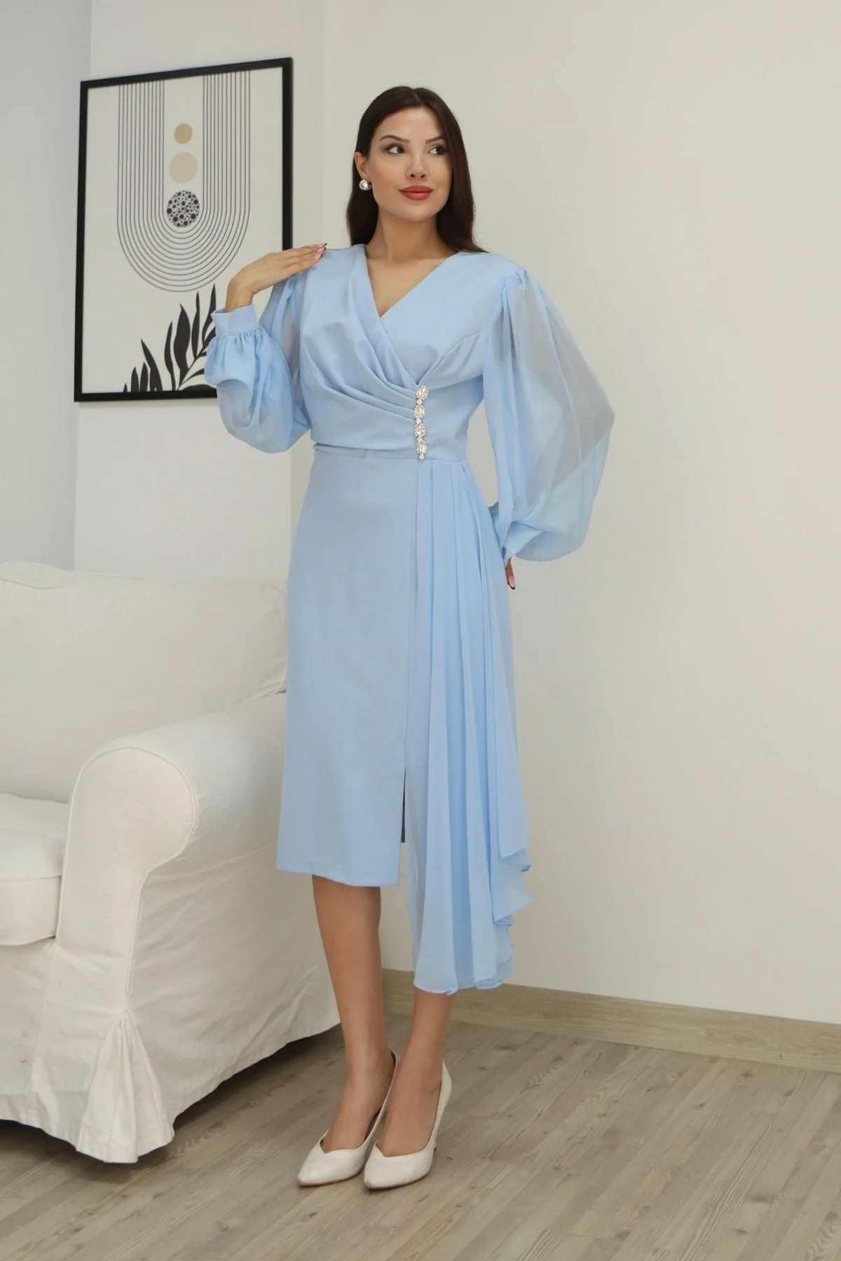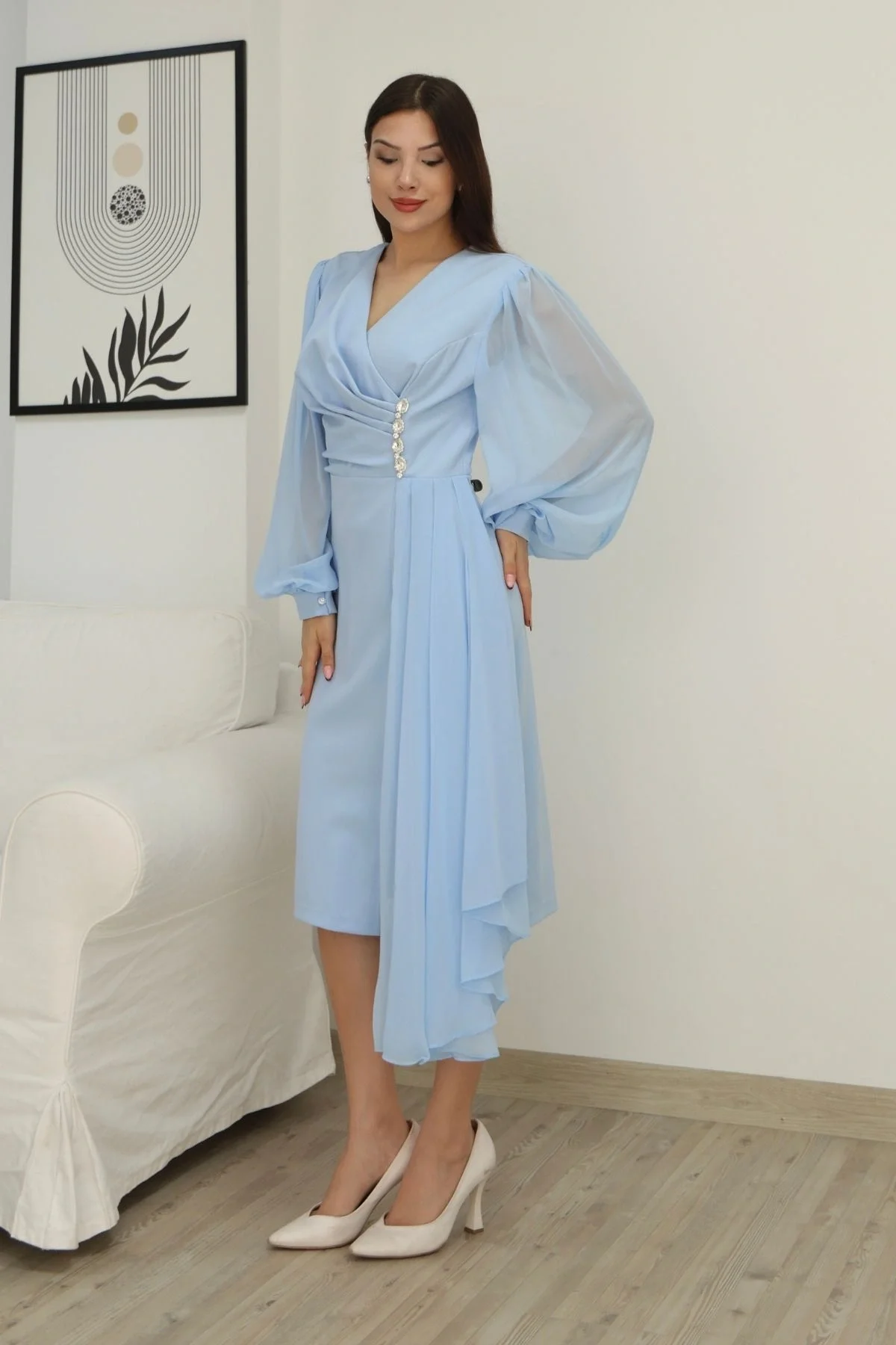 Kruvaze Yaka Bel Şifon Detaylı Balon Kol Abiye Elbise 2263-Bebe Mavisi