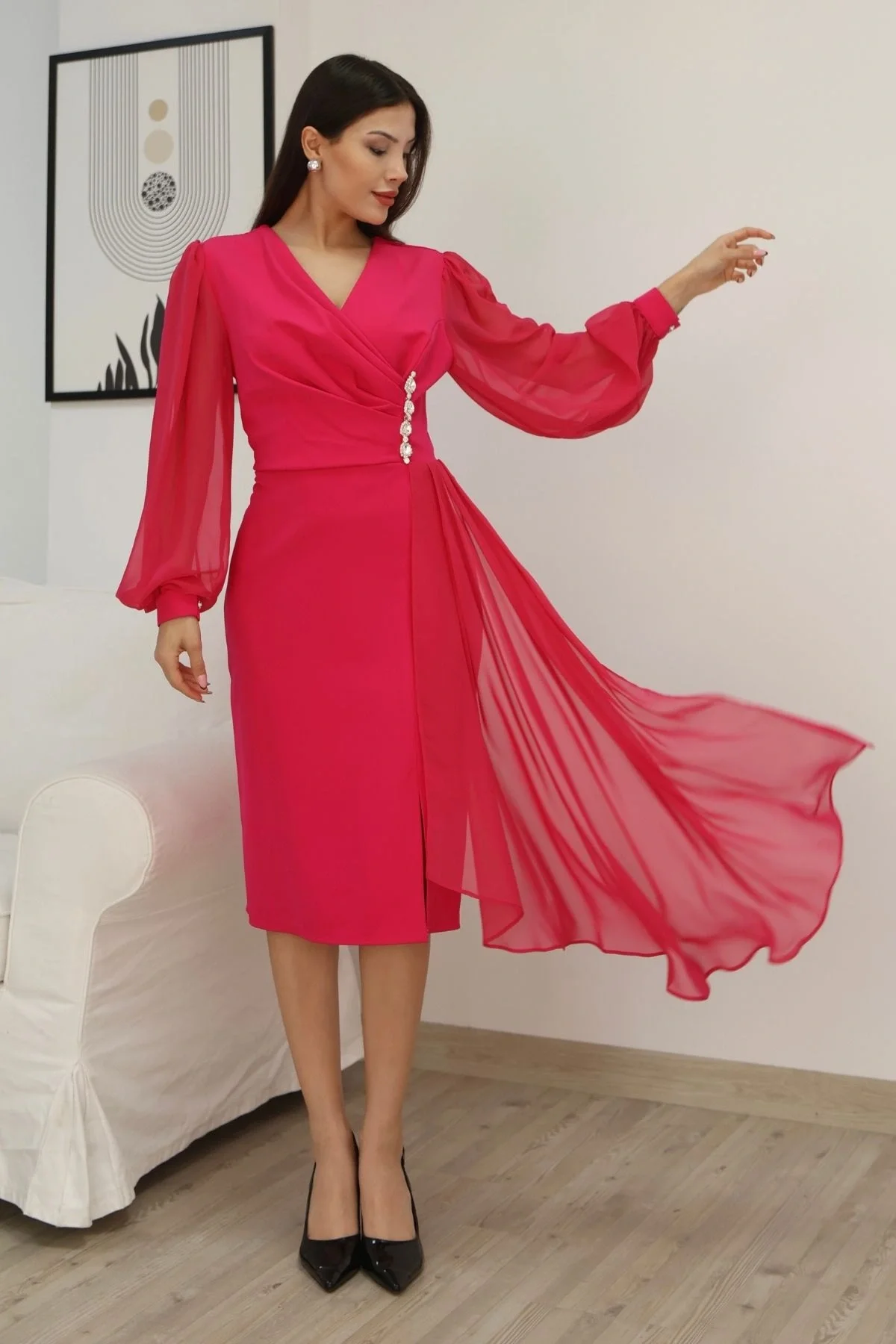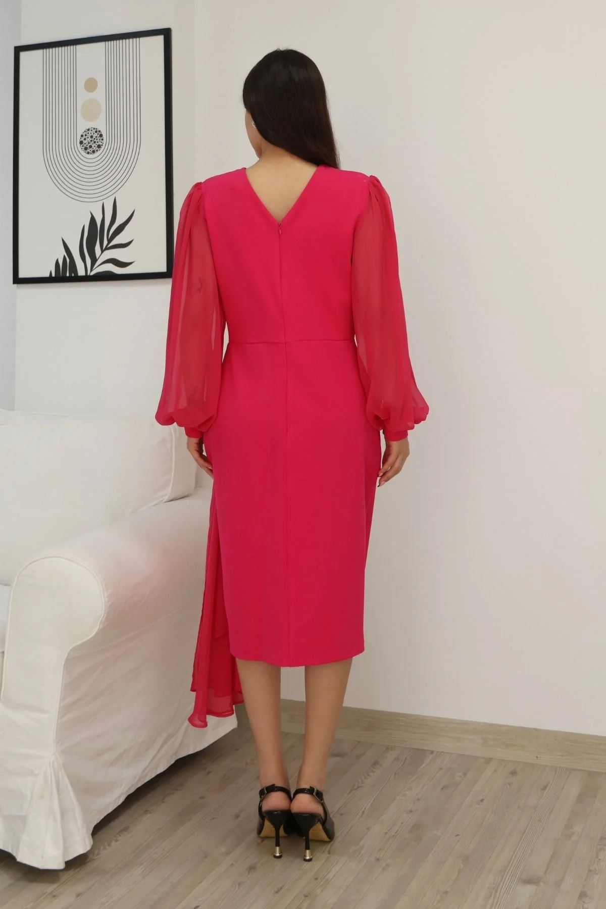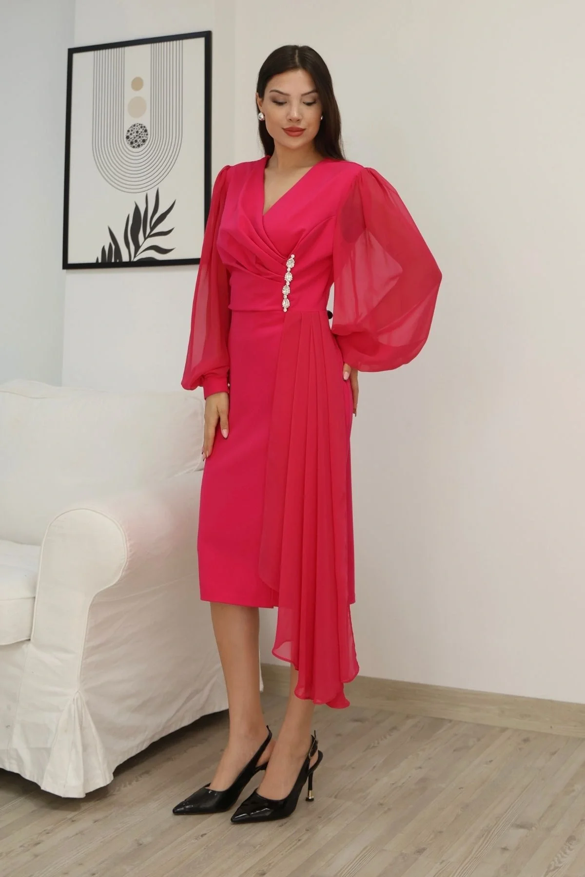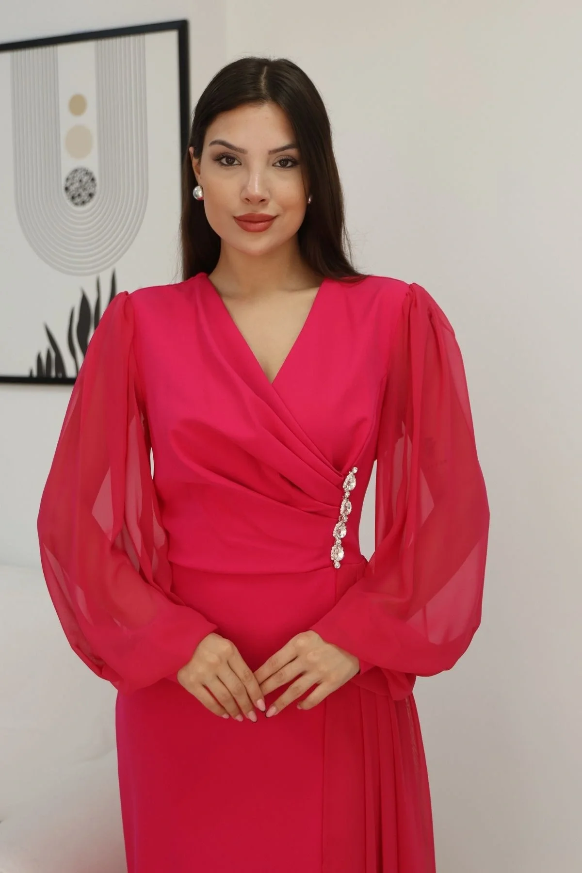 Kruvaze Yaka Bel Şifon Detaylı Balon Kol Abiye Elbise 2263-Fuşya