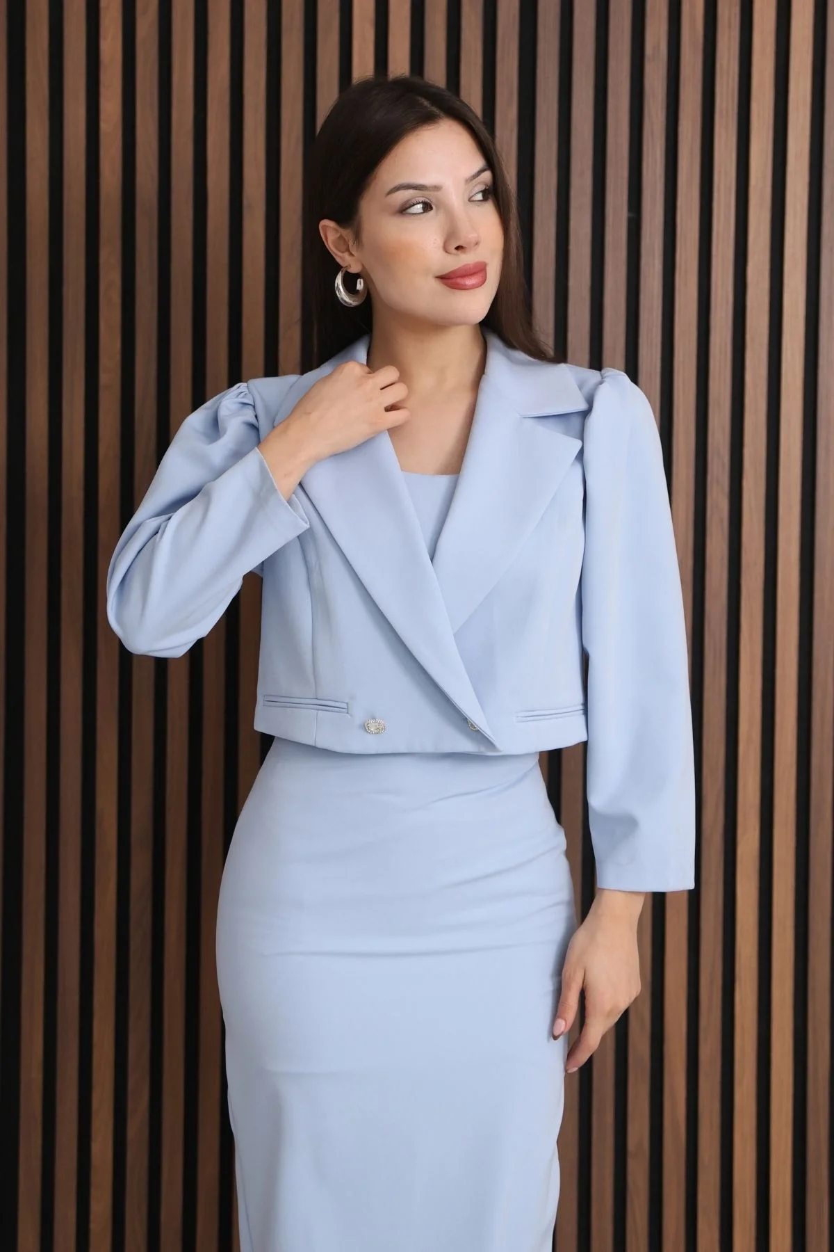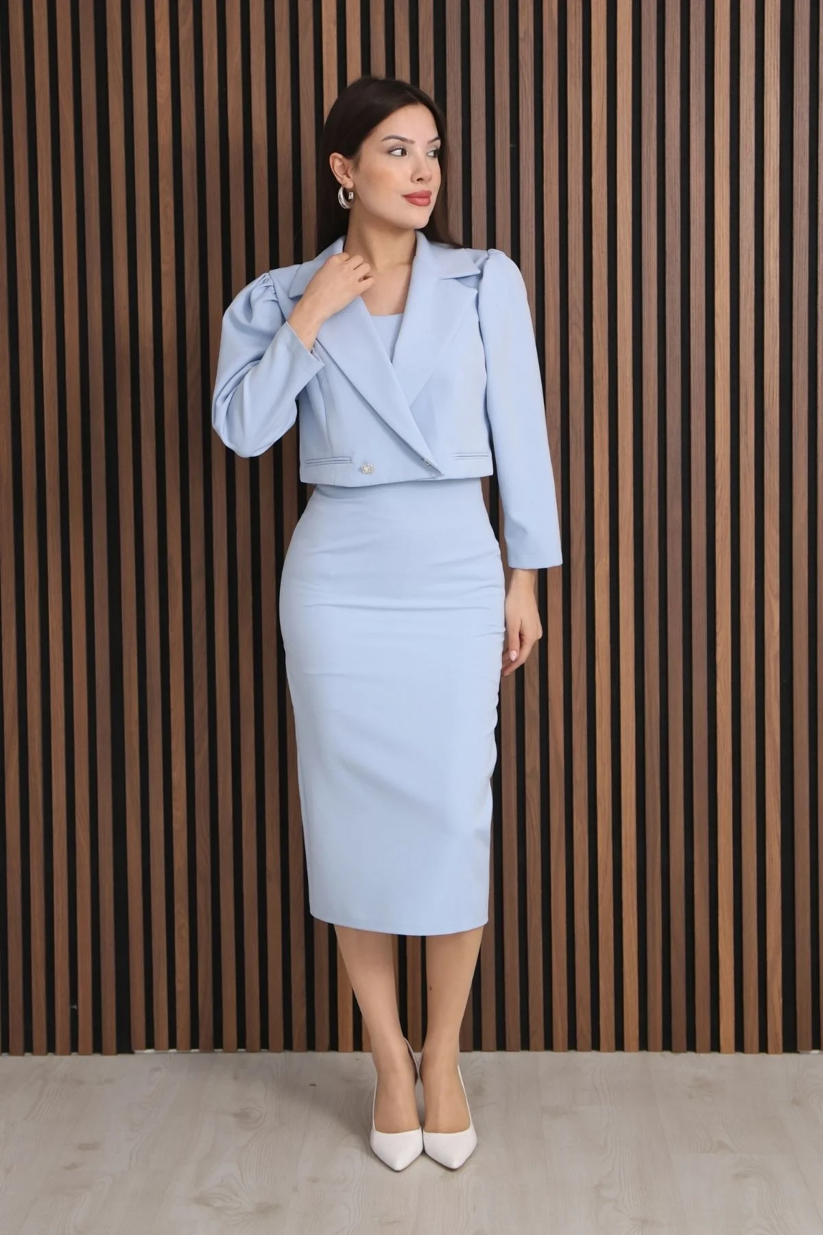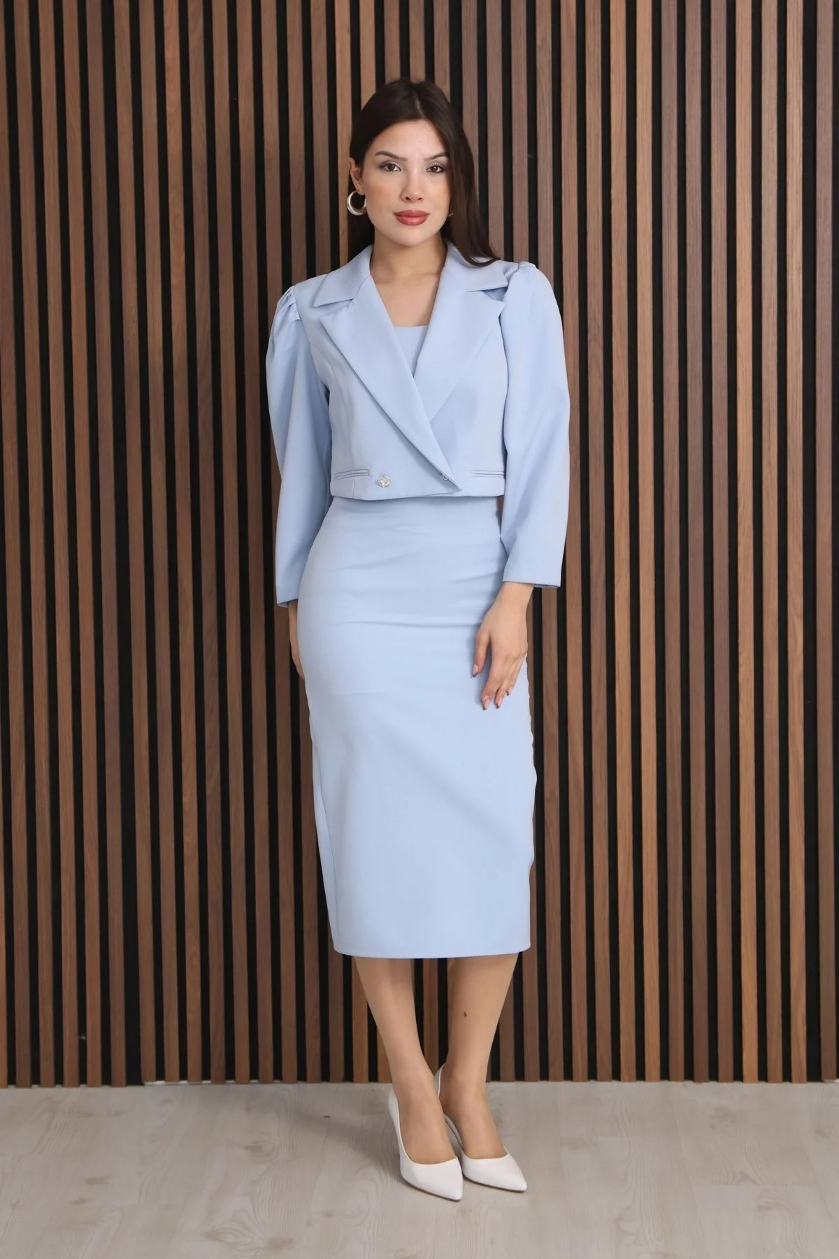 Kruvaze Yaka Crop Ceketli Kalem Elbise Takım 2291-Bebe Mavisi