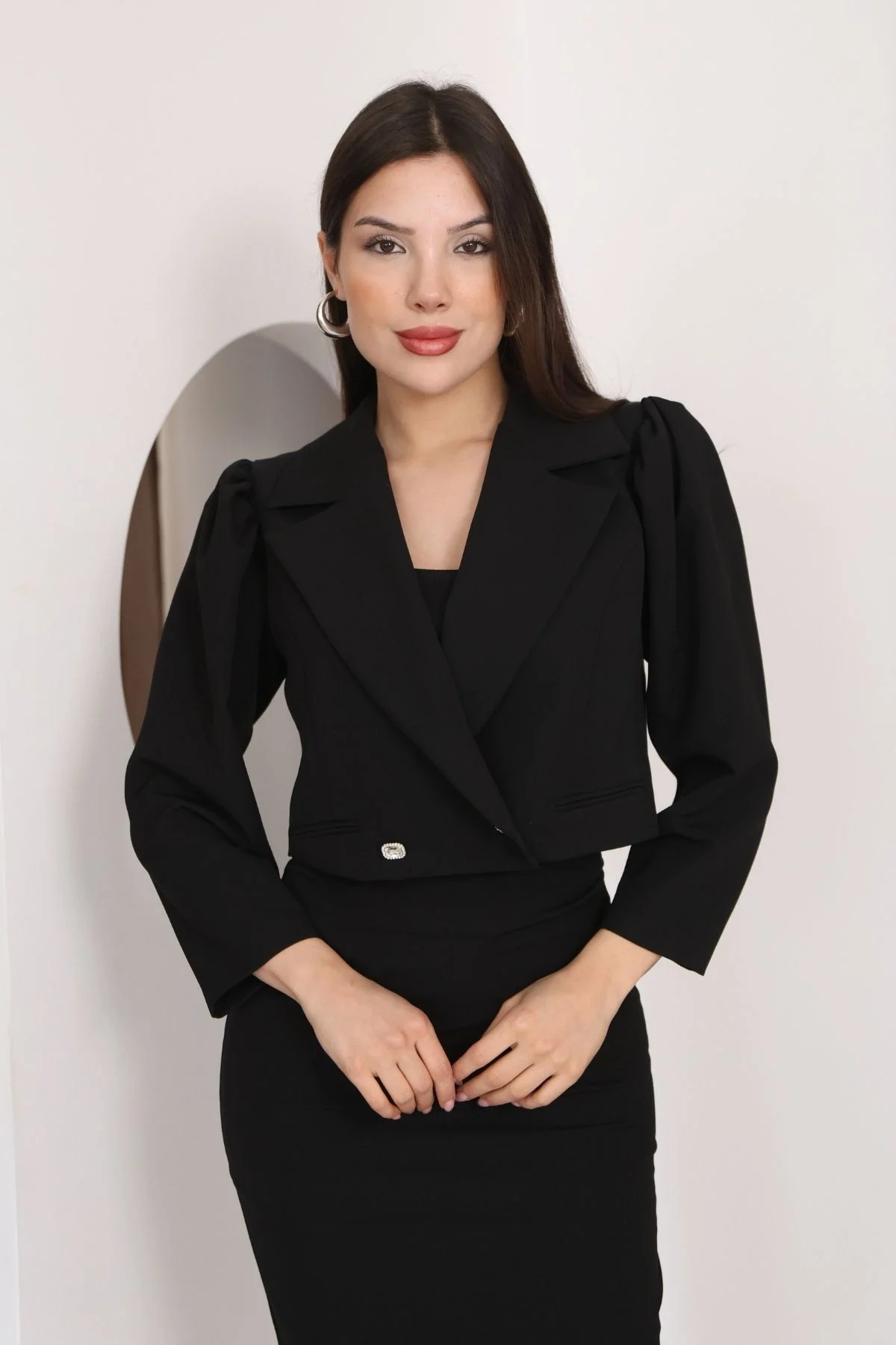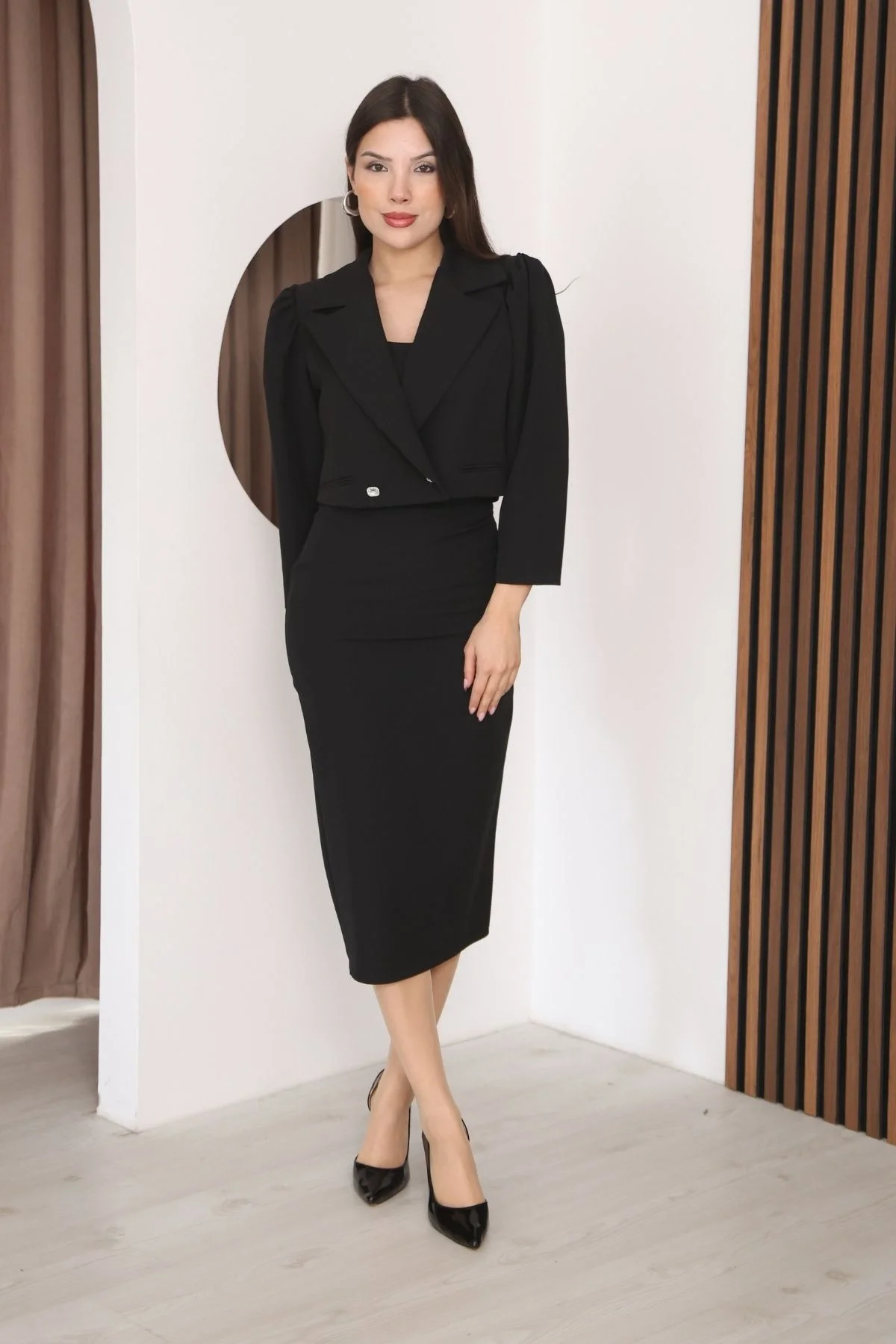 Kruvaze Yaka Crop Ceketli Kalem Elbise Takım, net hatları ve dengeli kesimiyle zarif bir görünüm sunar. Vücudu saran kalem elbise formu sade bir şıklık oluştururken kısa kruvaze ceket tasarıma modern bir hava katar. tok ve toparlayıcı kumaşı sayesinde gün boyu konforlu kullanım sağlar. Hem ofis stilinde hem davetlerde rahatlıkla tercih edilebilecek çok yönlü bir kombin sunar.