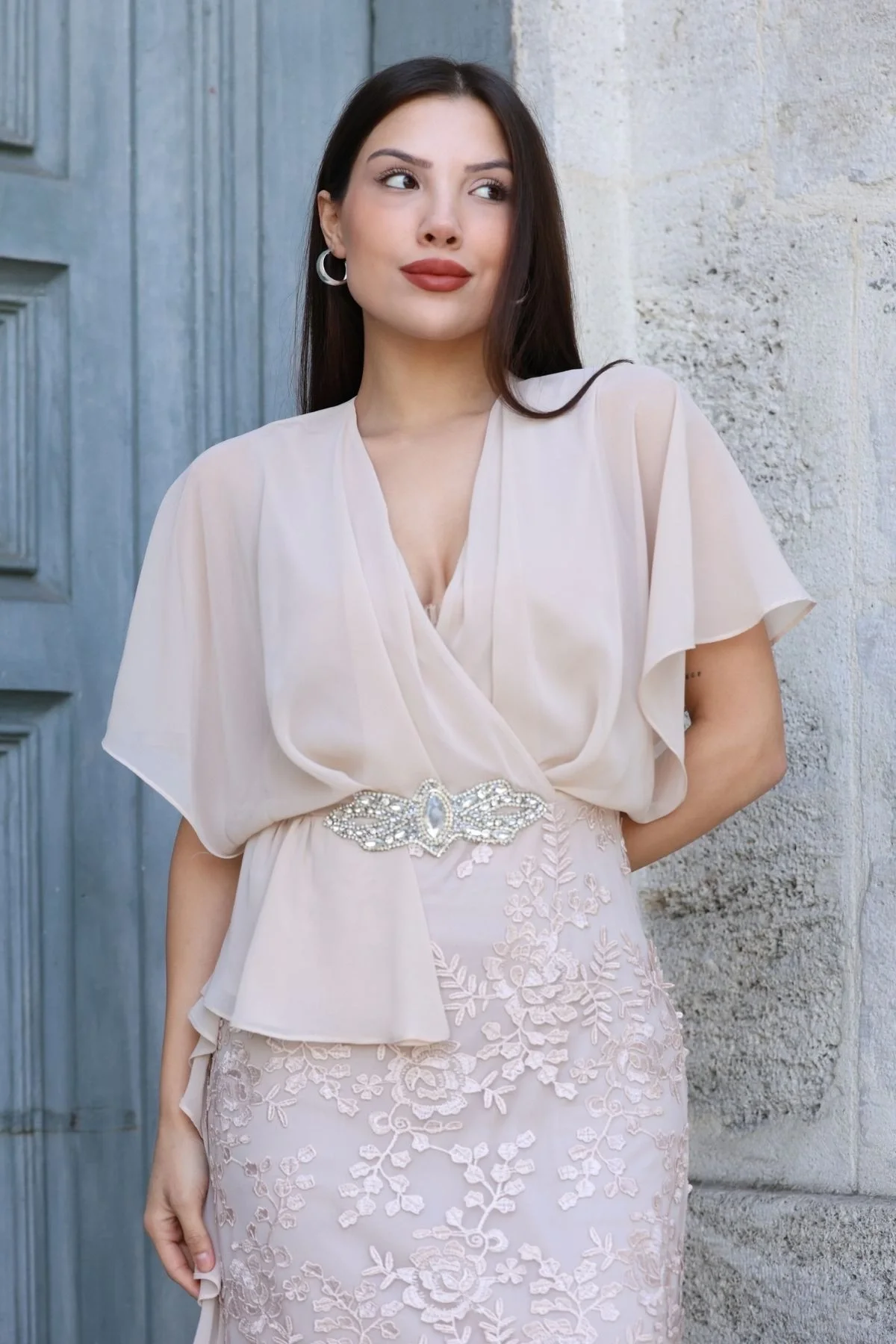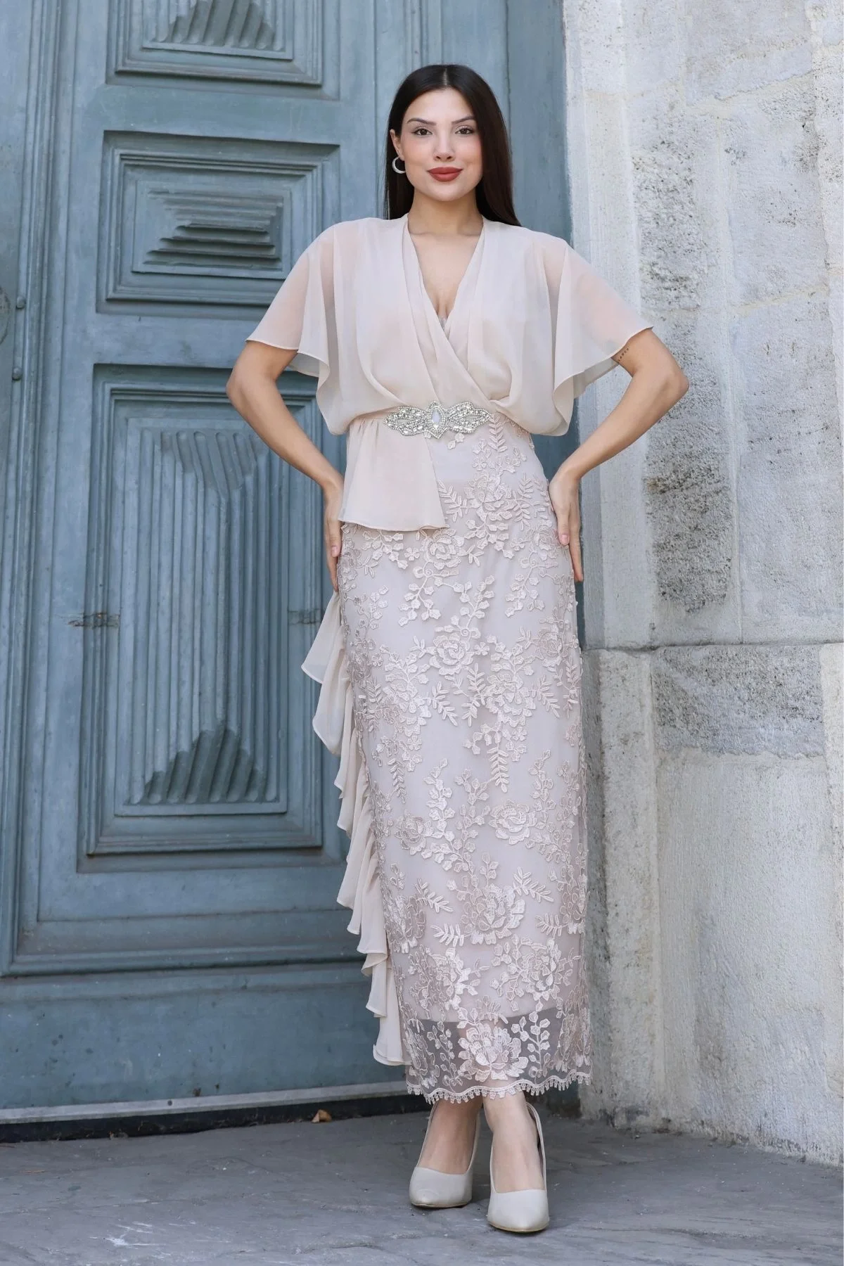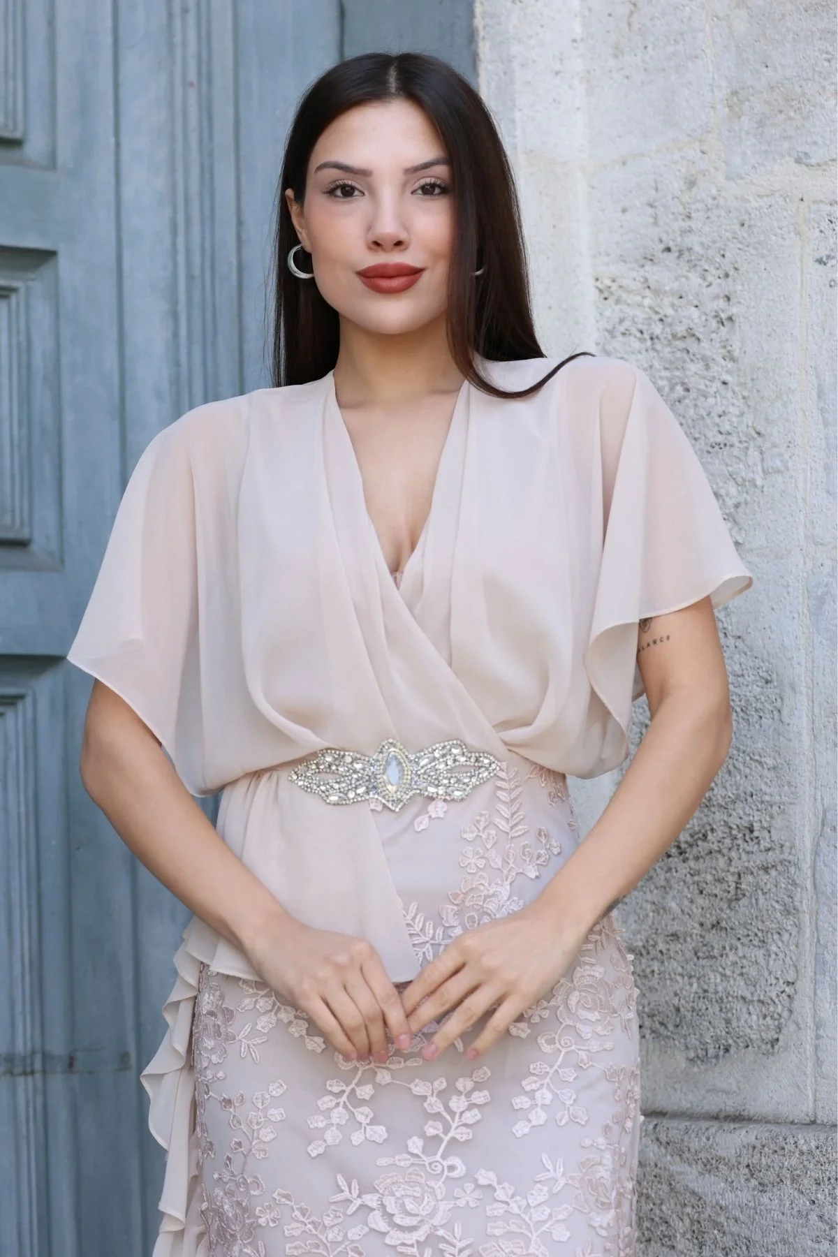 Kruvaze Yaka Şifon Dantel Kombinli Taş ve Fırfırlı Abiye Elbise 6051-Bej