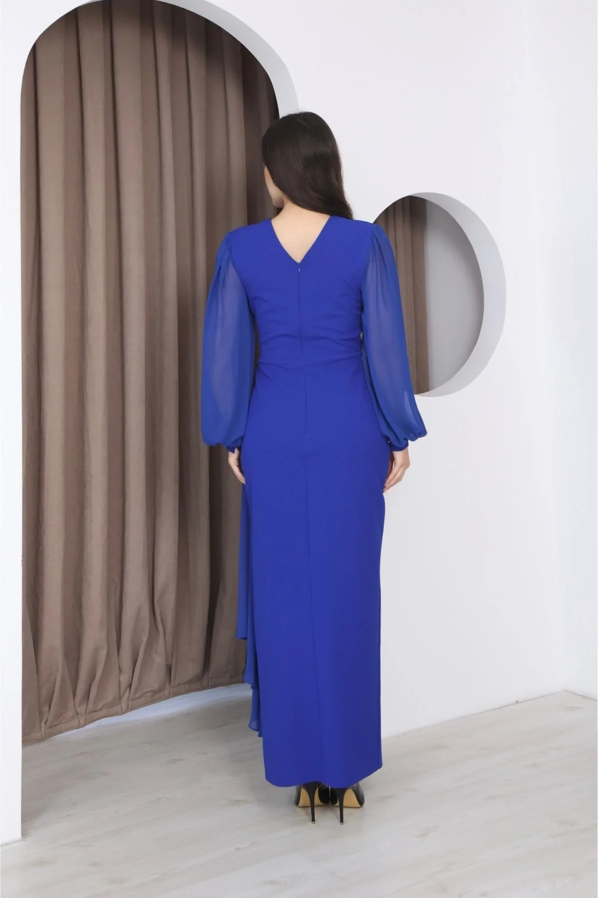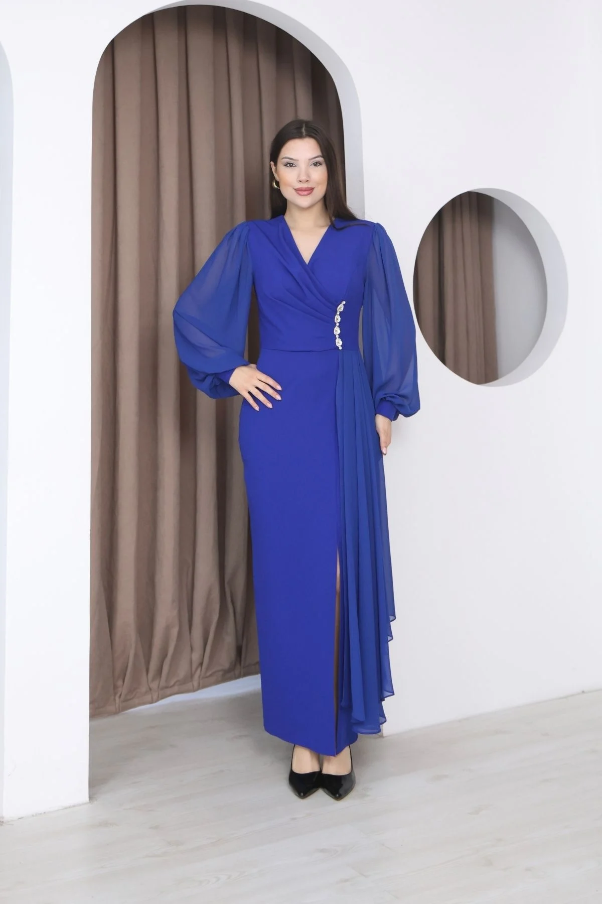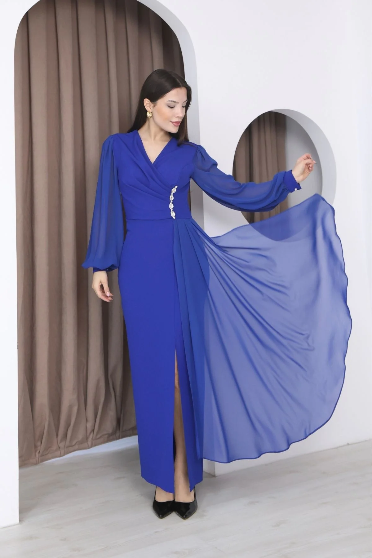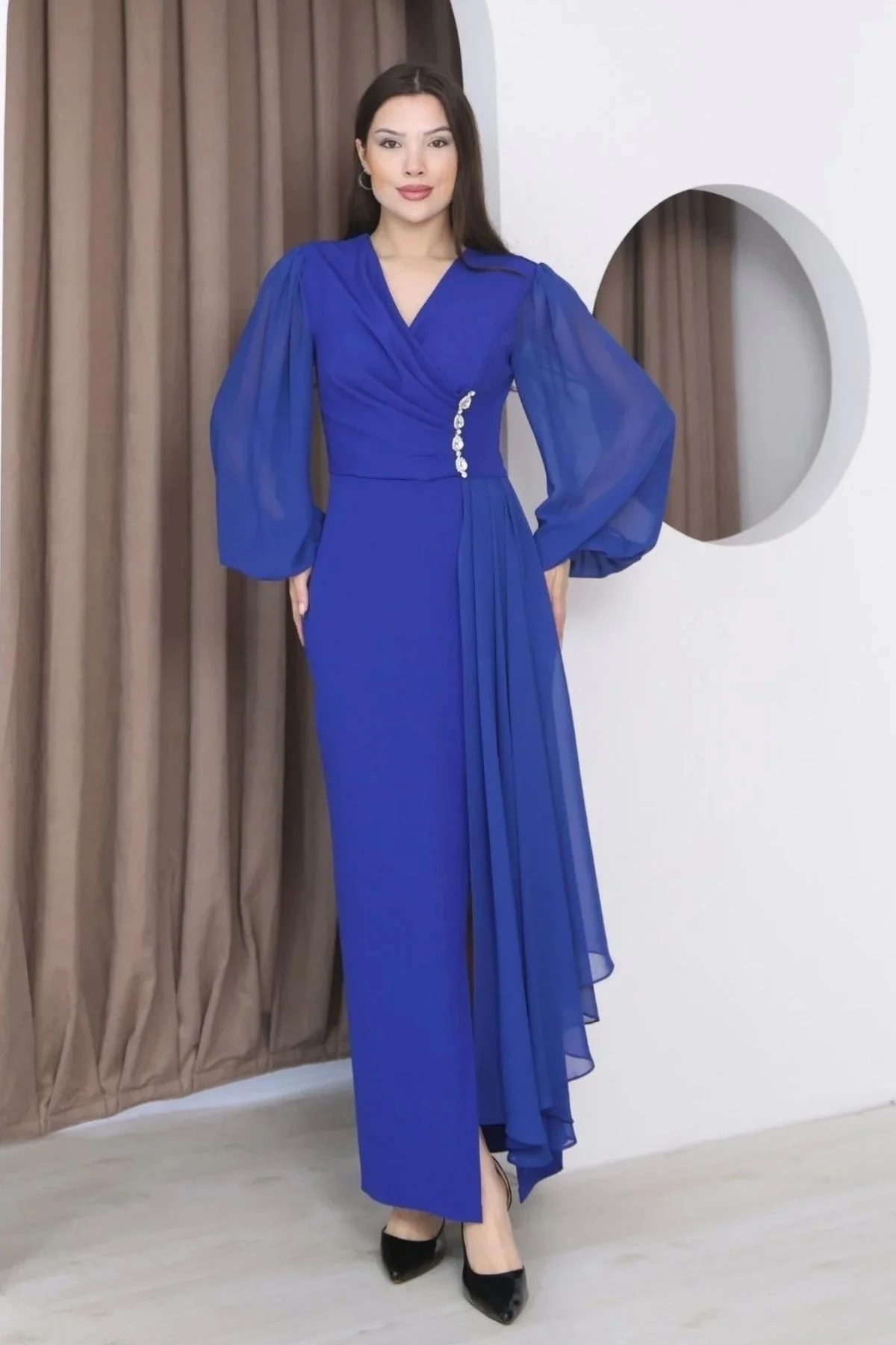 Kruvaze Yaka Şifon Kollu Bel Detaylı Pileli Uzun Abiye Elbise, zarif kruvaze yaka kesimi ve vücudu nazikçe saran formuyla dengeli ve şık bir görünüm sunar. Bel kısmındaki ince işçilikli detaylar bedeni toparlayarak daha düzgün bir duruş sağlar. Hafif ve dökümlü şifon kolları sayesinde hareketli ve akıcı bir etki kazandırır. Yürüdükçe şıklığı ön plana çıkarırken gün boyu rahat kullanım sunar.