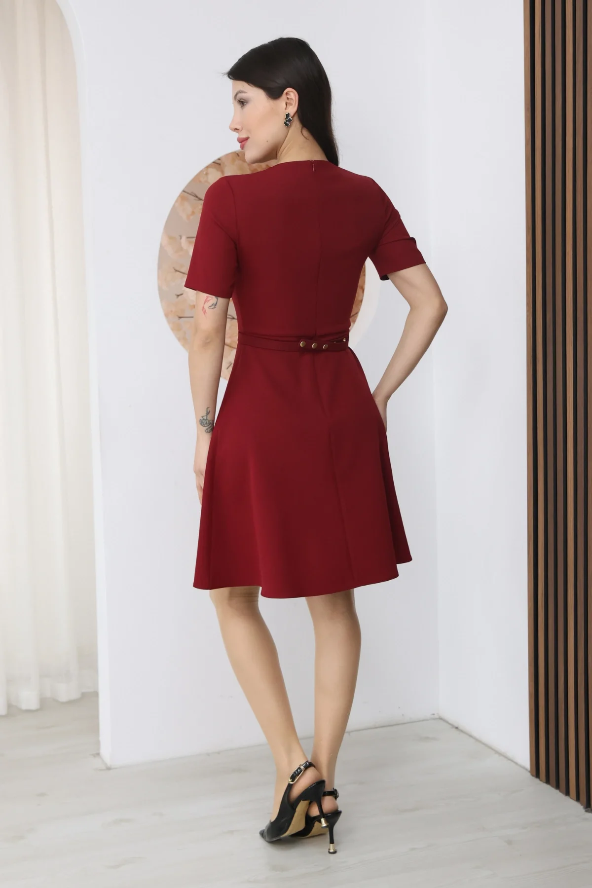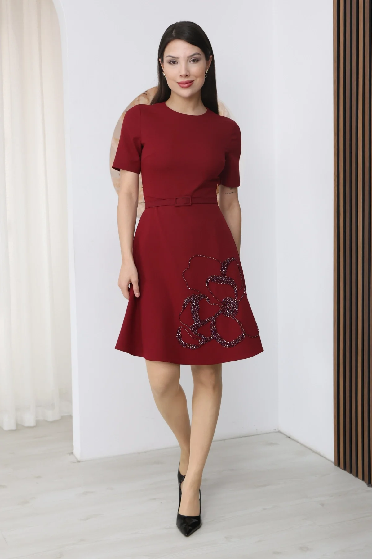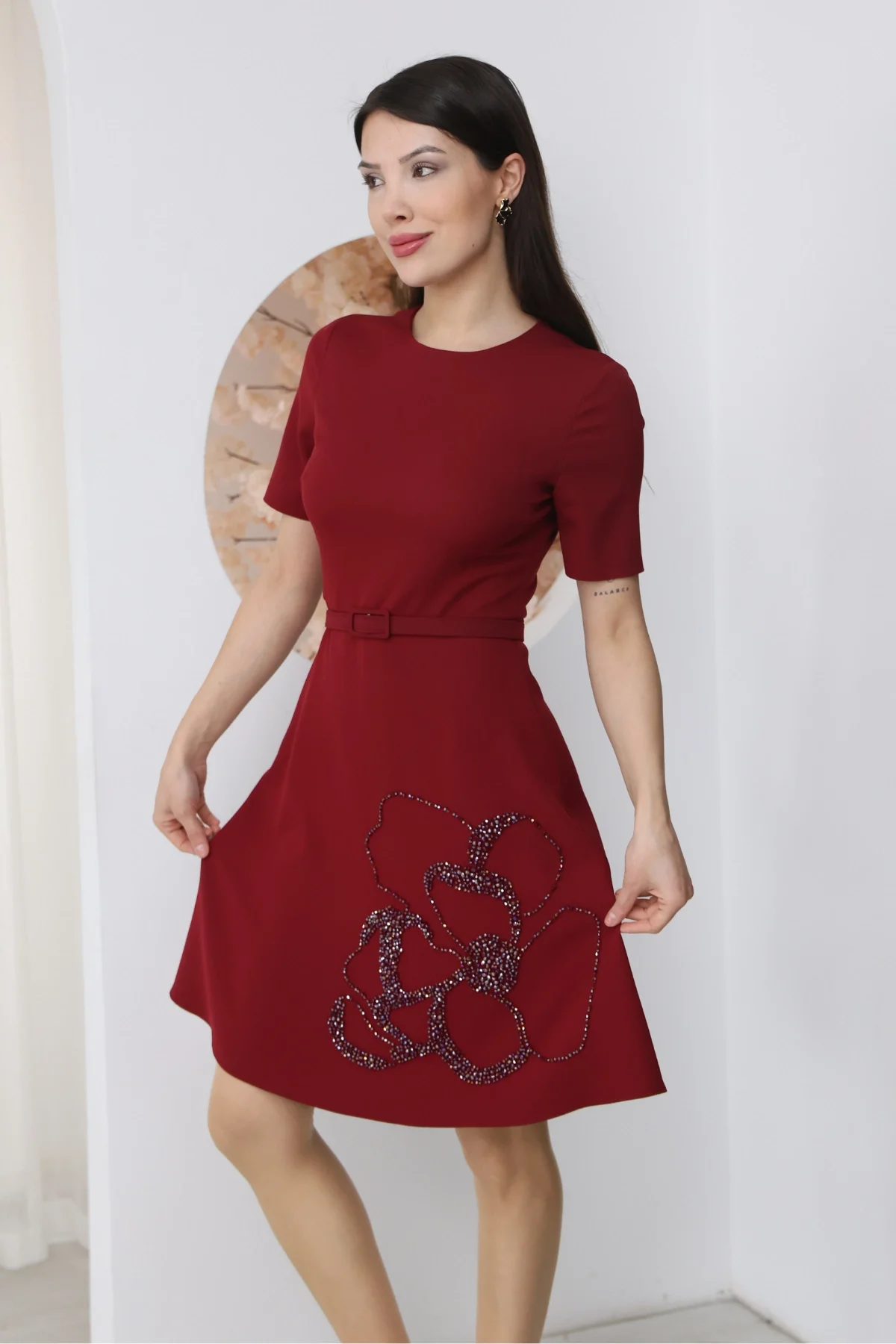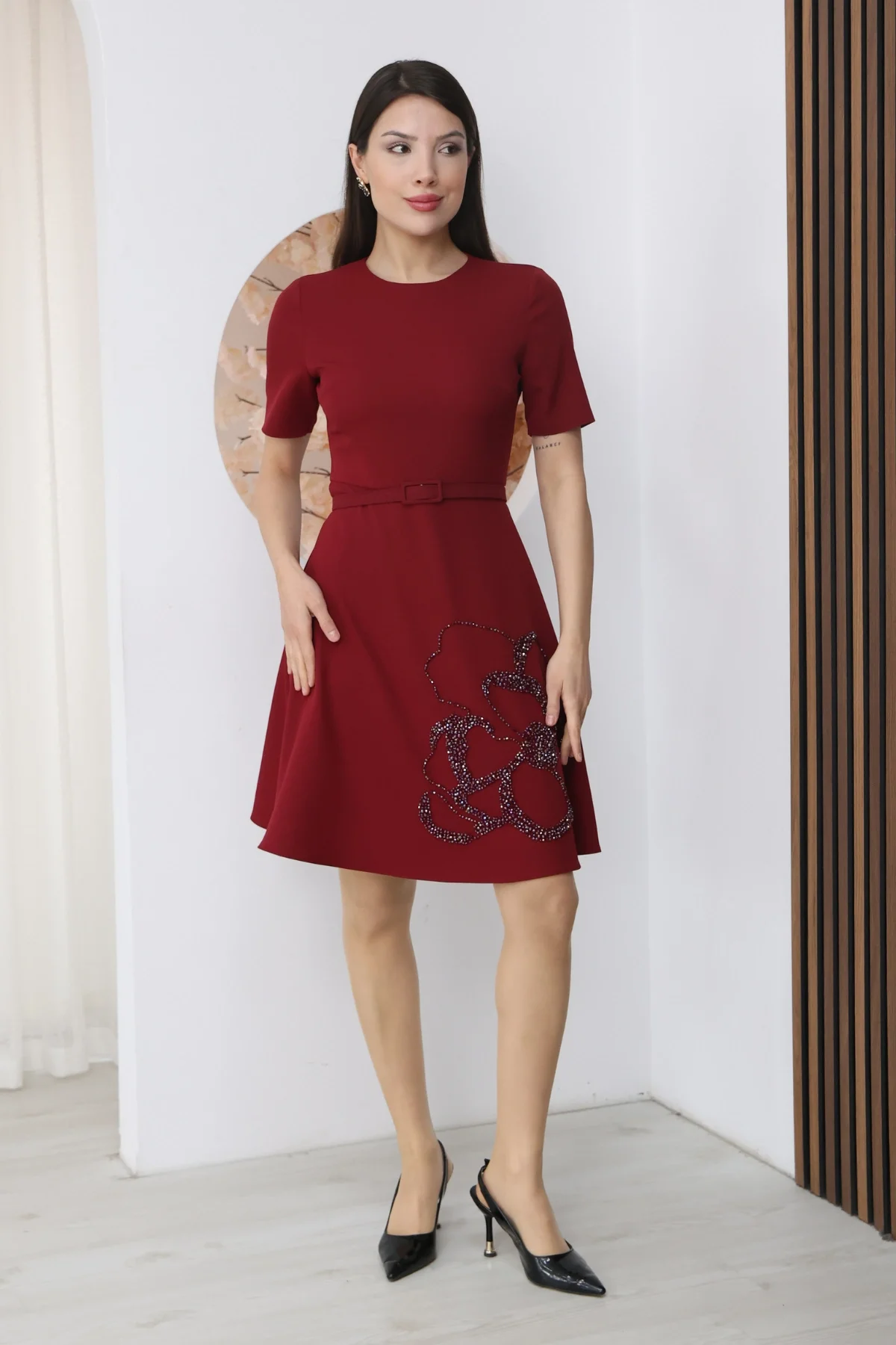 Nursel Ergin İşleme Detaylı Kemerli Elbise 6082-Bordo