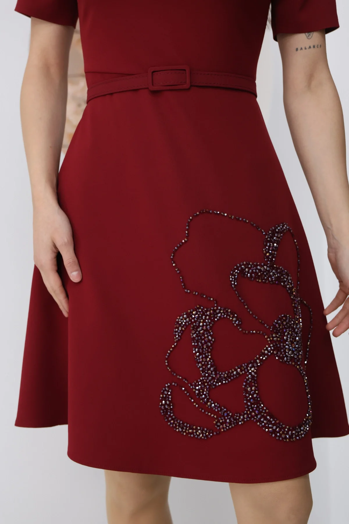 Zarif formu ve dikkat çekici el işçiliğiyle öne çıkan bu tasarım, pürüzsüz double face kumaşı sayesinde kusursuz ve tok bir duruş sunar. Etek kısmındaki el işlemesi boncuk detay, tasarıma ışıltılı ve özgün bir karakter kazandırırken, beldeki kemer silüeti dengeli ve feminen bir şekilde vurgular.