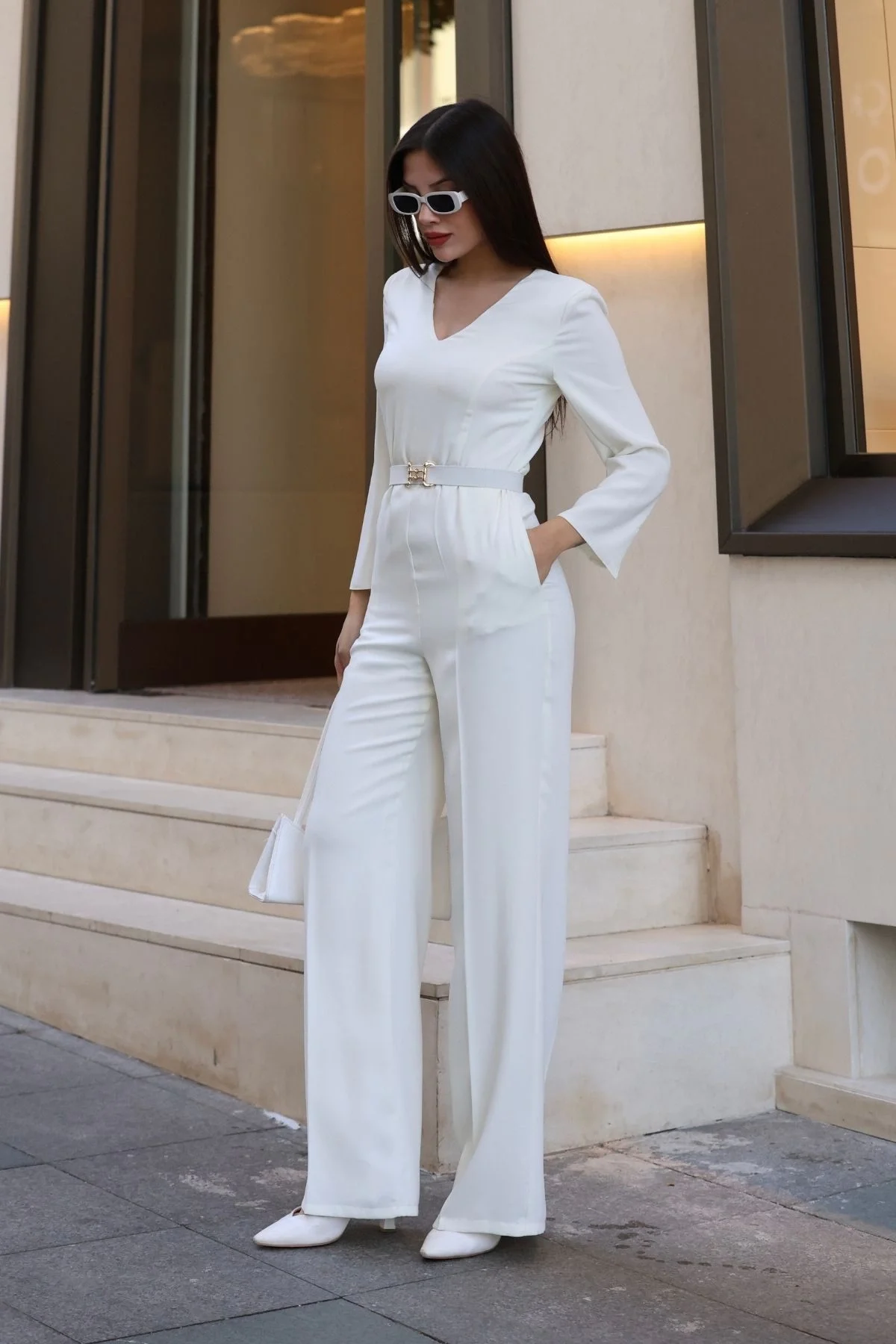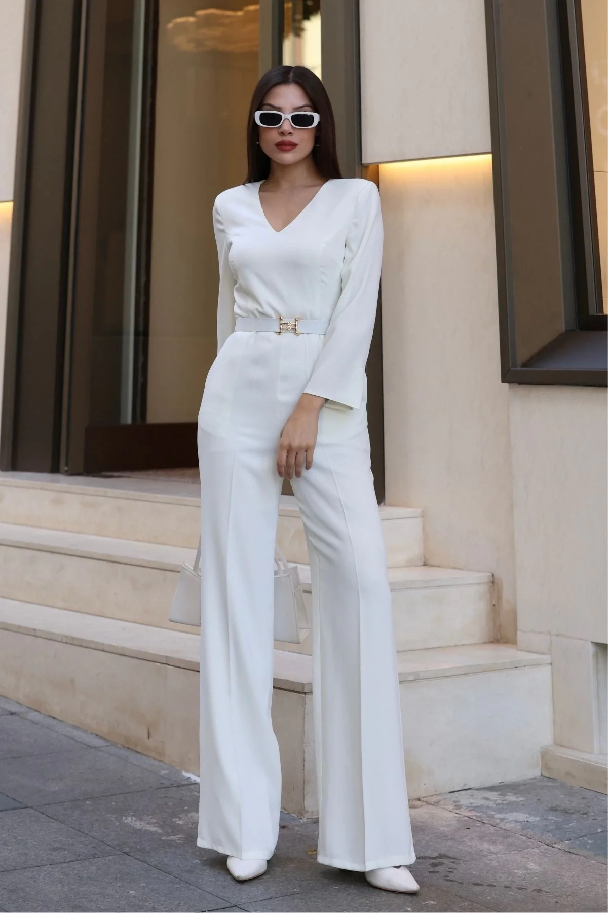 -V yaka kesimi boynunuzu uzatır, uzun ve zarif kolları modern bir dokunuş sunar. Yüksek bel ve geniş paça (palazzo) kesimi