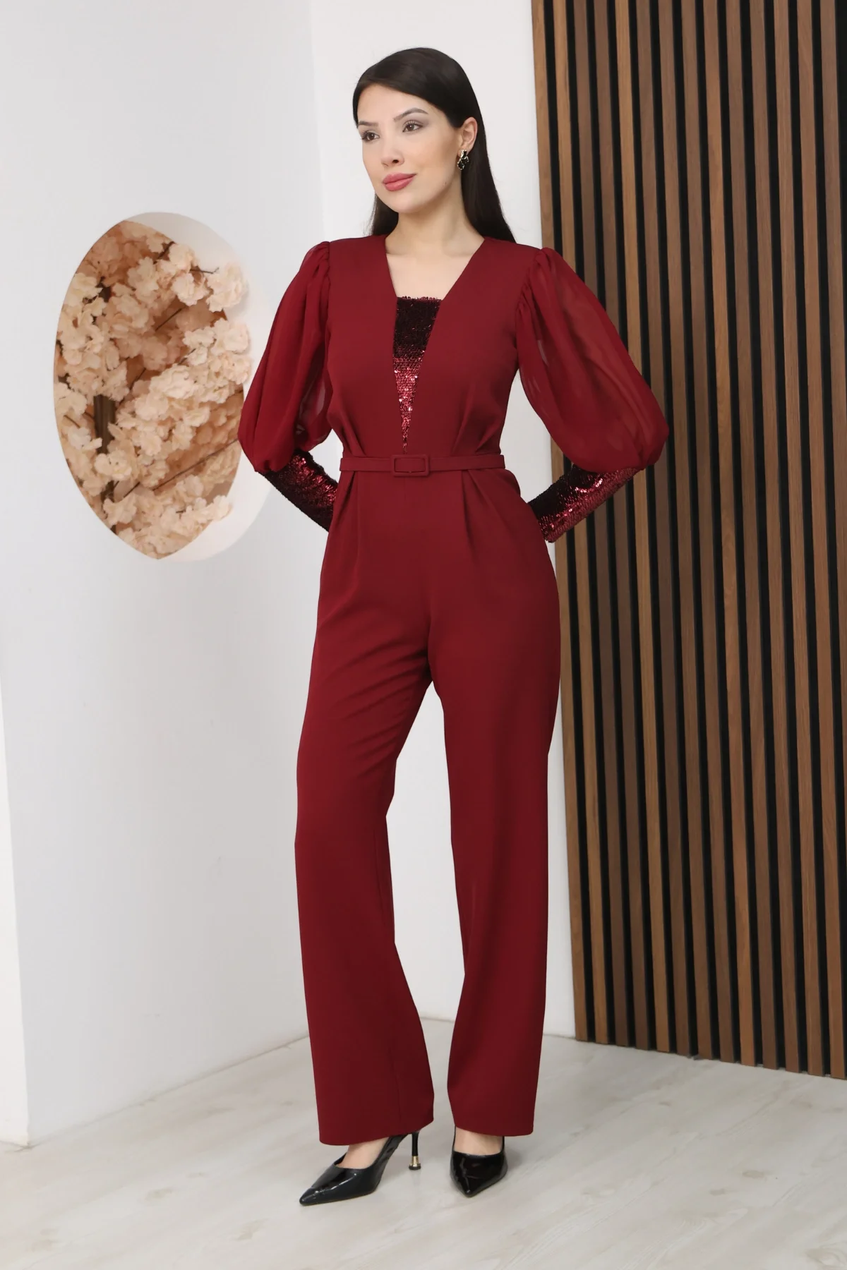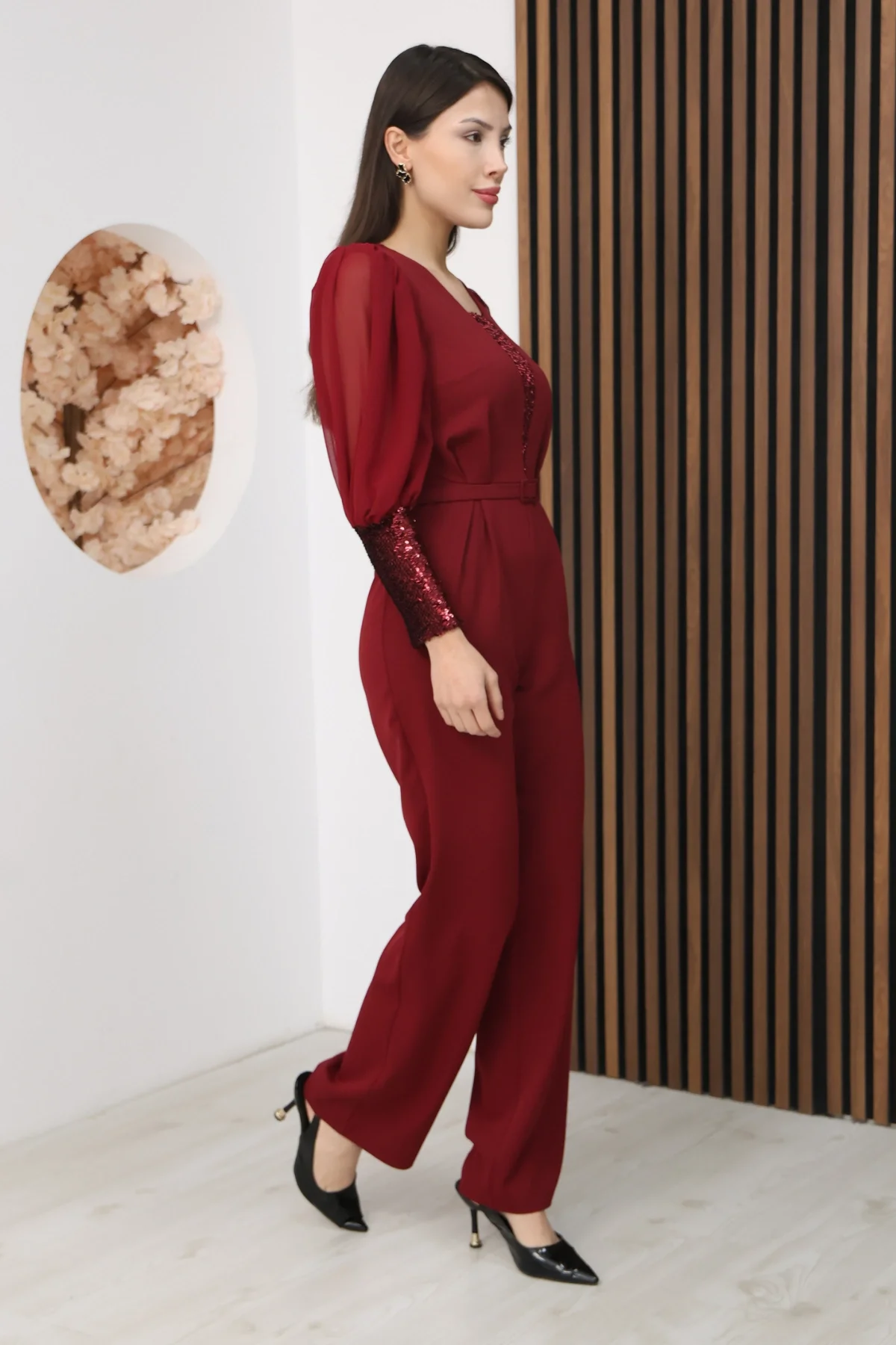 Nursel Ergin Payet Detaylı Abiye Tulum 6056-Bordo