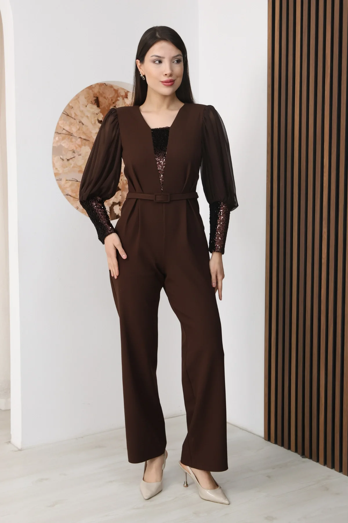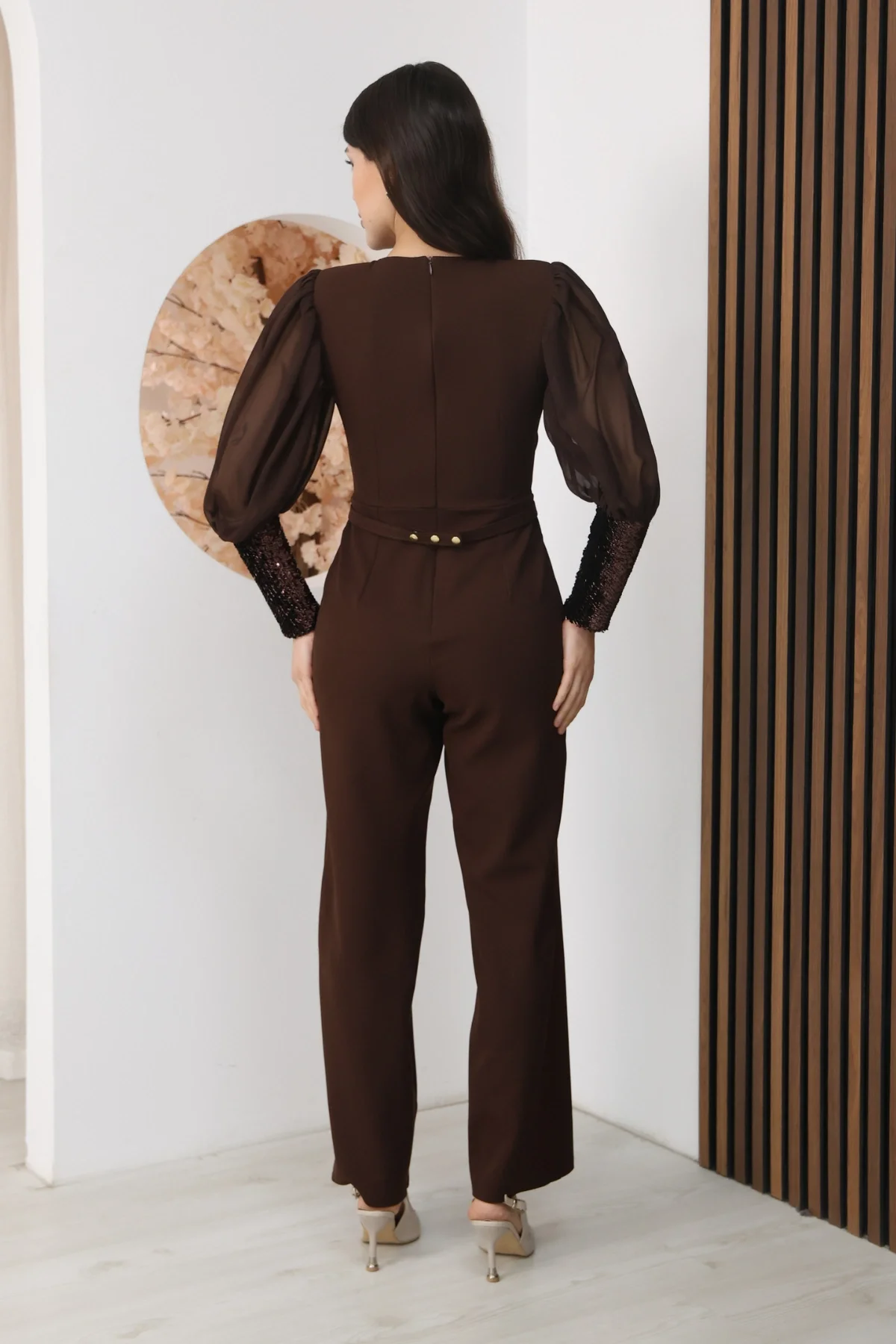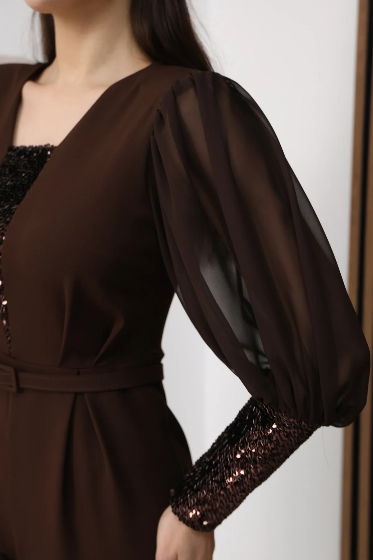 Zarif ve güçlü duruşu bir araya getiren bu tasarım, tok yapılı double face kumaşı ile kusursuz bir siluet sunar. Şifon kollar ve kol uçlarındaki payet detaylar, tuluma ışıltılı ve dikkat çekici bir hareket katarken, modern kesimiyle feminen ve iddialı bir görünüm oluşturur.