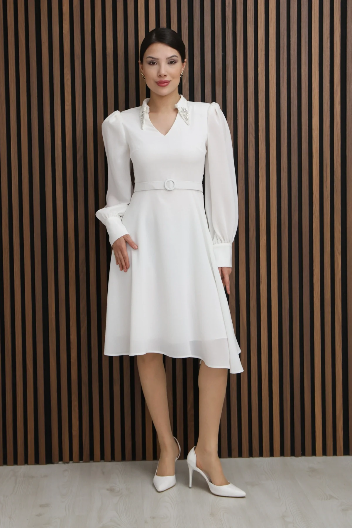 Nursel Ergin Yaka İşlemeli Asimetrik Kesim Elbise 6080-Beyaz
