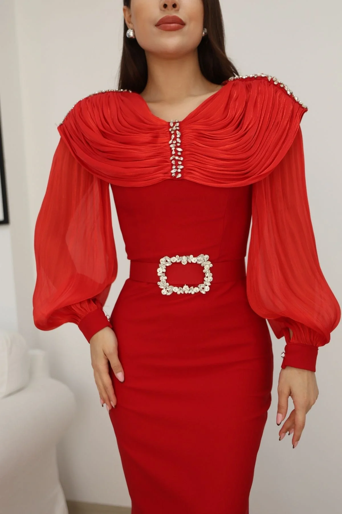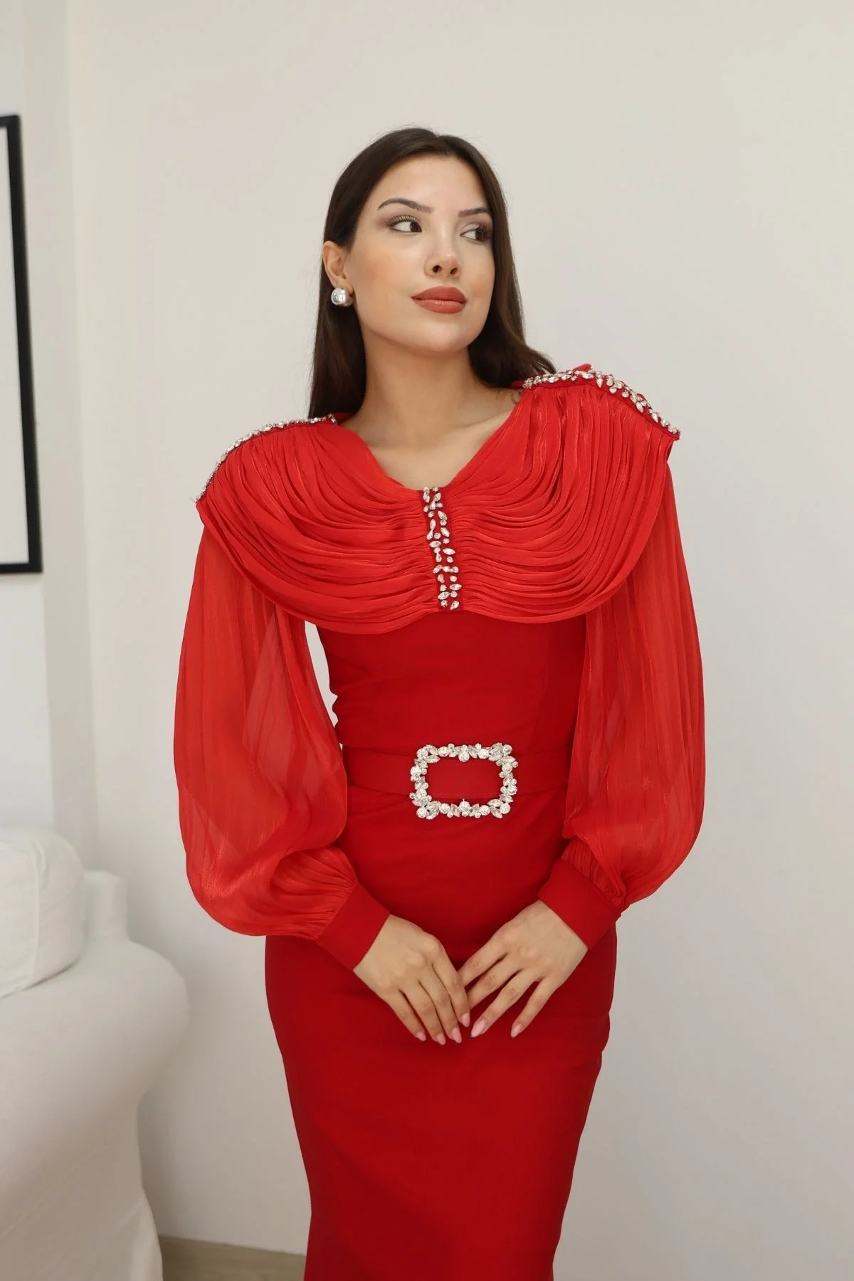 Omuz Drapeli Abiye Elbise 2314-Kırmızı