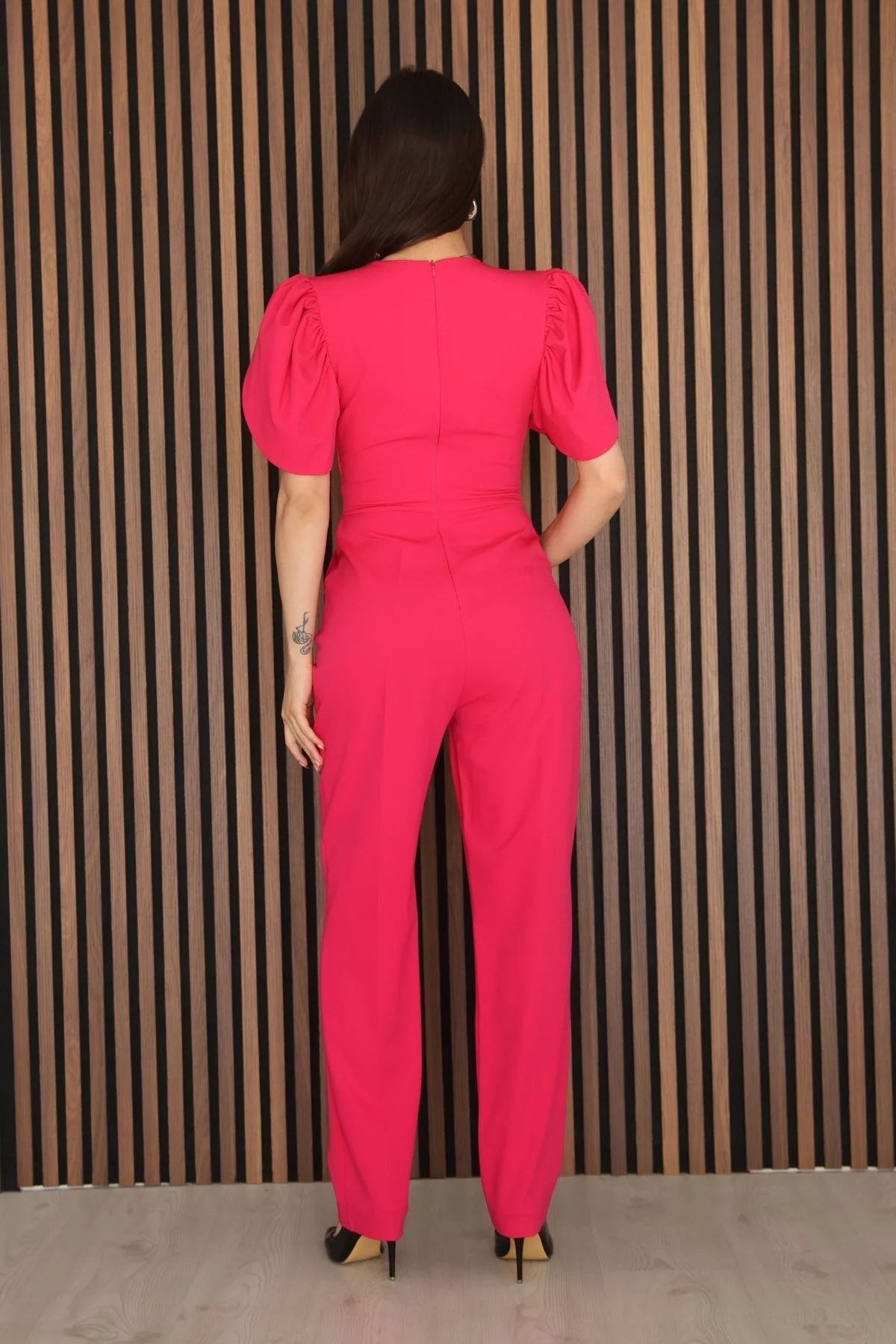 Pile ve Taş Detaylı V Yaka Tulum 2190-Fuşya