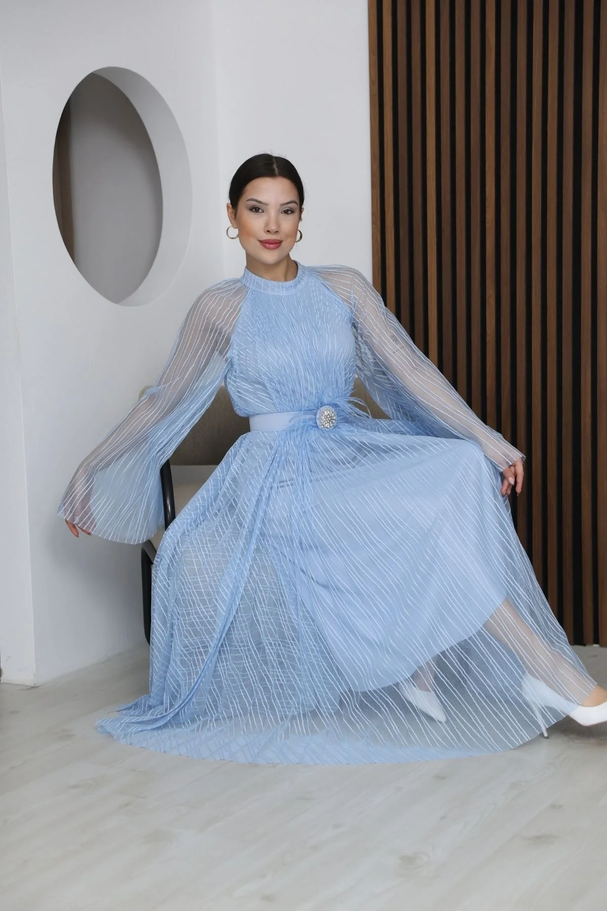 Pilise Detaylı Kemerli Rahat Form Tül Elbise ile Davetlerde tüm gözleri üzerinize çekmeye hazır olun. Her adımınızda hayranlık uyandıran, zarafeti hissedeceğiniz bir elbise. Beden astarlı yapısıyla konforlu bir kullanım sunarken, uçuş uçuş, geniş yarasa kolları hareketinize zariflik katar.