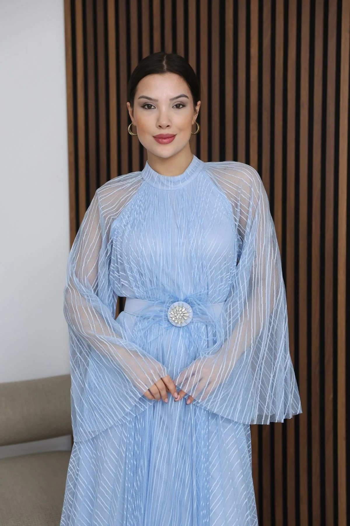 Pilise Detaylı Kemerli Rahat Form Tül Elbise 2305-Bebe Mavisi