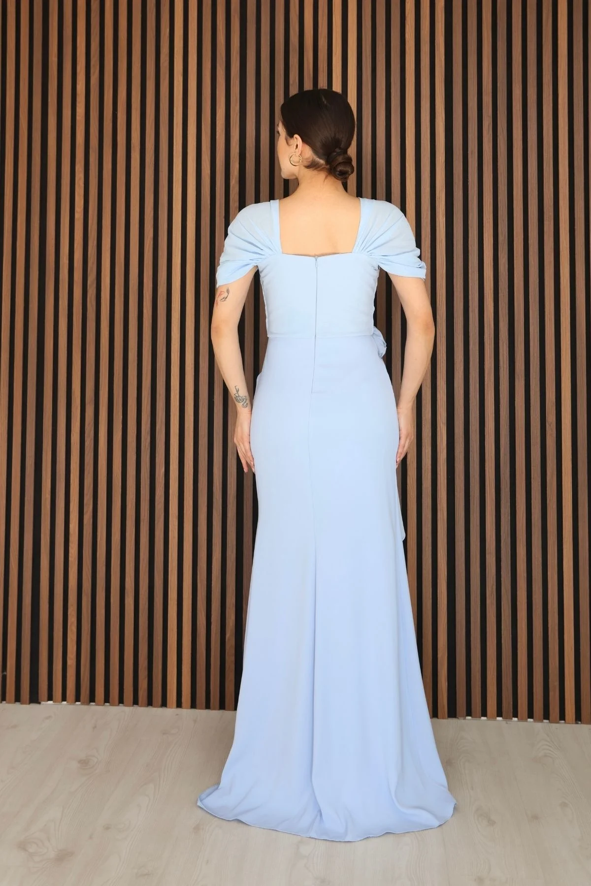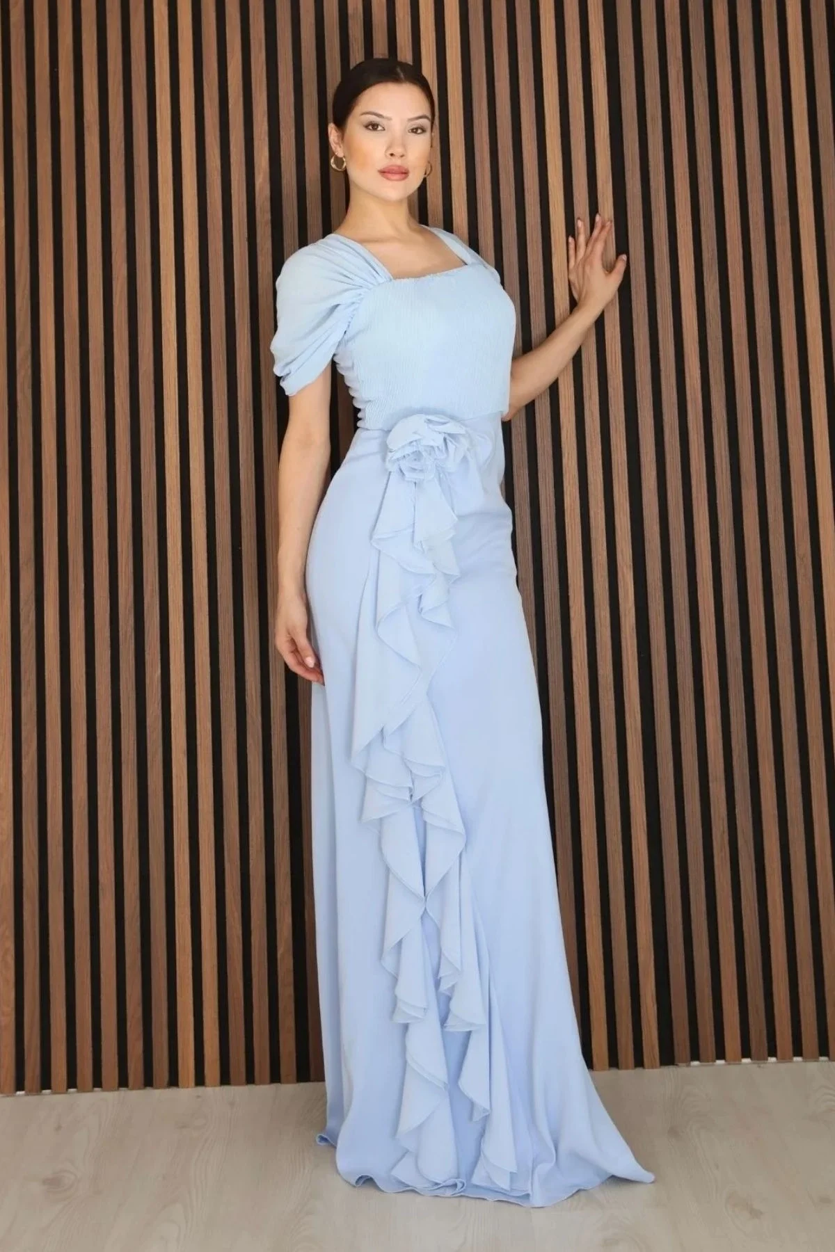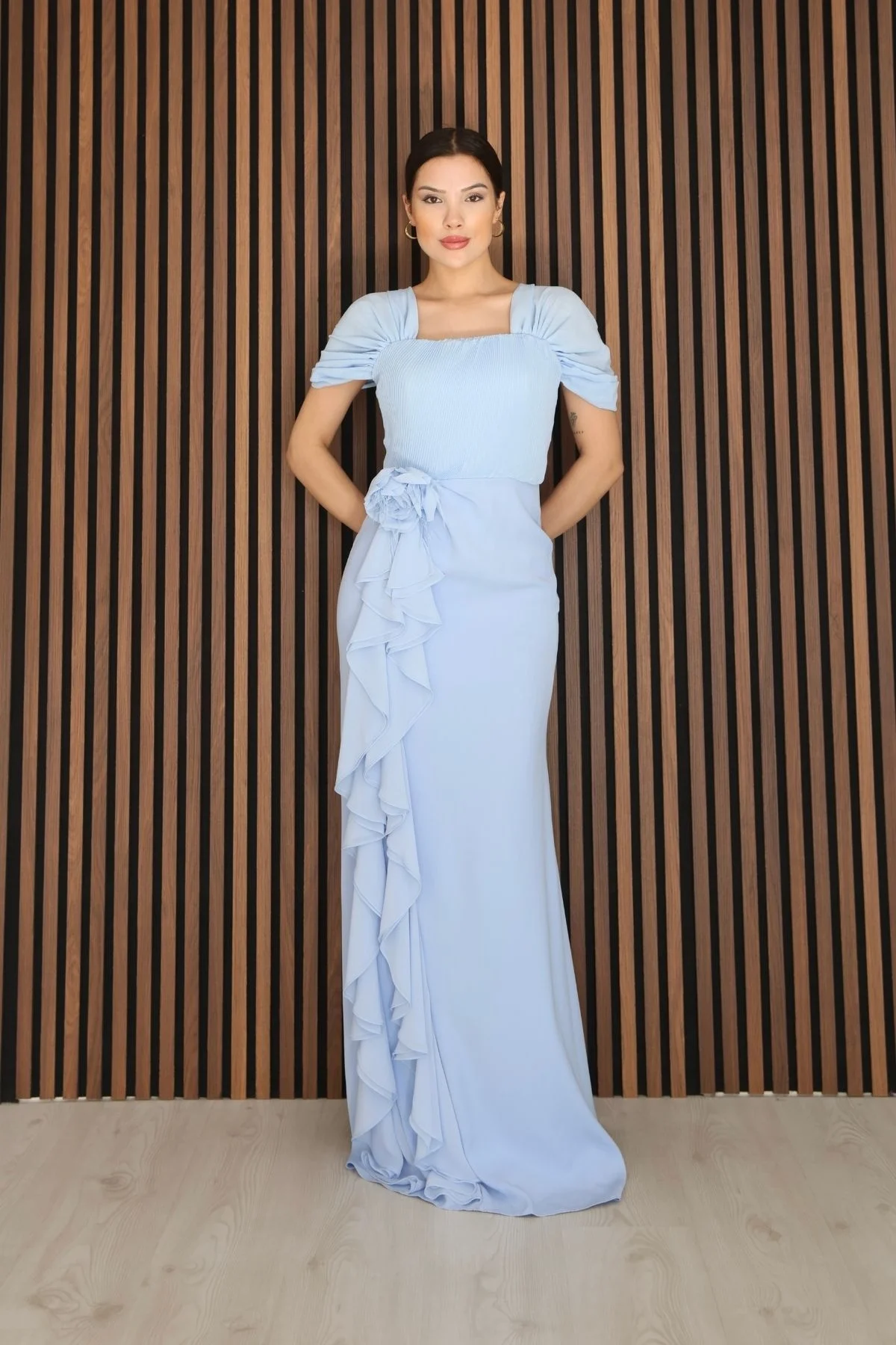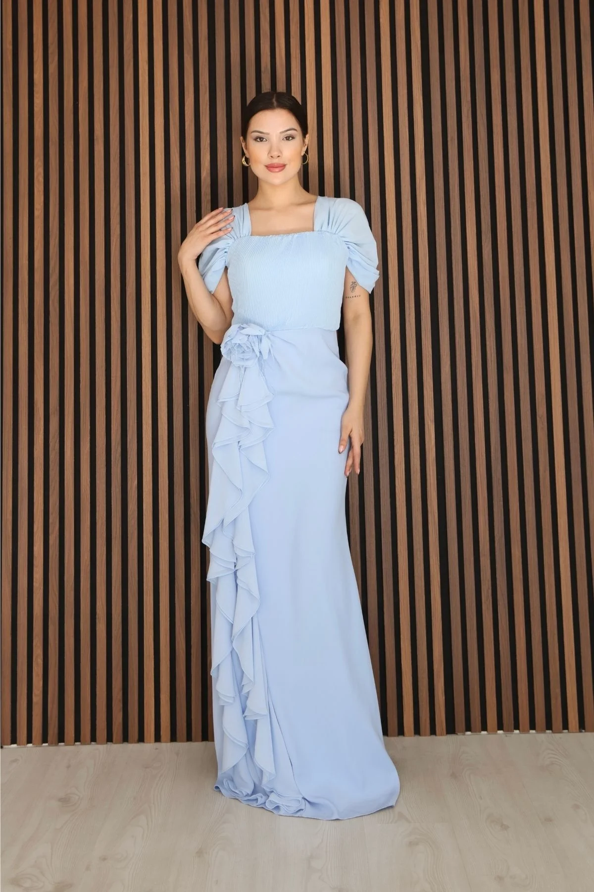 Piliseli ve Şifon Detaylı Uzun Abiye Elbise 2391-Bebe Mavisi